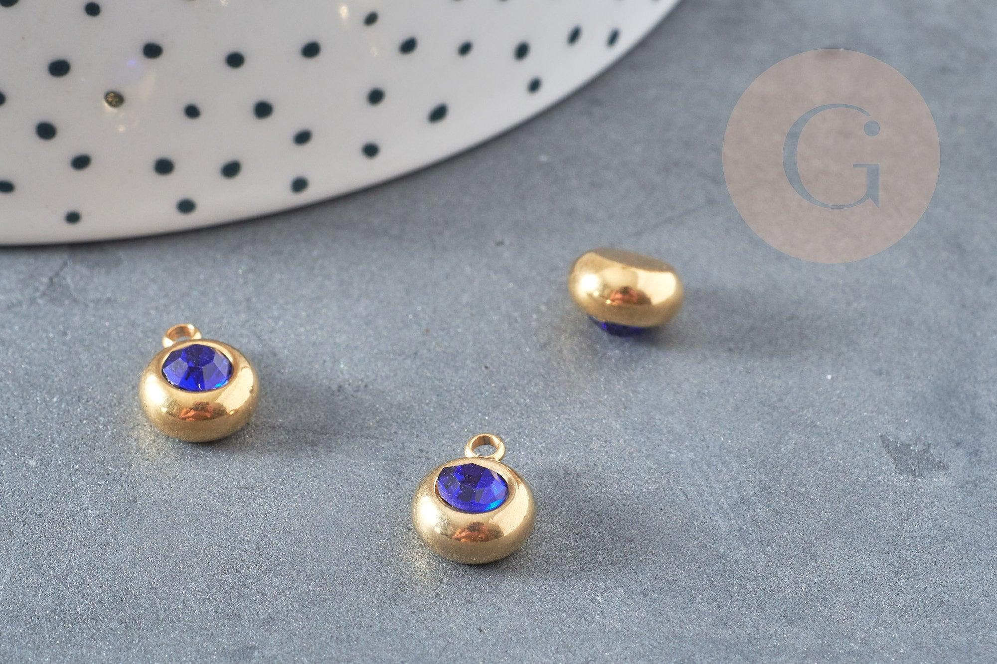 Round pendant in 24 carat gold-plated steel with blue crystal, crystal pendant, gold-plated crystal pendant, jewelry creation, 12mm, unit