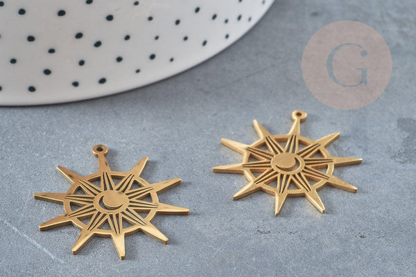 Gold-plated steel sun pendant 33.5mm, gold-plated stainless steel charm, nickel-free pendant, jewelry creation, x1 G6141