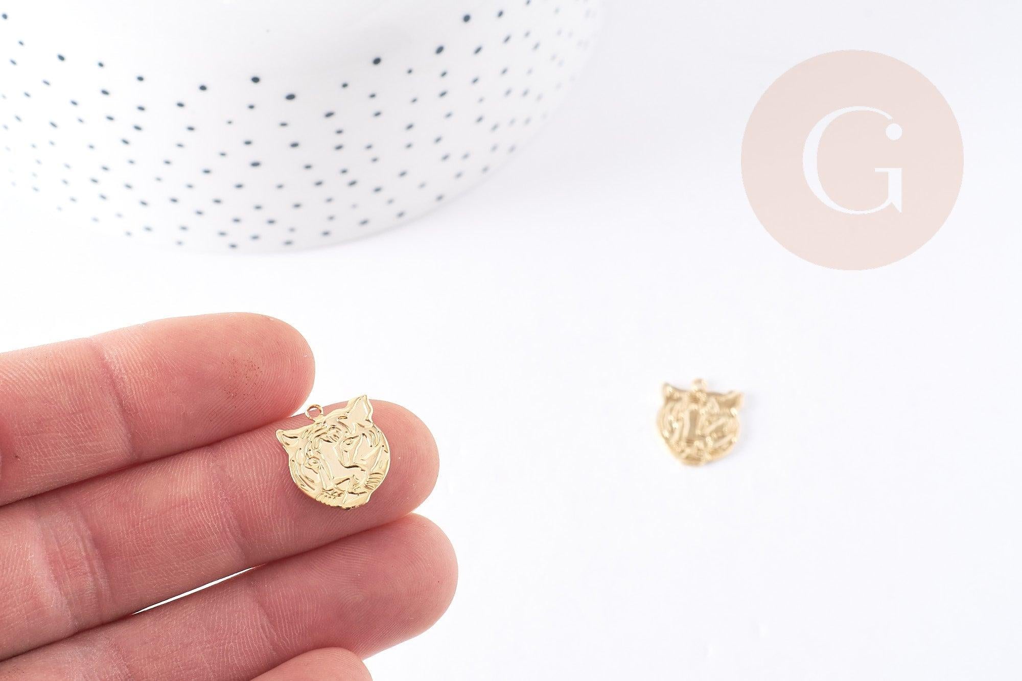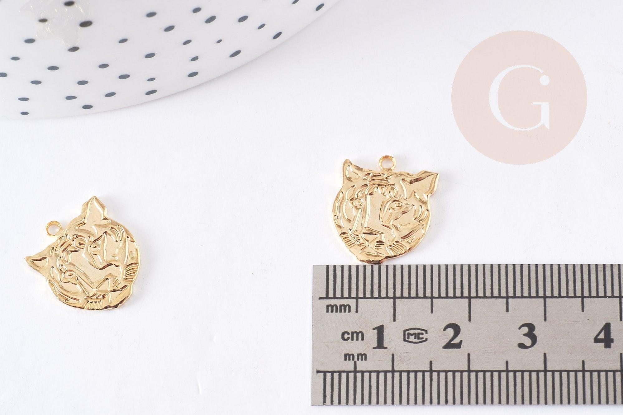 A golden brass tiger head pendant , ideal for creating a necklace or earrings on the theme of felines, the jungle, animals.