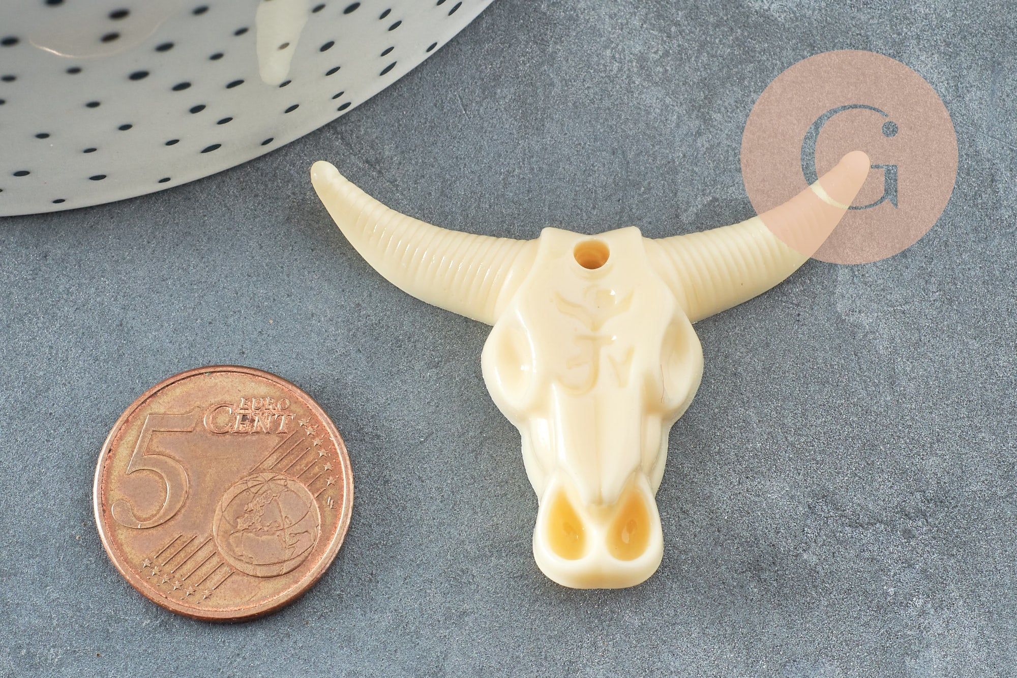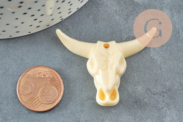 pendant in imitation horn (resin) tinted white on the theme of the wild west, representing a cow's head skull