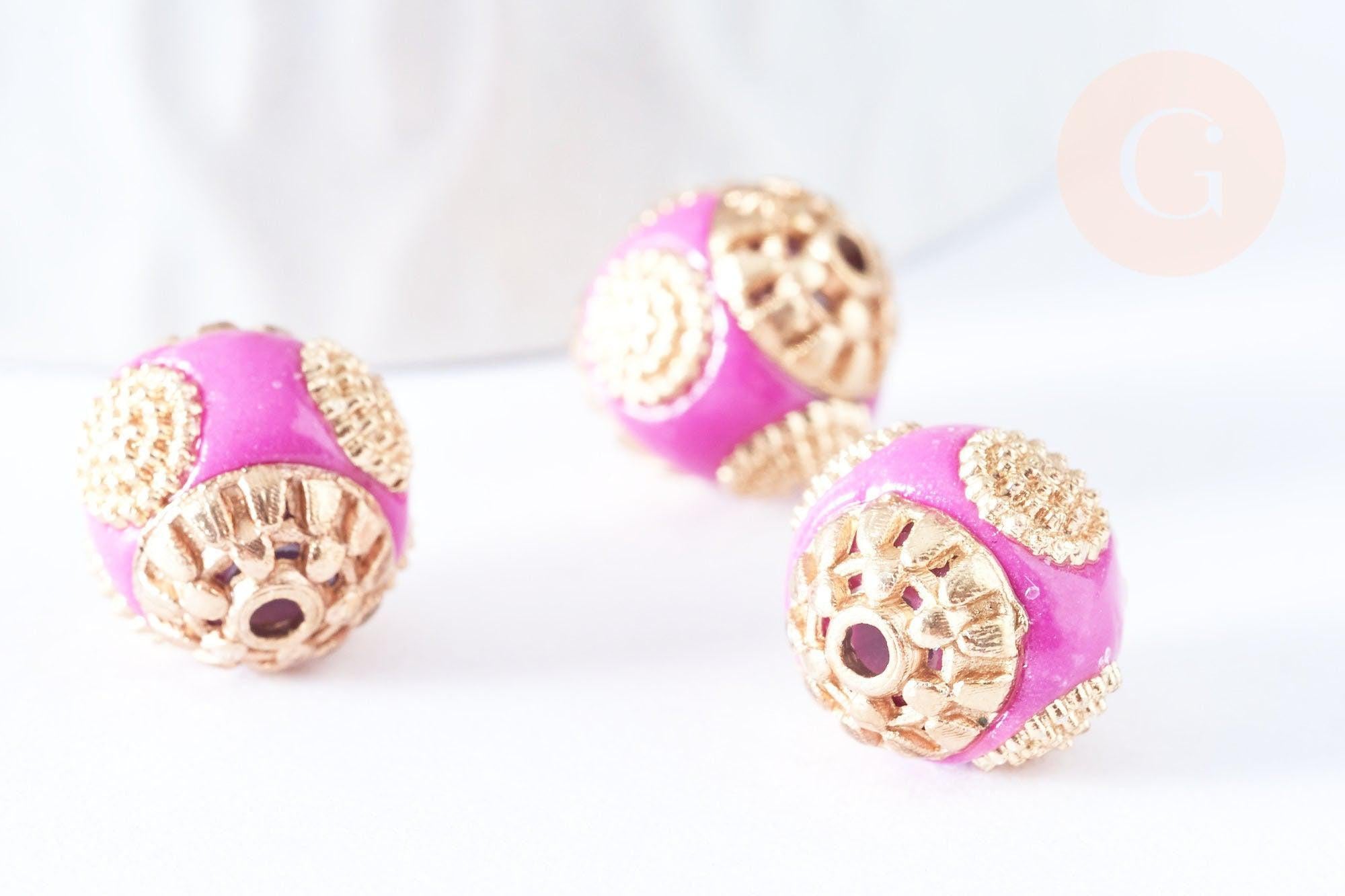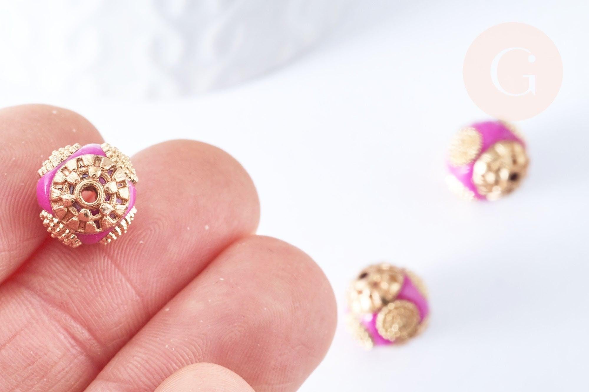 Perle indonesienne polymère rose fuchsia strass et zamac doré 12mm, ethnique exotique, x1 (G6571)