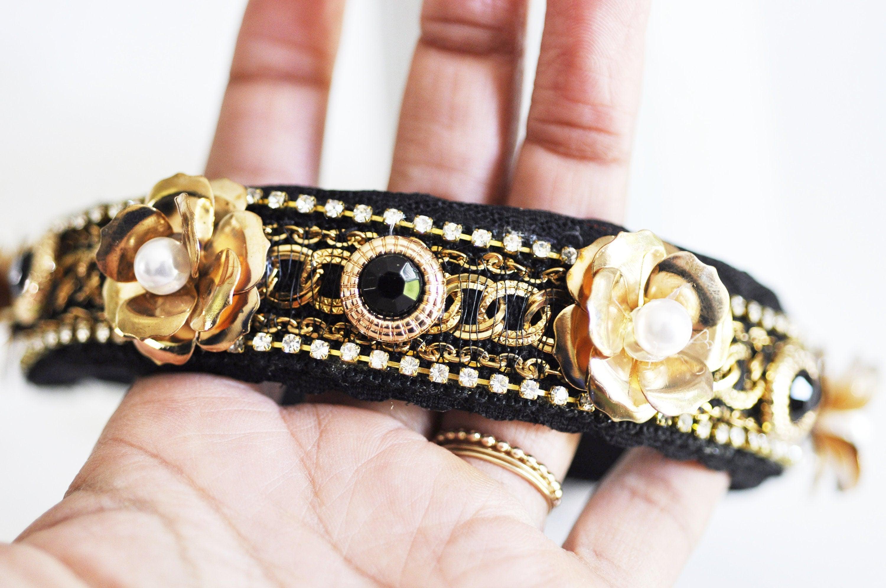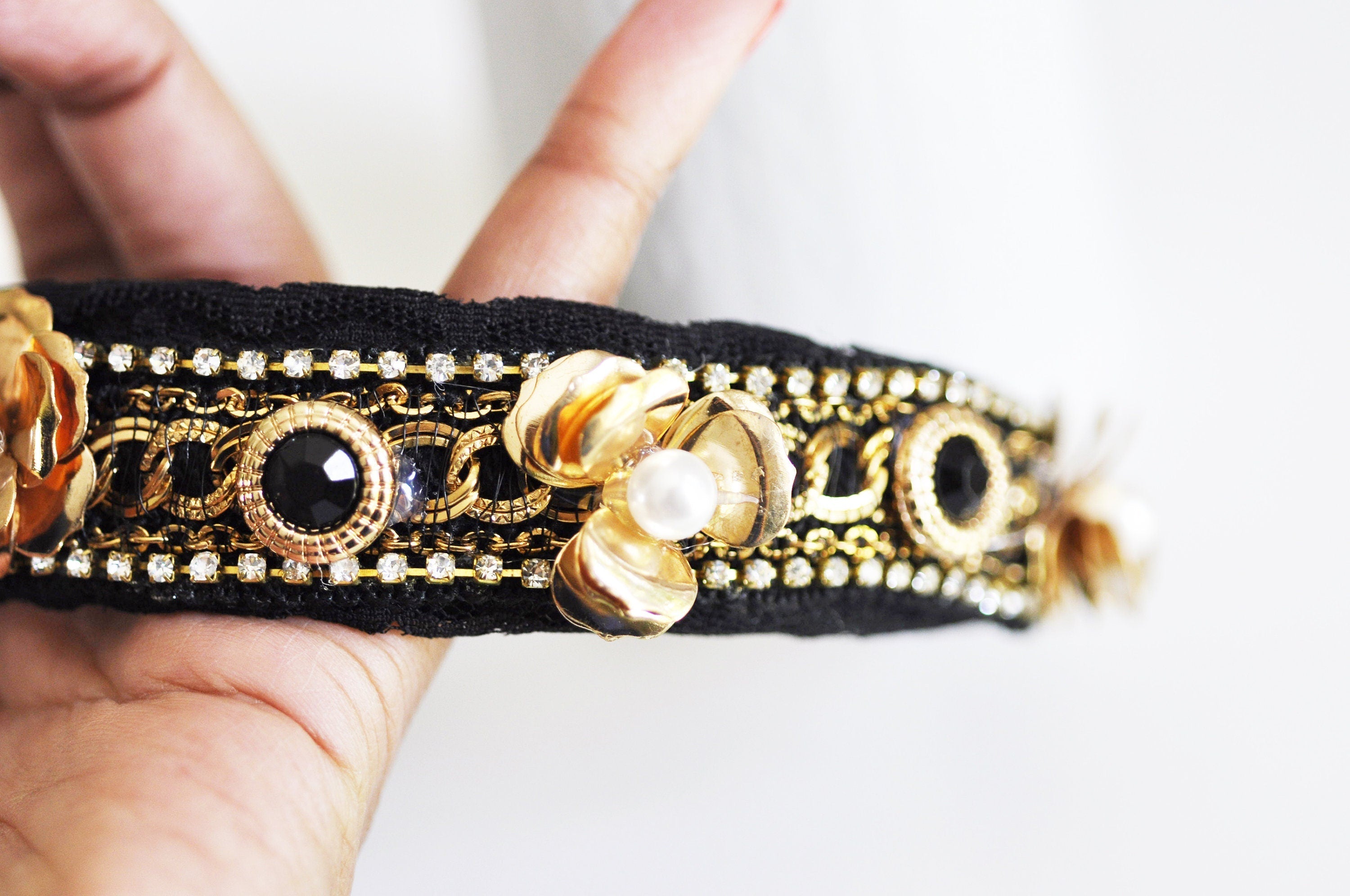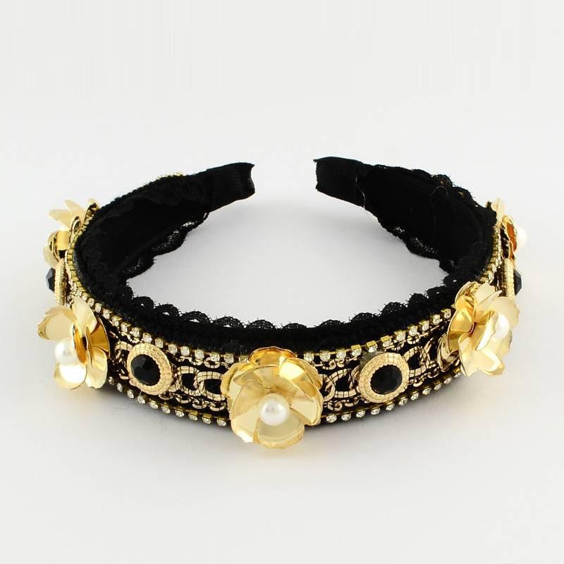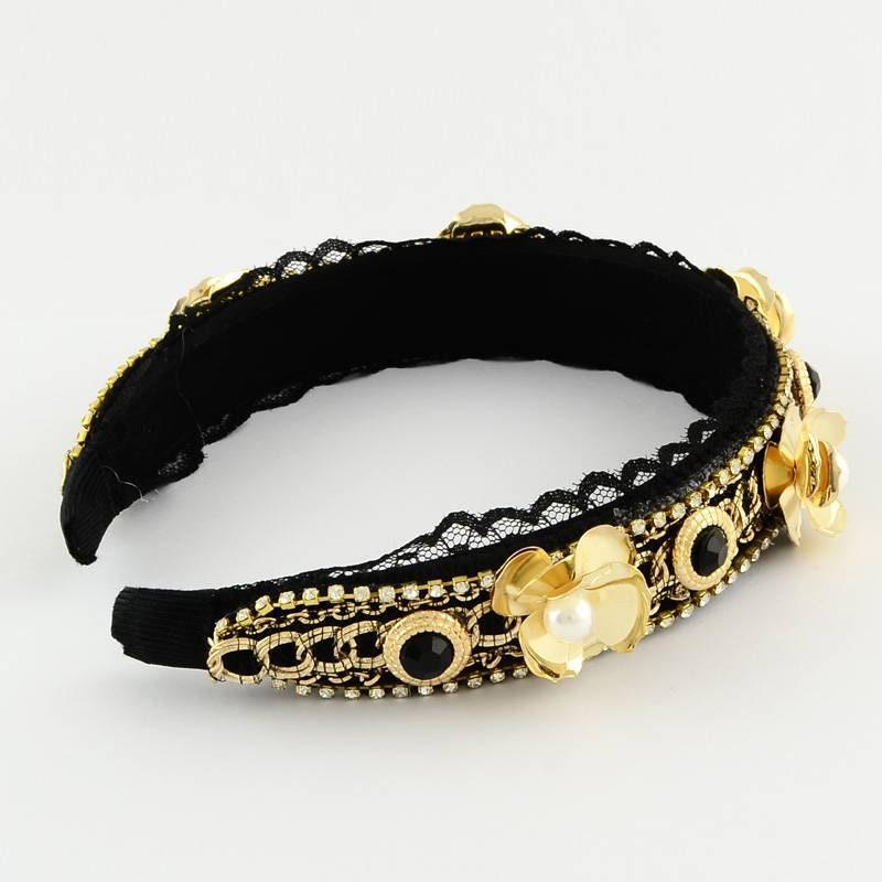 Gold rhinestone pearl medal hair headband, hair accessories, hair clips, wedding accessories, hair decoration, 115mm A plastic hair band covered in black fabric and decorated with gold medals and pearls, embroidery and lace to adopt immediately for a dressy outfit....
