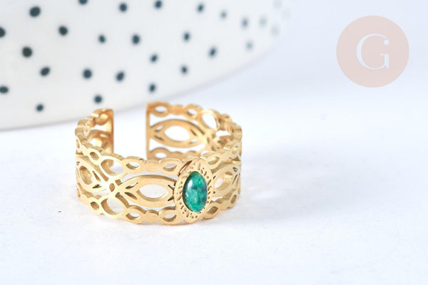 A very beautiful gold-plated steel chain ring, adjustable and decorated with a synthetic malachite stone on a lace stainless steel support. A timeless and very chic jewel, which will accompany you every day.