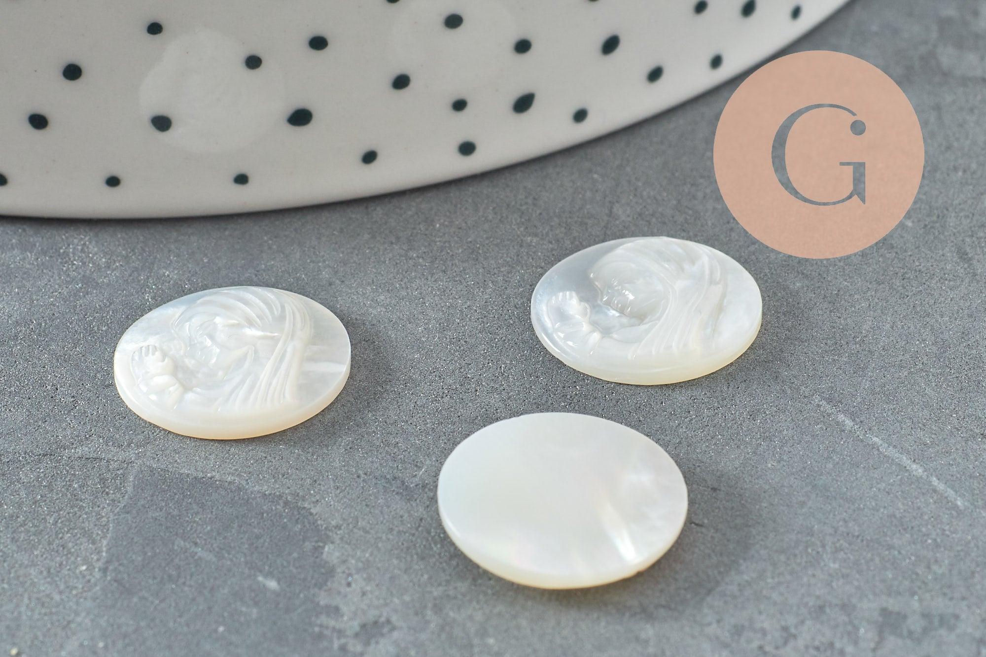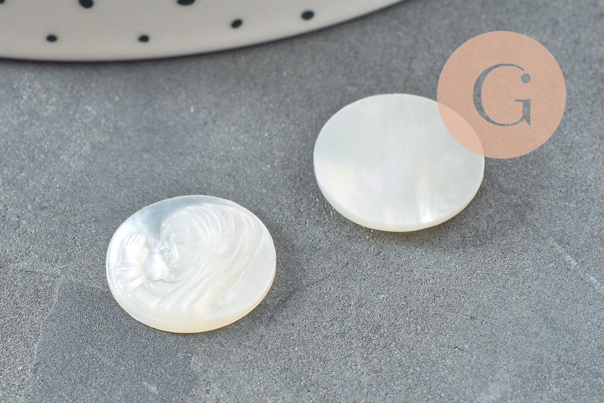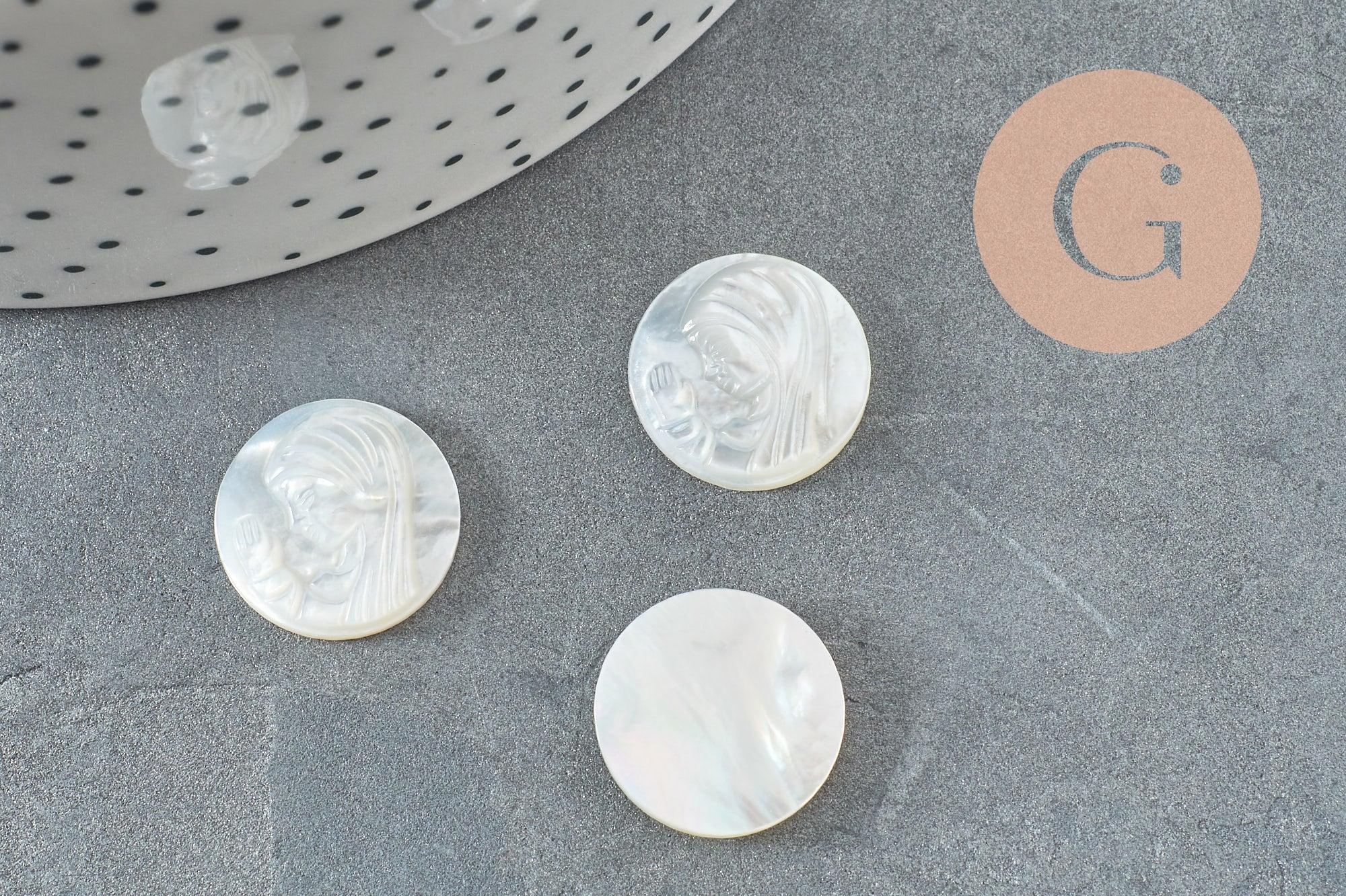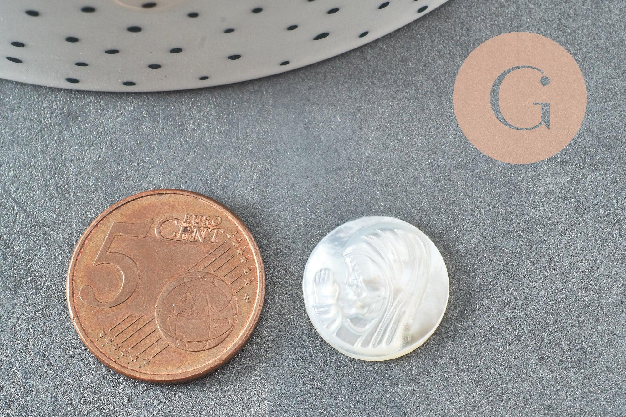 Cabochon rond Vierge Marie nacre blanche naturelle gravé 16mm, x1 (G9629)