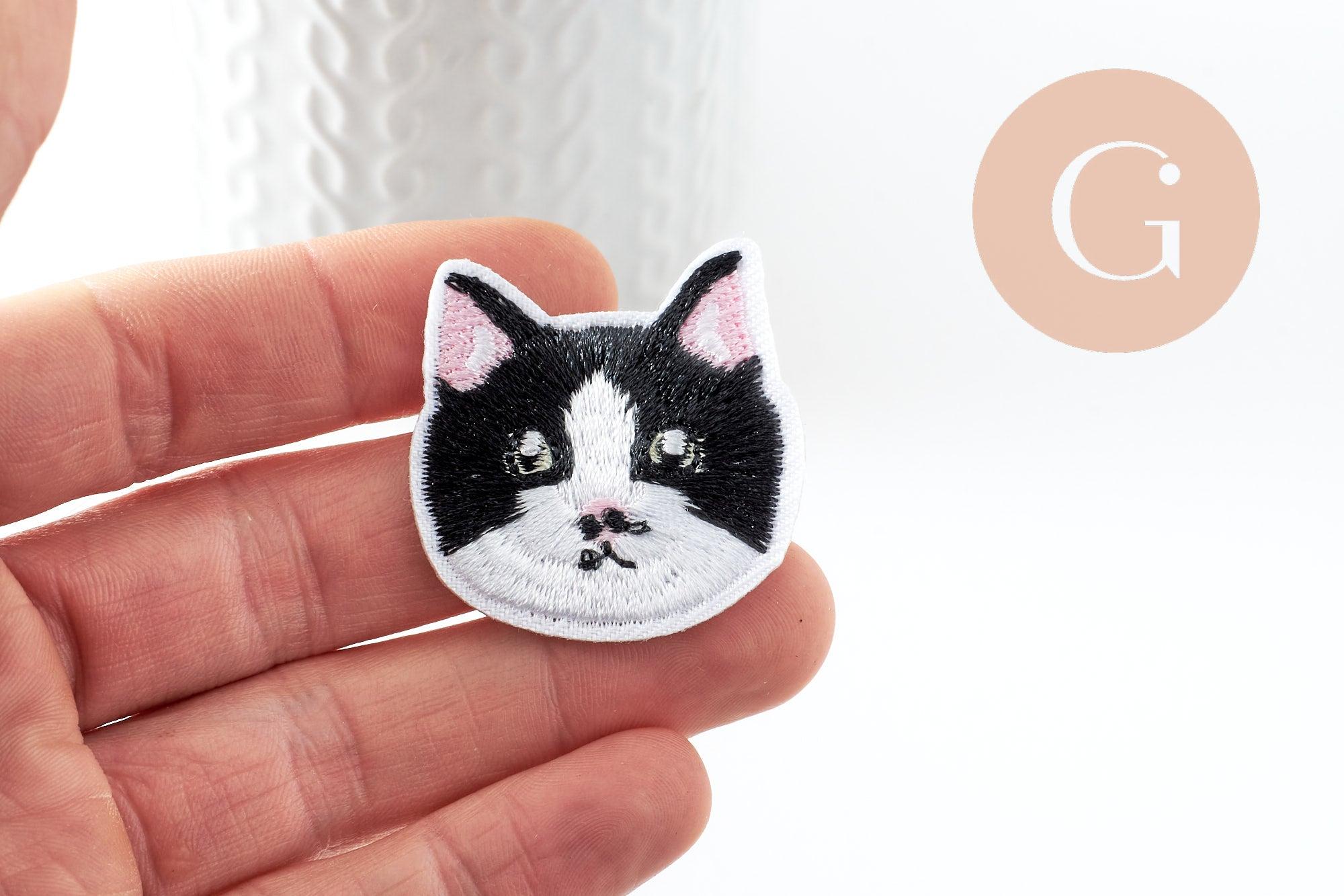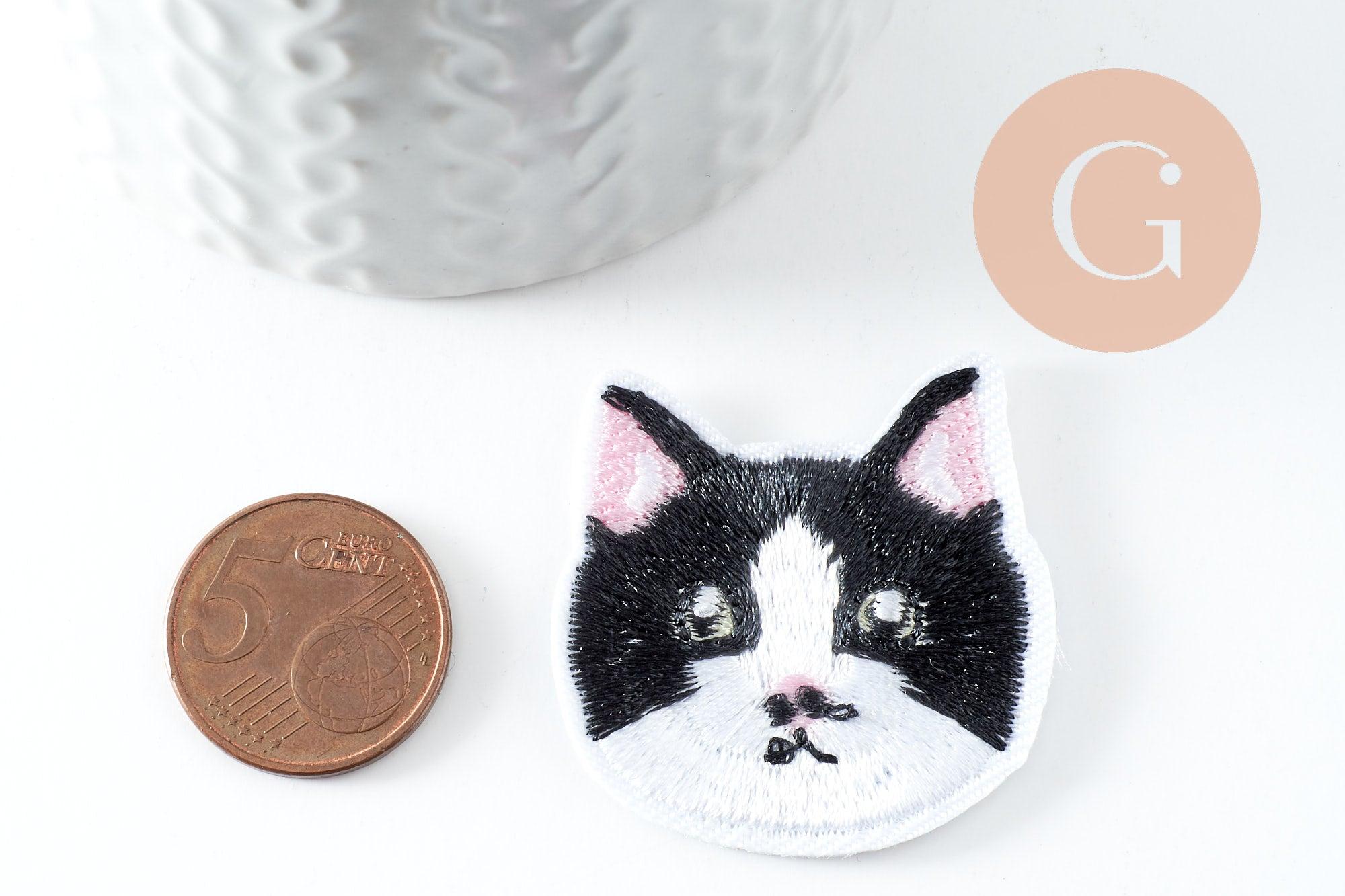 To accessorize your clothes and customize your accessories, adopt this embroidered iron-on badge representing a black and white cat's head.