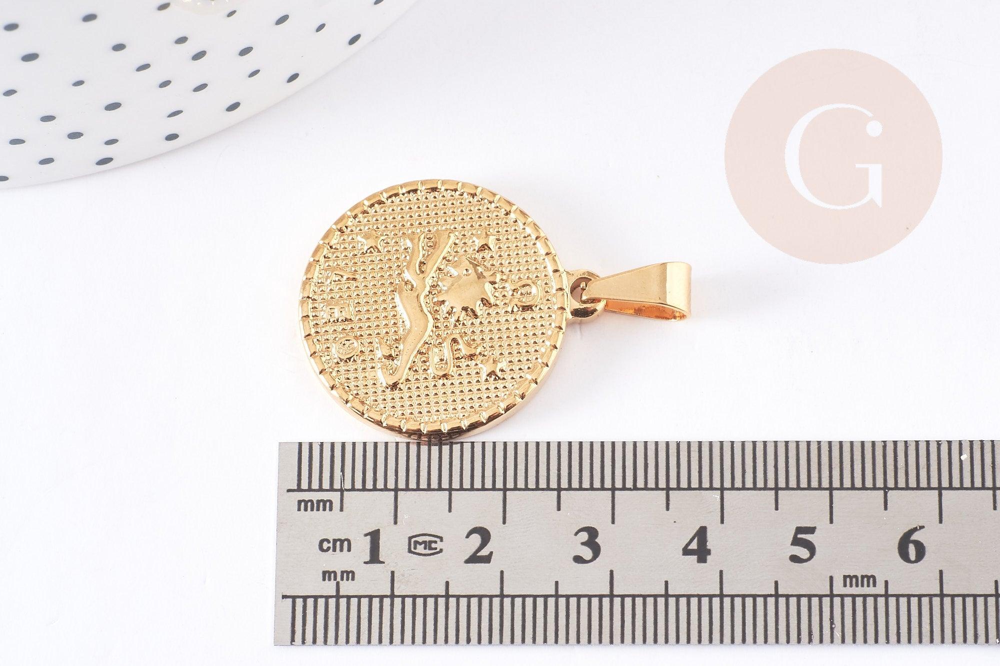 Lionn round medal pendant in golden steel, astrological sign, golden pendant, nickel-free, golden brass, jewelry creation, gold medal, 2.9cm