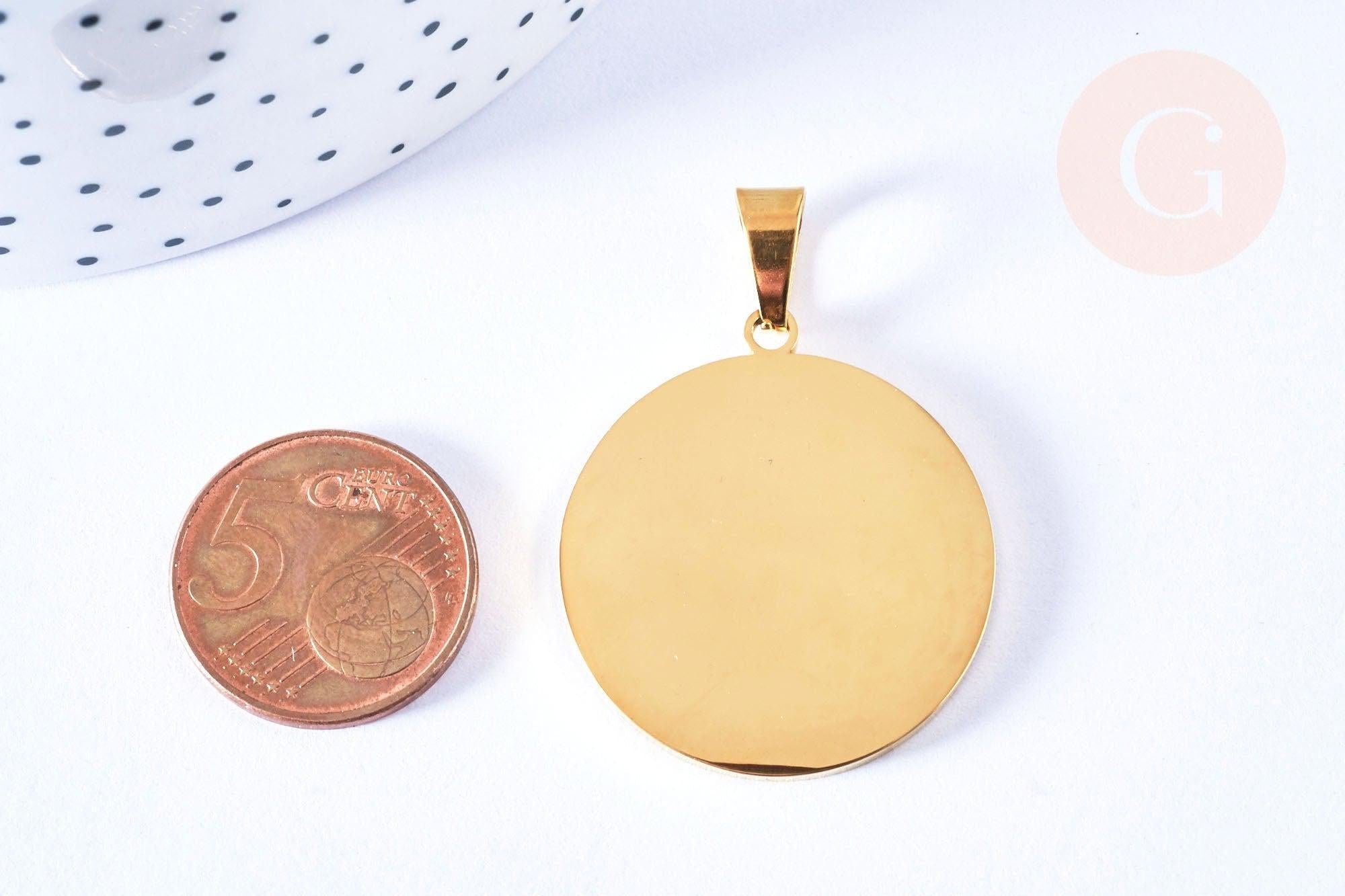 A round-shaped stainless steel gold-plated pendant . A gold-plated pendant to use for your personalized creations, to be engraved for an occasion.