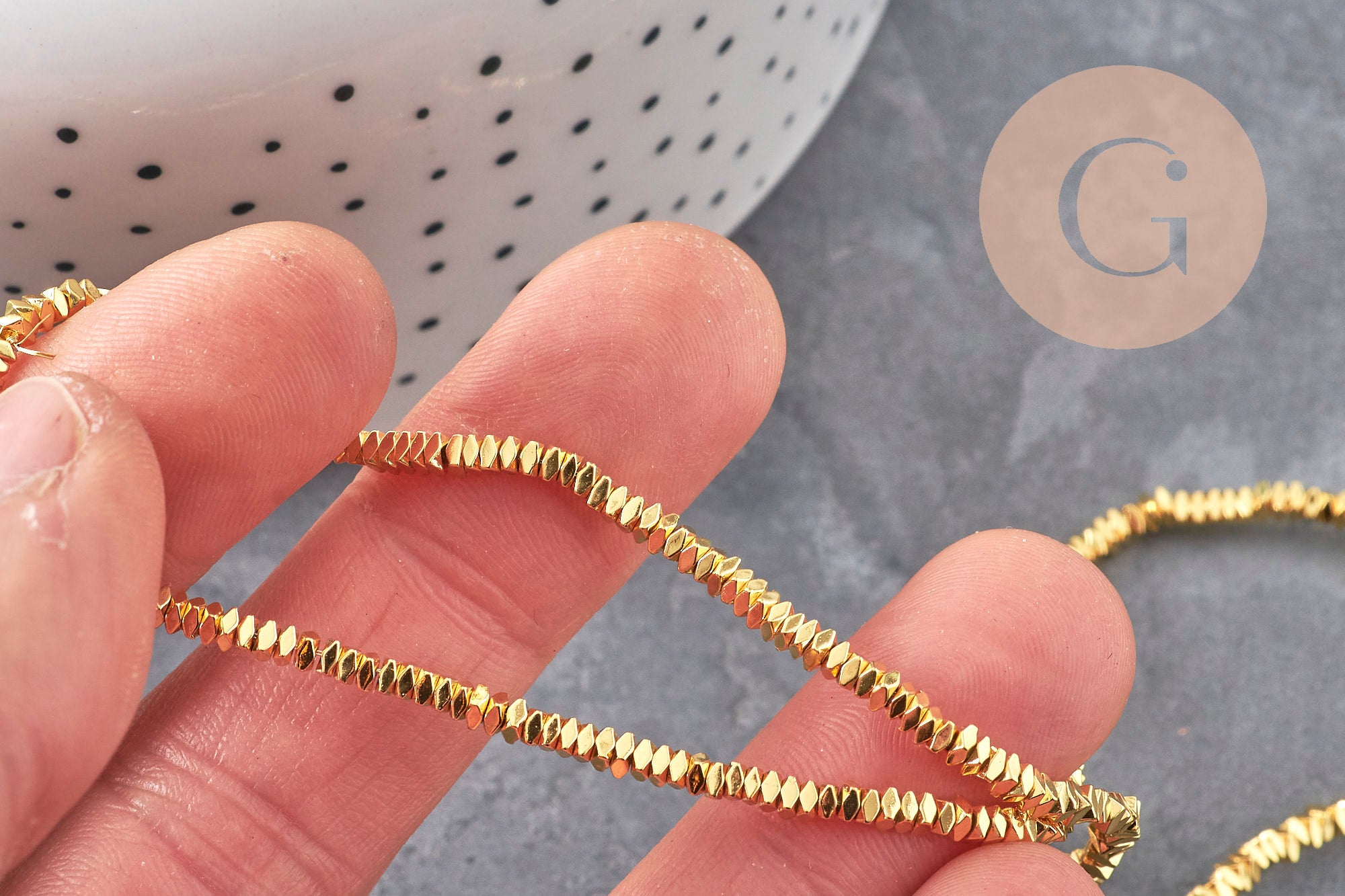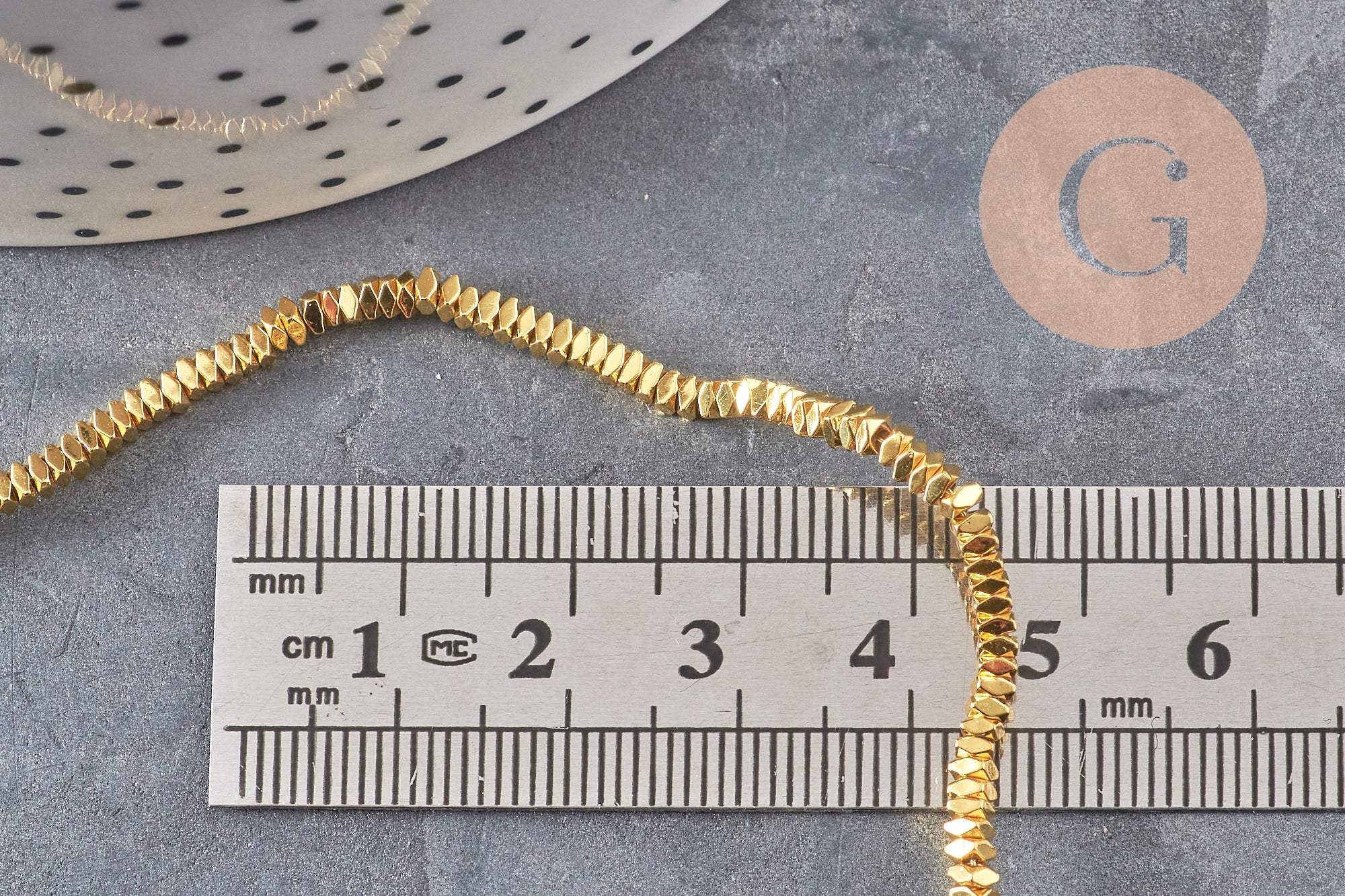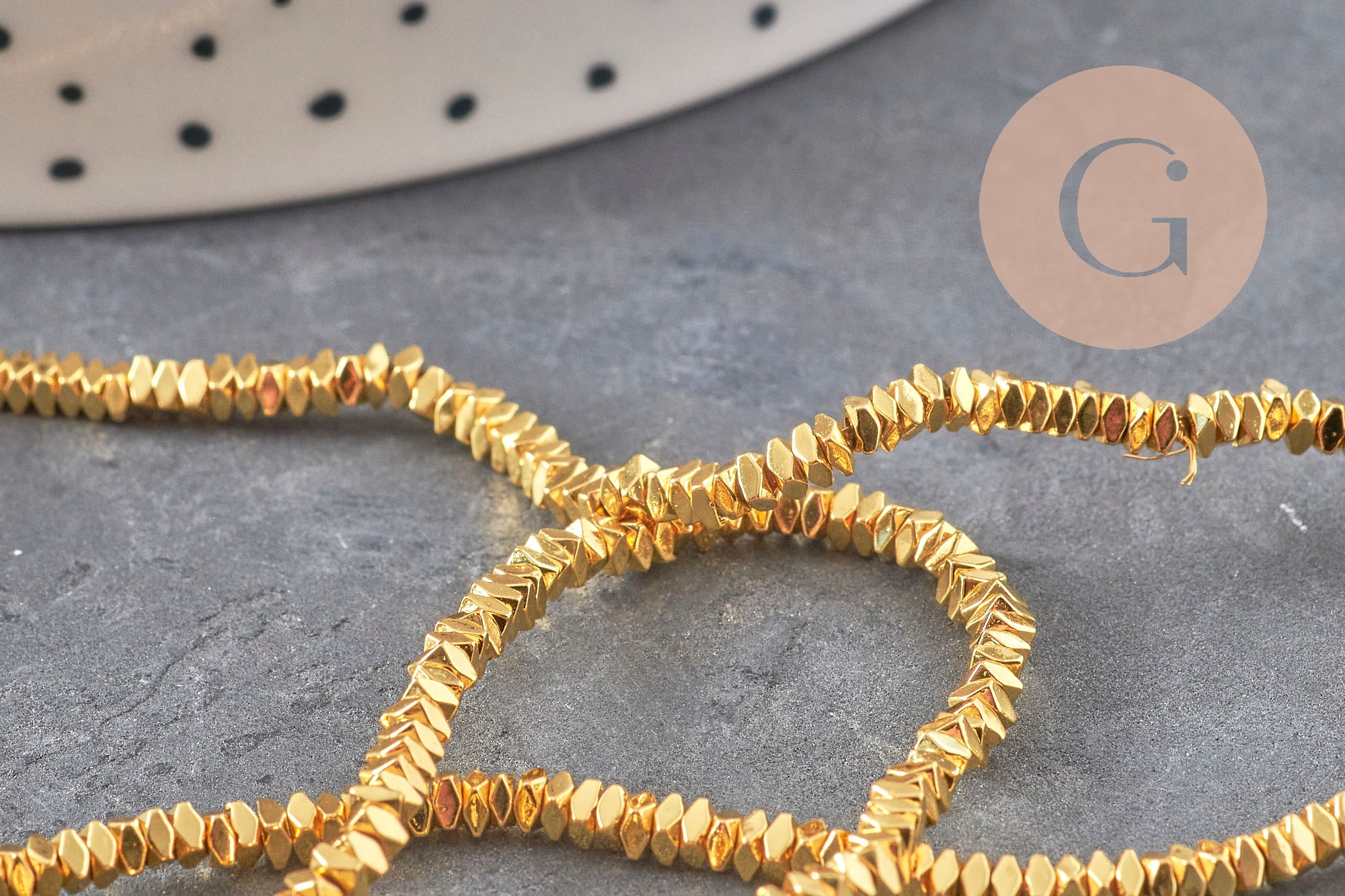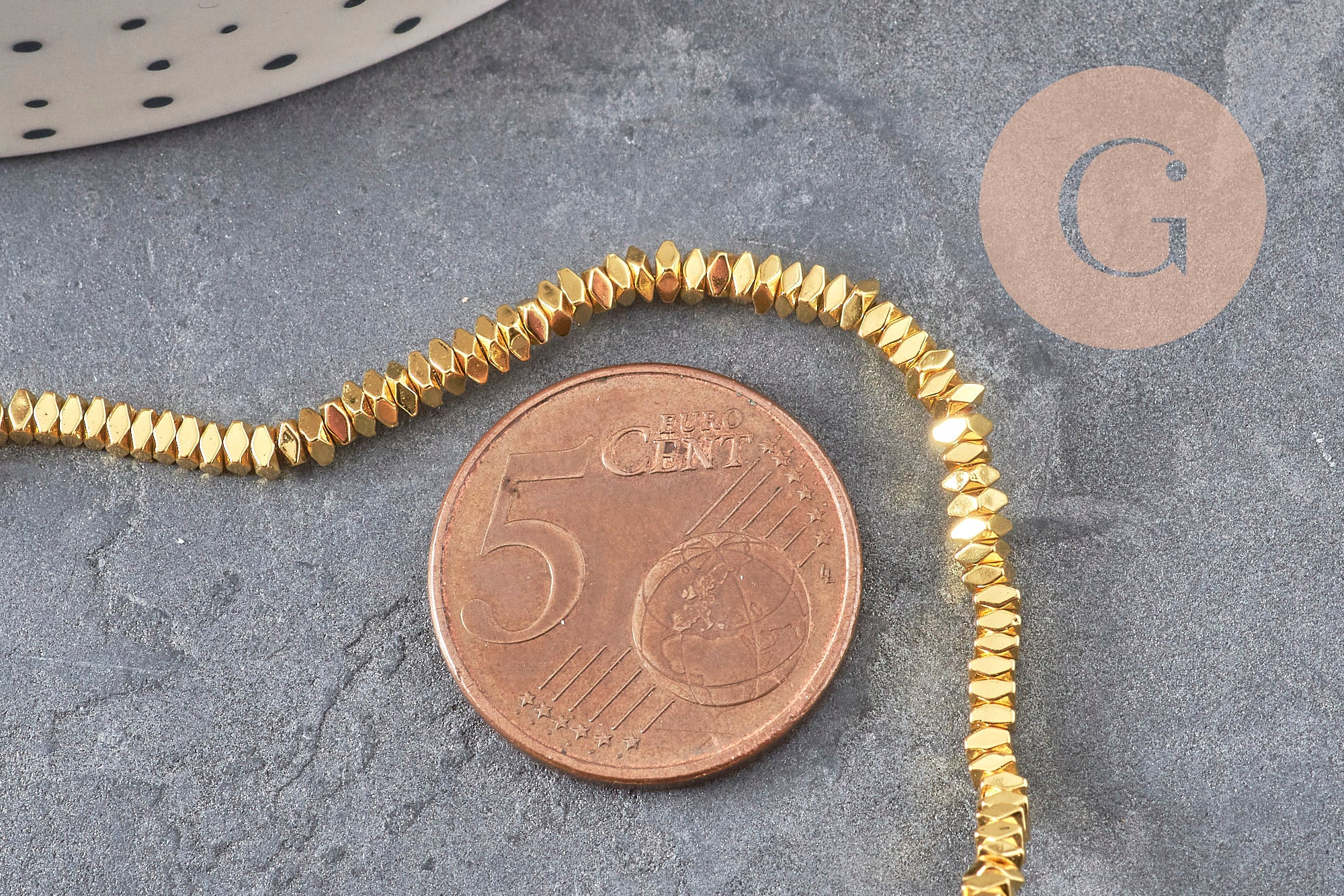 Synthetic hematite offers a uniform, non-magnetic, lightweight, and comfortable golden finish. The entire strand allows for multiple creations or the production of a single design in series.