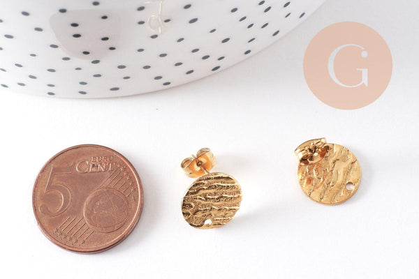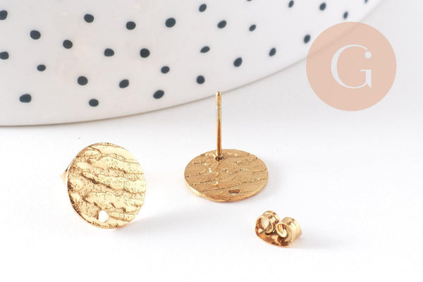 Clous-puces oreille disque acier 304 inoxydable dore IP texturé 1 trou 12mm, la paire (G10488)