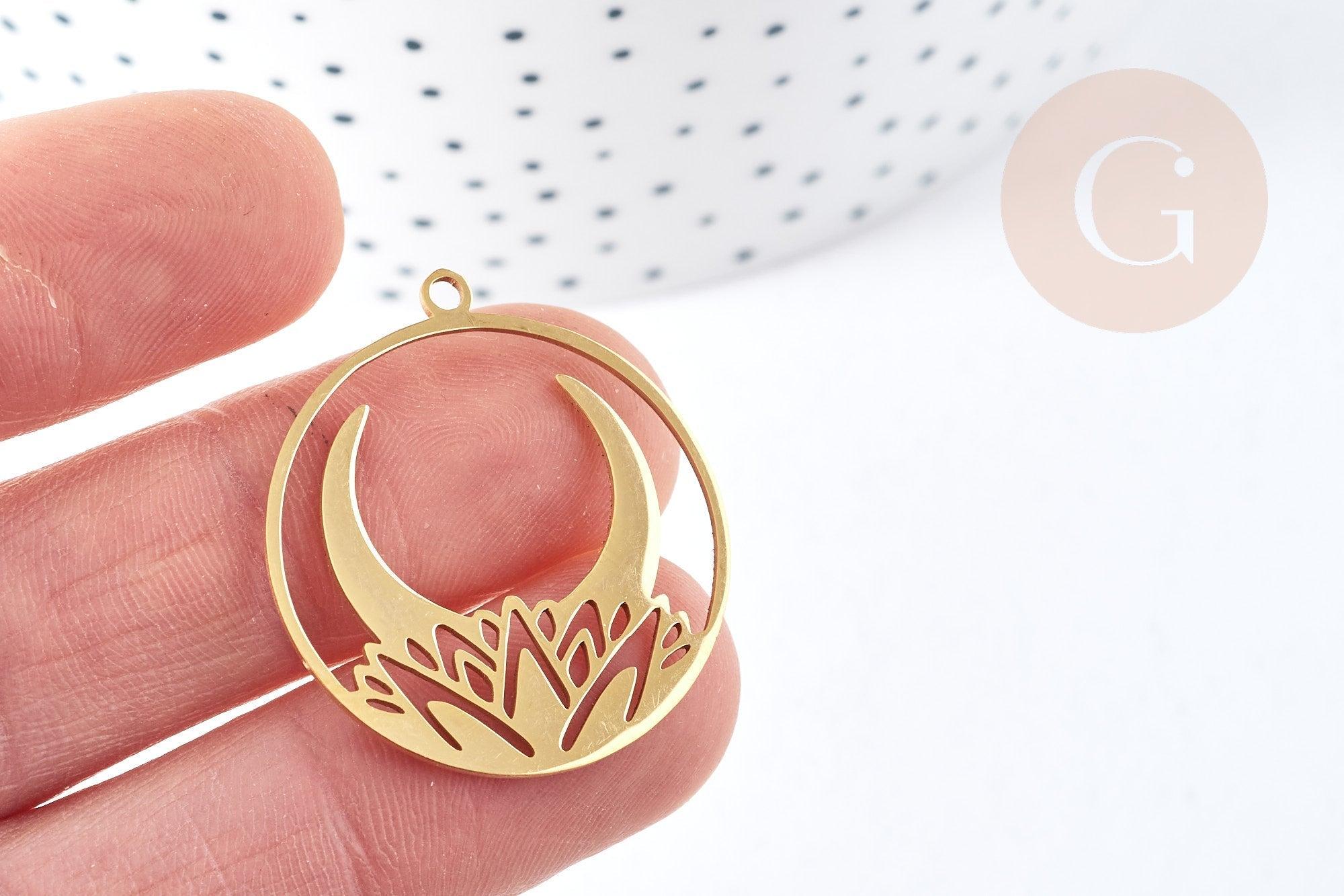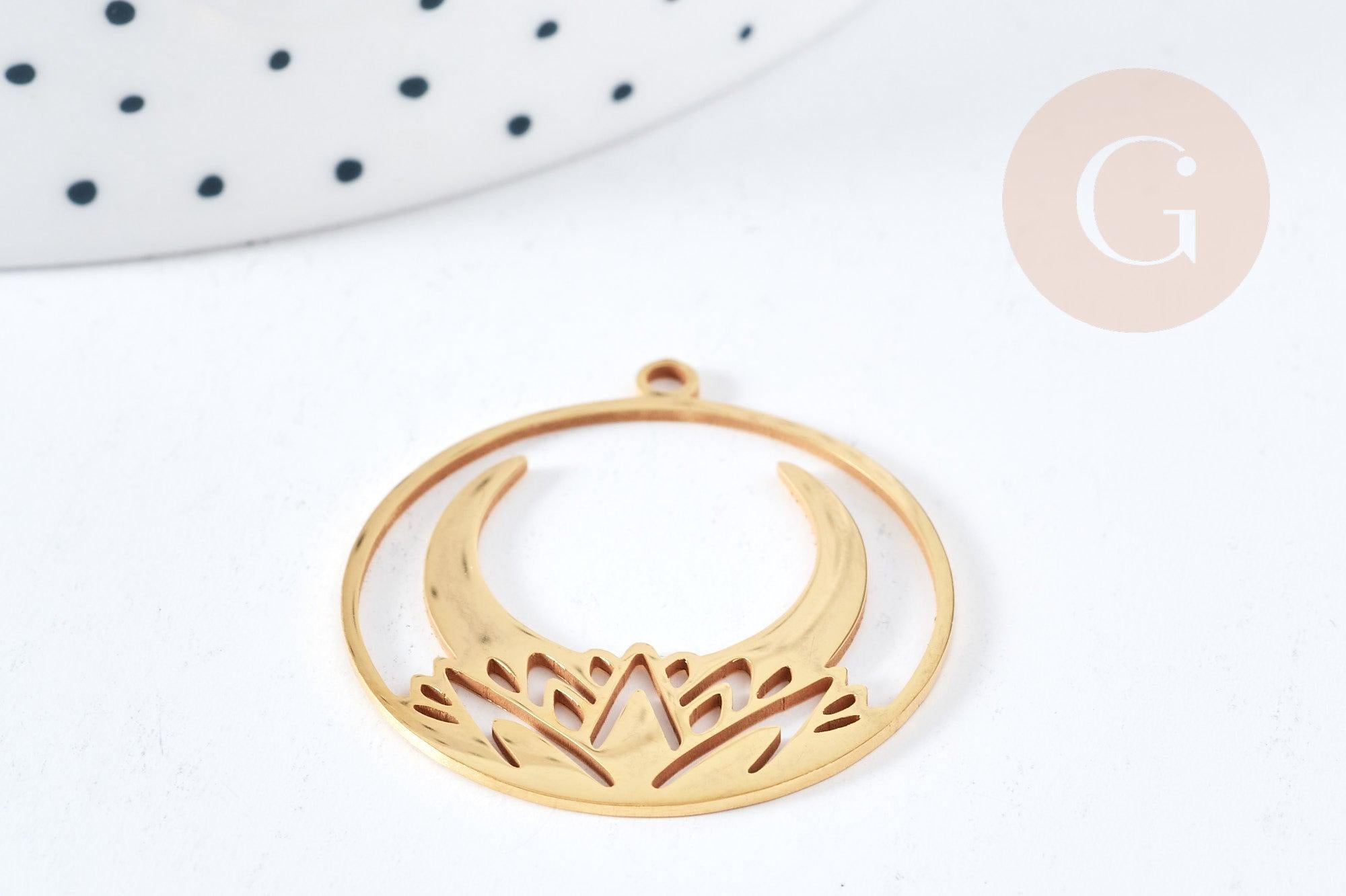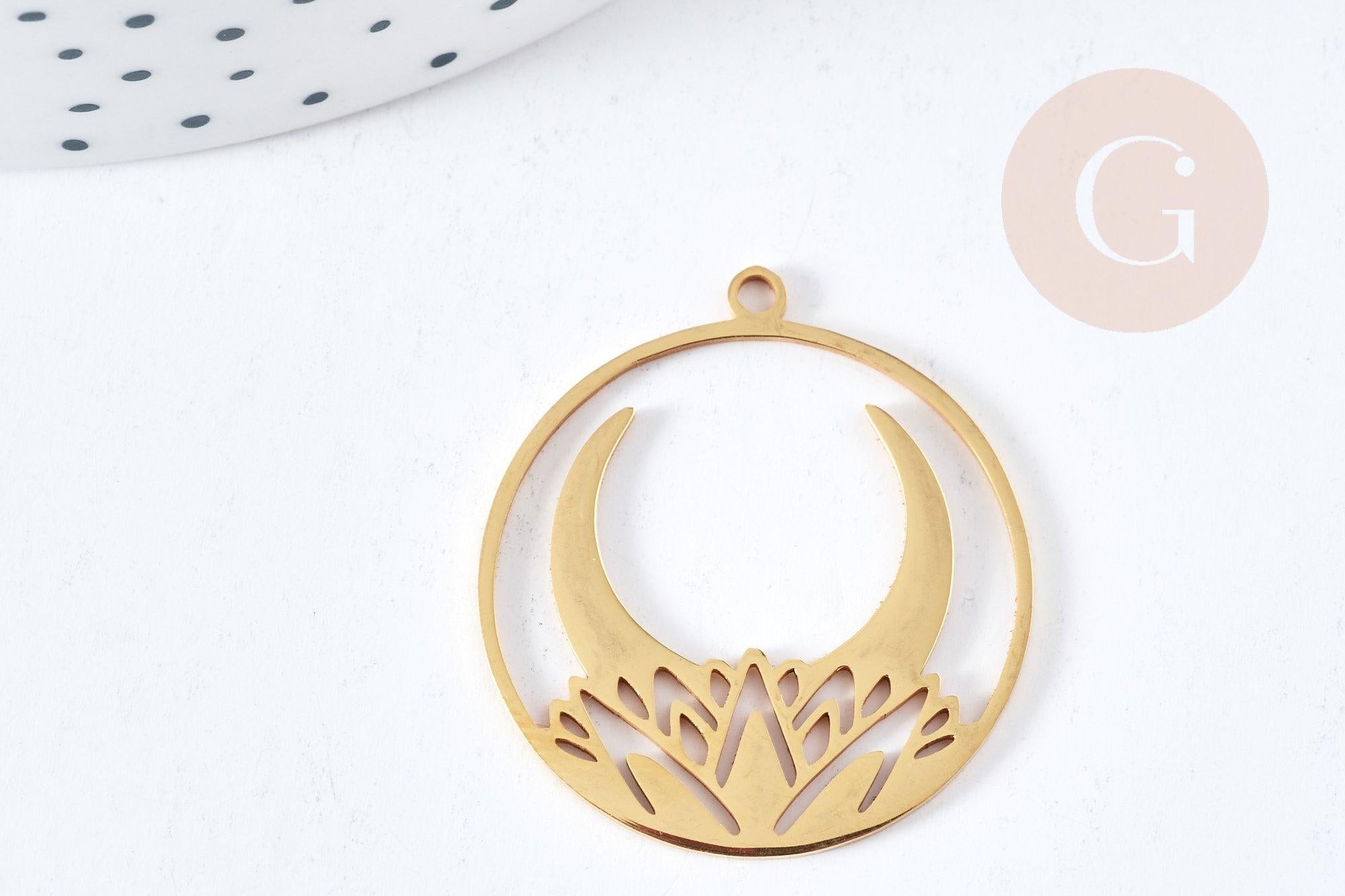 Pendentif rond croissant de lune nénuphar acier 201 doré inoxydable 32mm, x1 (G8814)