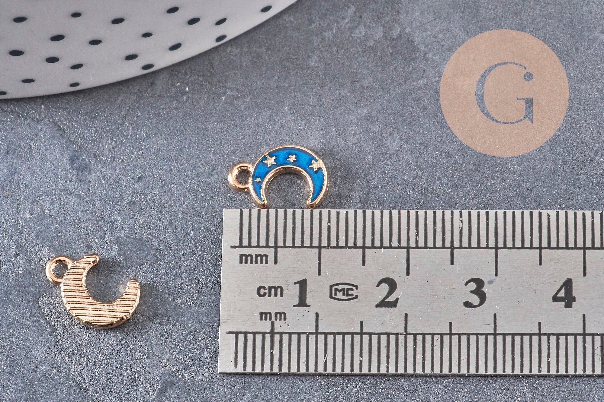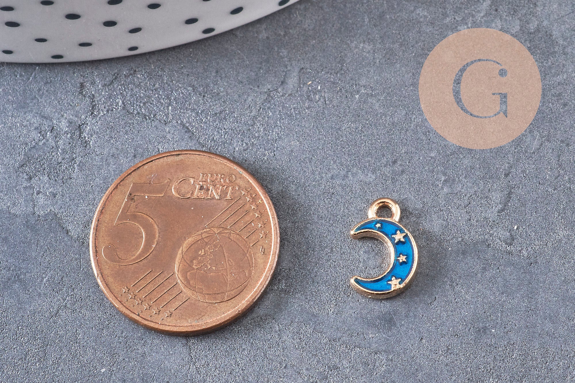 An adorable pendant in gilded zamac depicting a crescent moon enameled with transparent blue resin and decorated with stars.