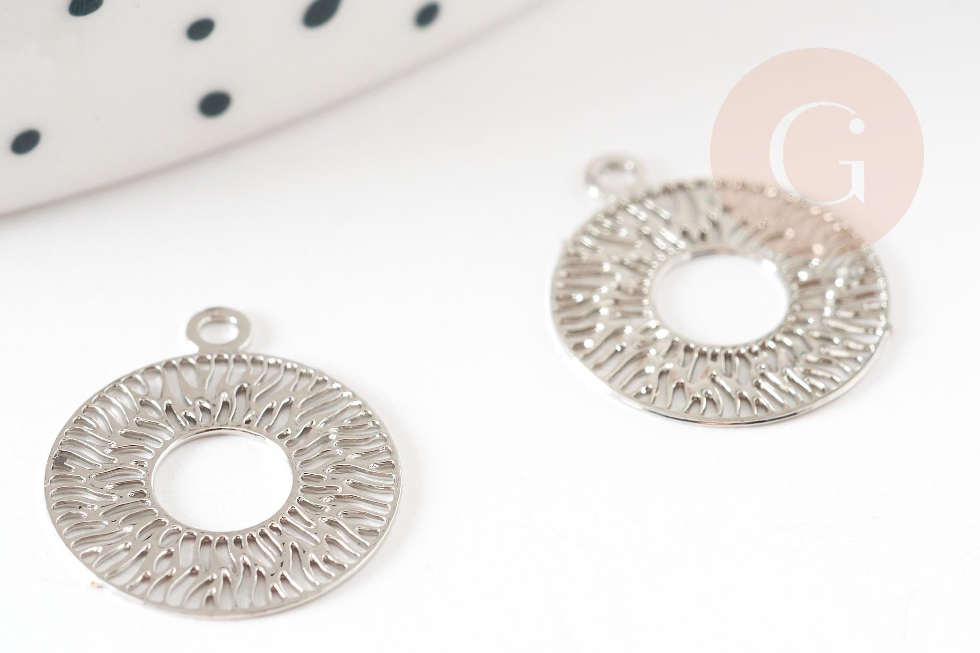 Round filigree stamped pendant with hollowed-out geometric pattern in brass and platinum, 14mm, lightweight pendant, silver jewelry design, x2 (G9295)