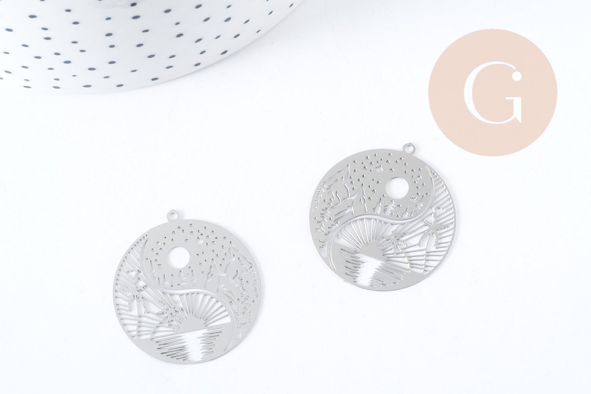 Pendentif estampe filigrane rond paysage acier 201 inoxydable argenté 32mm, Pendentif très fin et léger x1, (G8937)