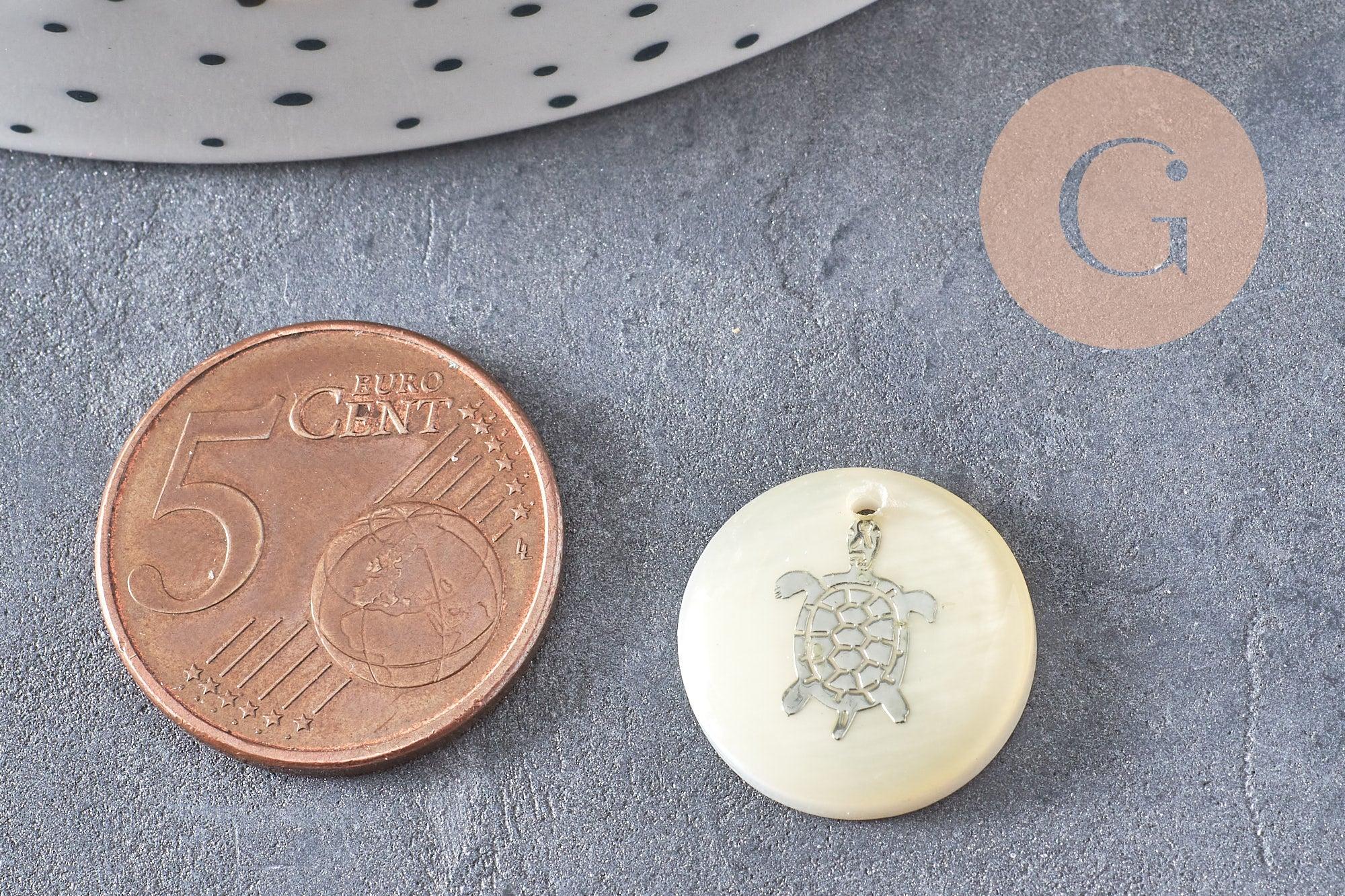 Round connector pendant in white mother-of-pearl with a silver motif of a turtle đą.