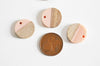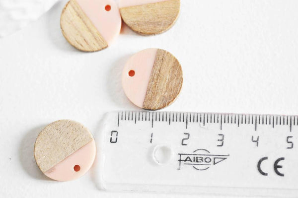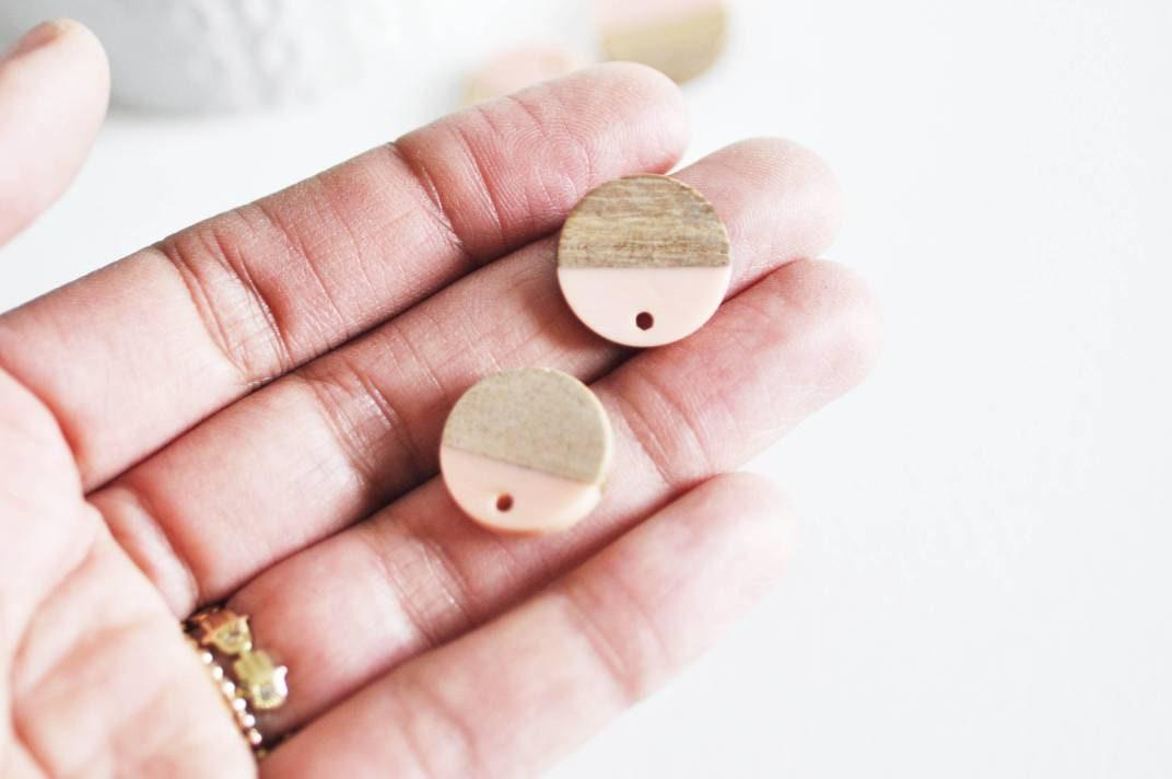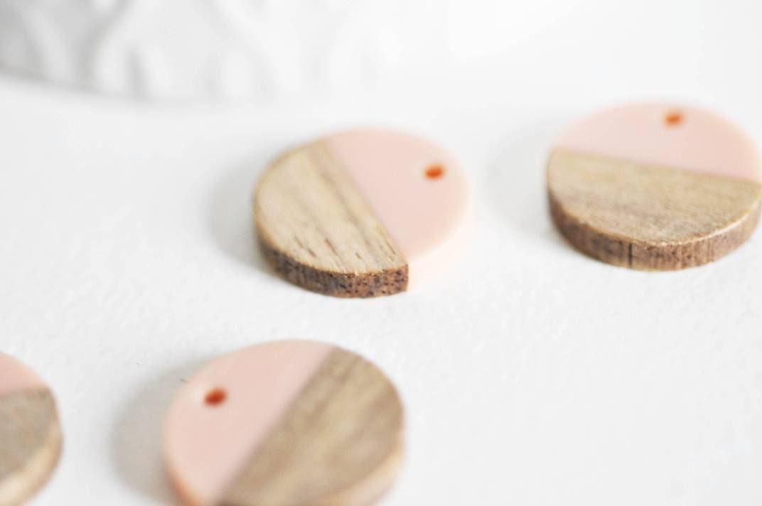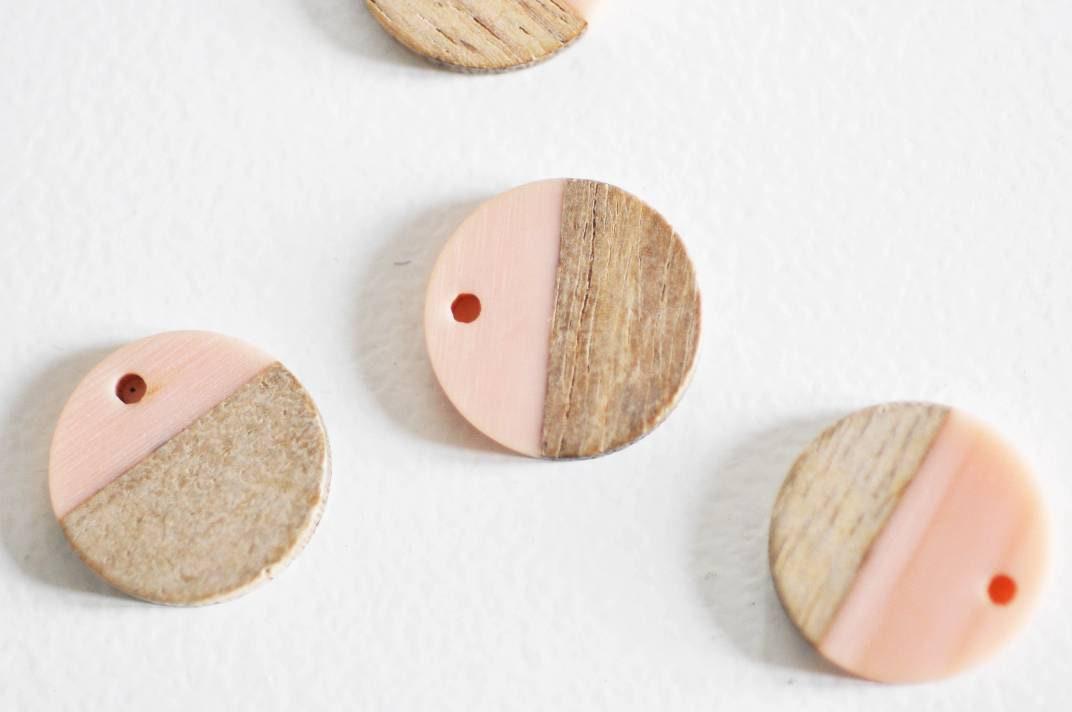 Wooden and pink resin disc pendants that can make very pretty pendants or complete earrings in a geometric style.