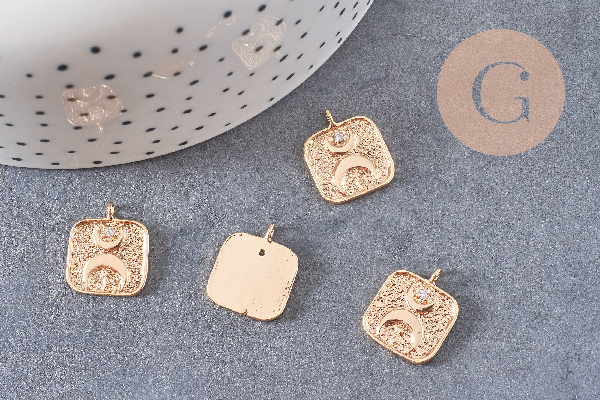 Add a touch of symbolic elegance to your creations with this square pendant in 18K gold-plated brass , adorned with a lucky protective lunar motif set with zircon. Ideal to wear as a necklace, sautoir or earrings.