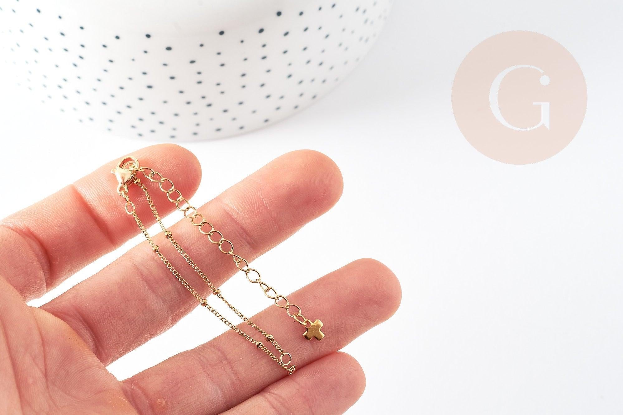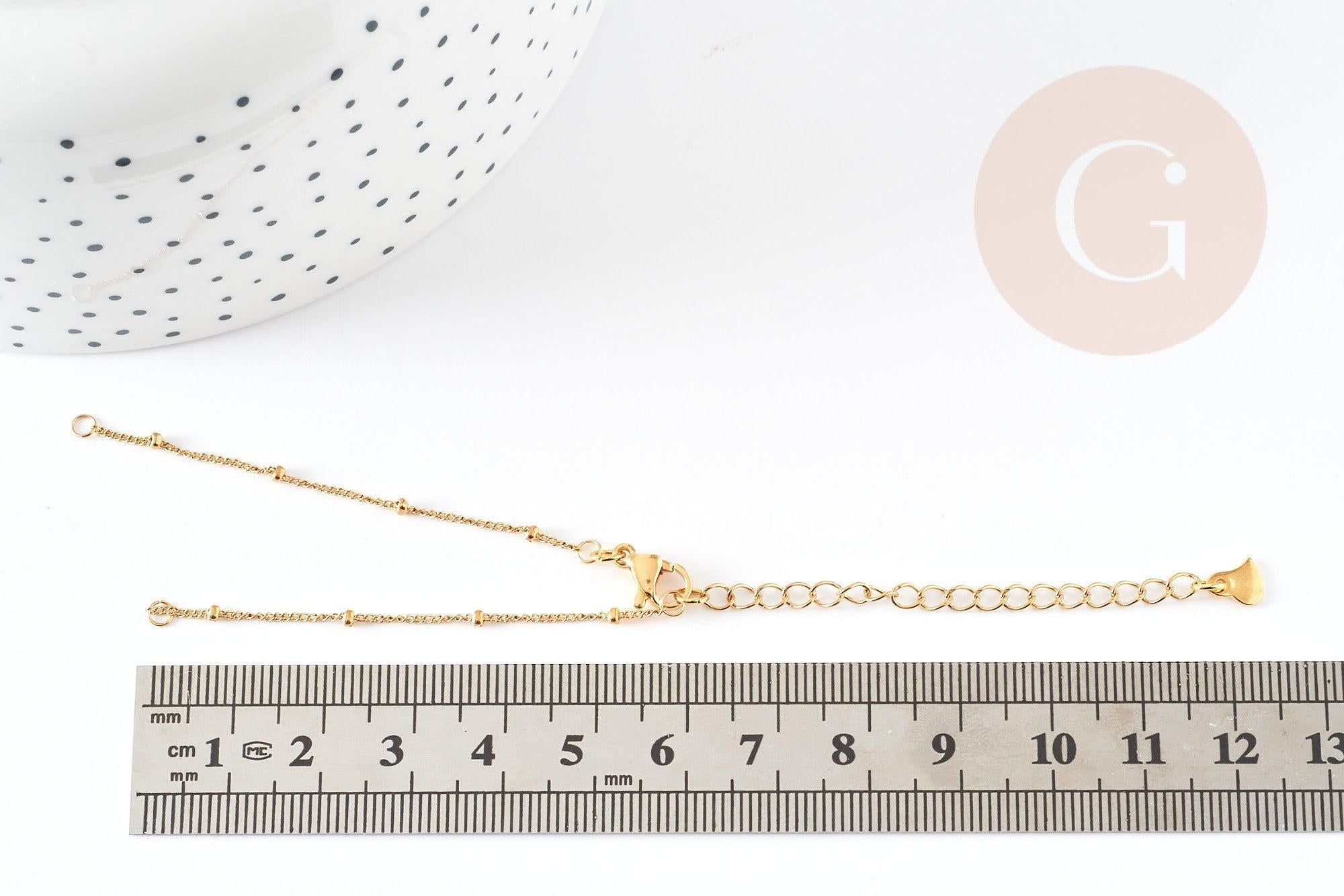Immediately adopt this satellite mesh bracelet base in 14k gold-plated steel , adjustable thanks to its extension & its customizable chain with its two rings at the end of the chain to be personalized using a connector pendant.