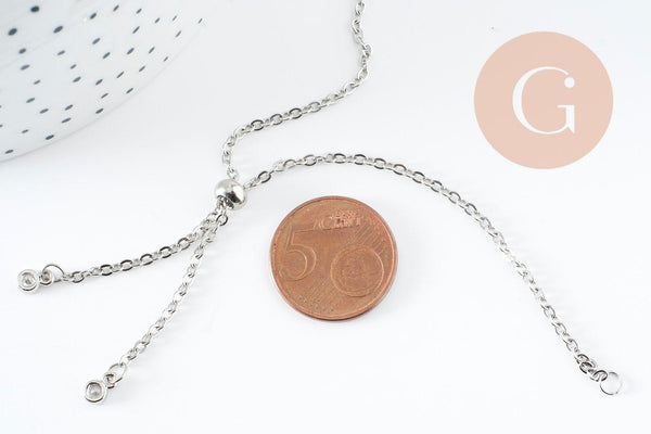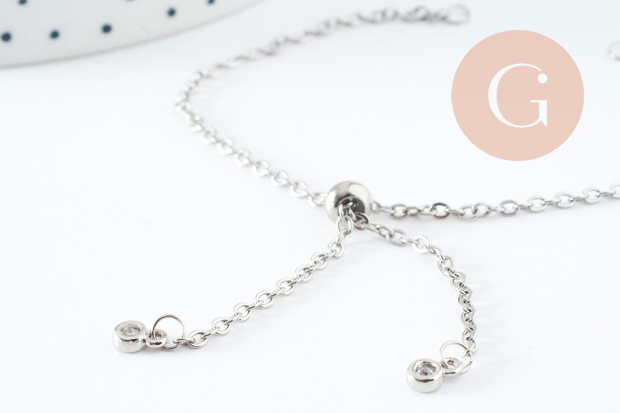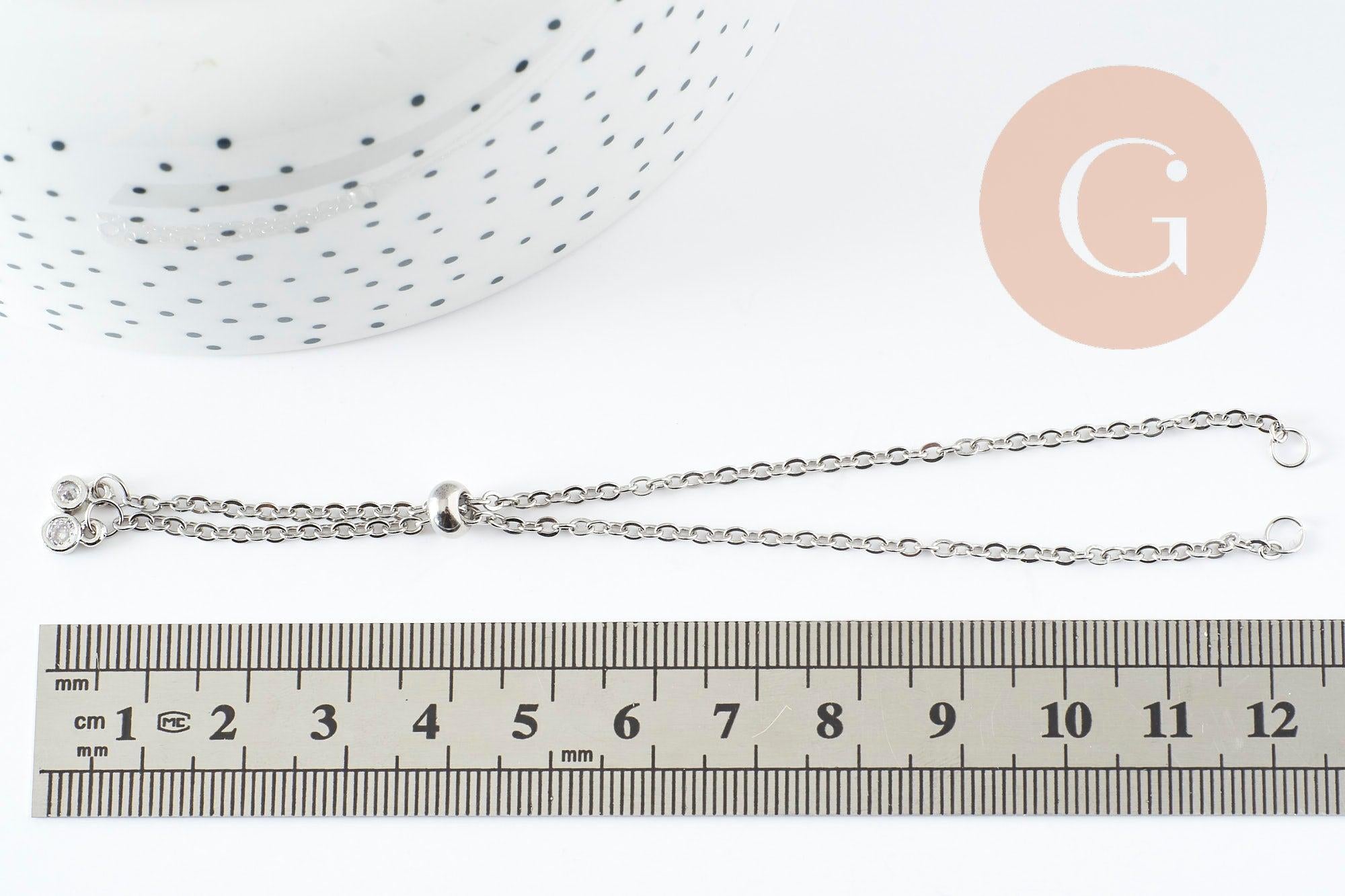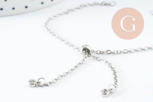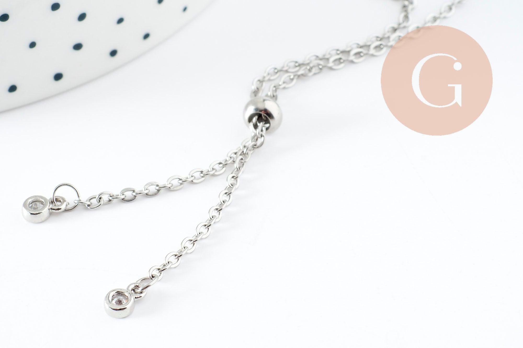 A delicate platinum steel chain bracelet, adjustable thanks to its brake and customizable by adding pearls or charms on the two rings decorated with white zircons.