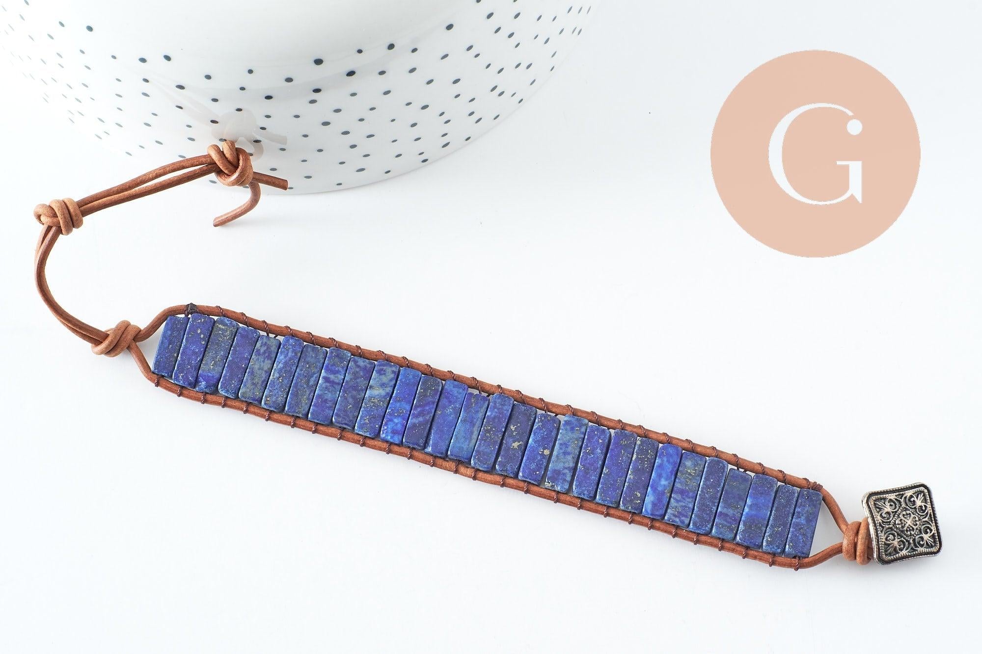 Bracelet réglable lapis lazulis naturel cuir 23-28cm, bracelet pierre naturelle energie positive, bracelet lithothérapie, x1 (G9976)