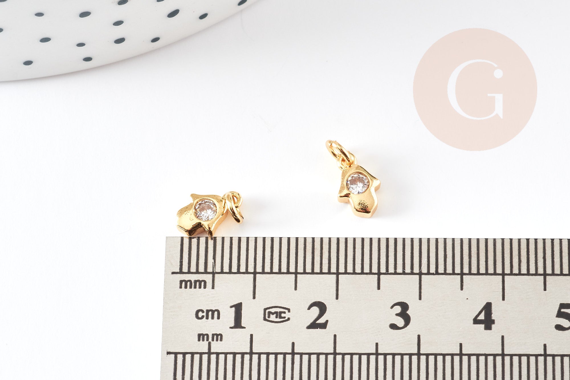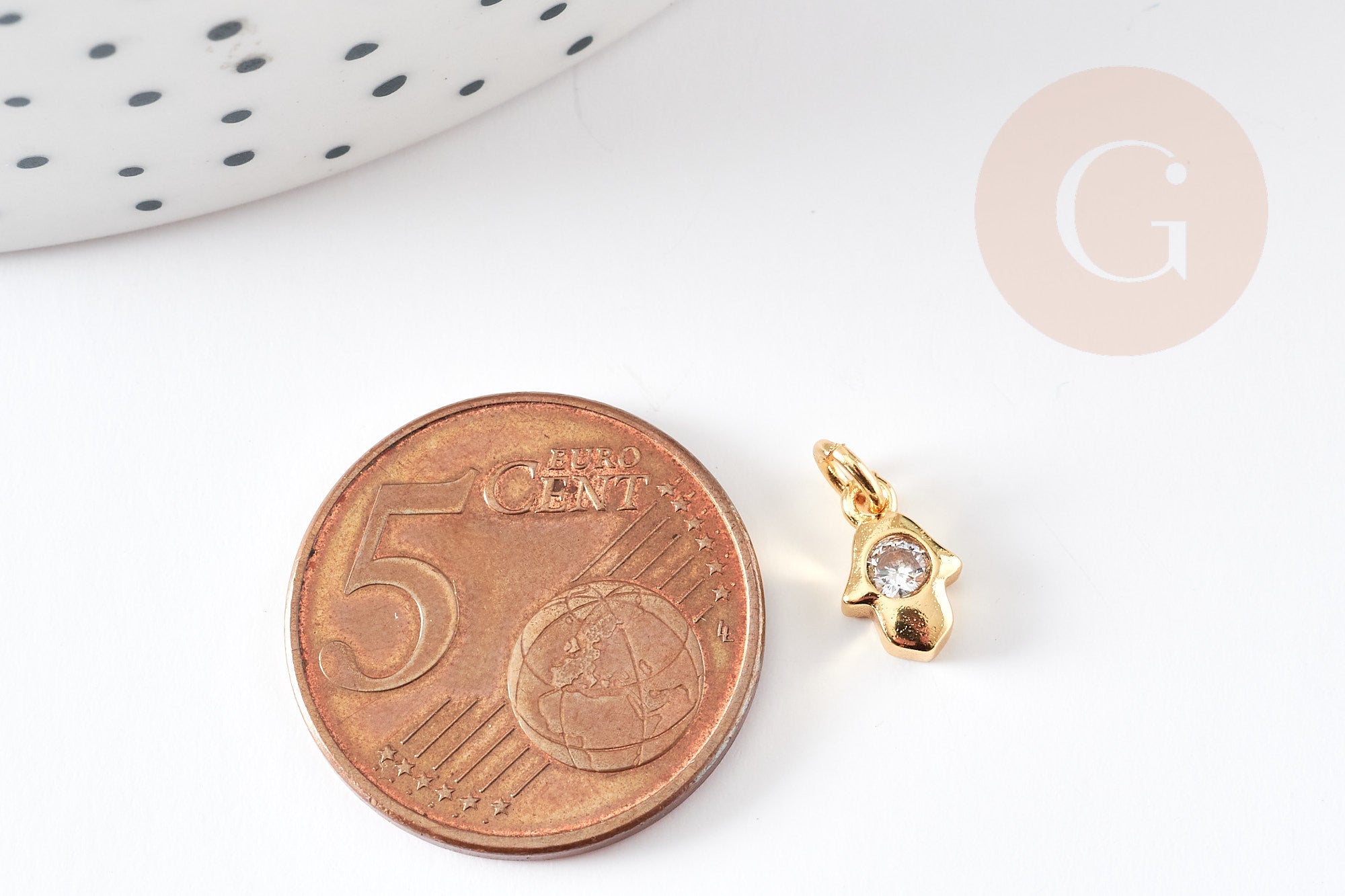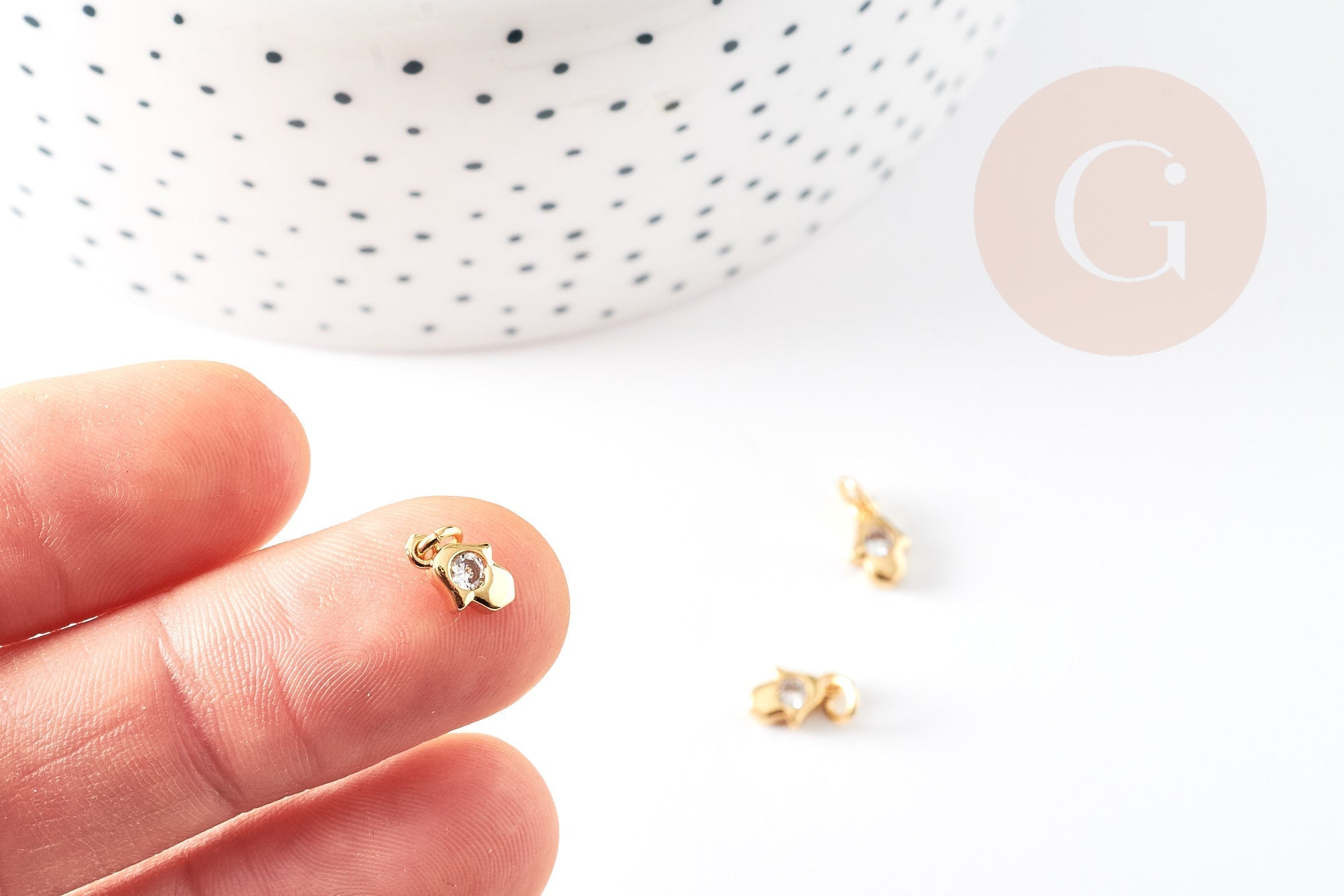 To make magnificent necklaces, earrings and bracelets, adopt this hand of fatma, a small religious pendant and lucky charm in golden brass, decorated with a small shiny white zircon