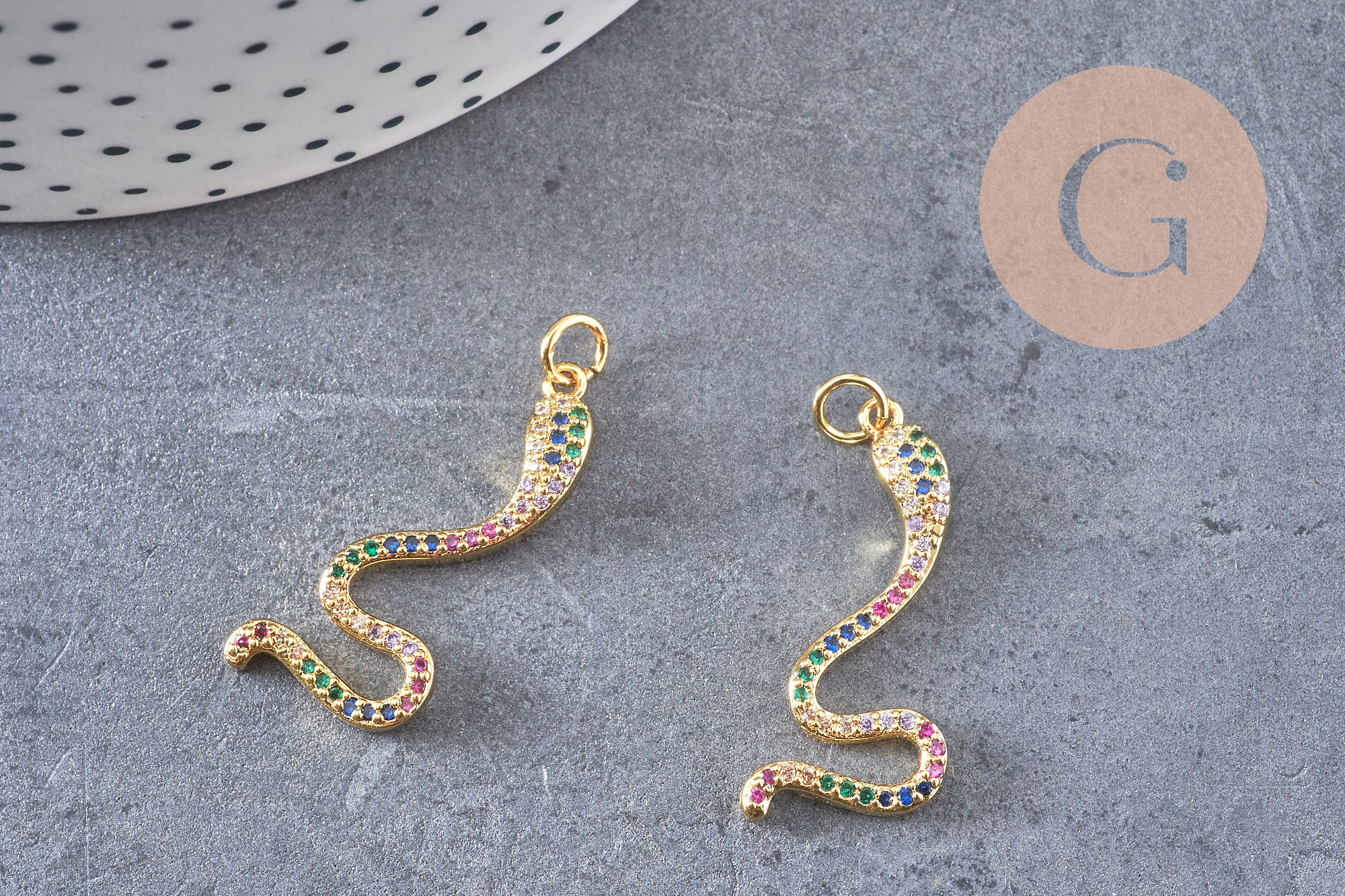 To make magnificent necklaces, earrings and bracelets, adopt these little golden brass snakes, decorated with small shiny rainbow zircons.
