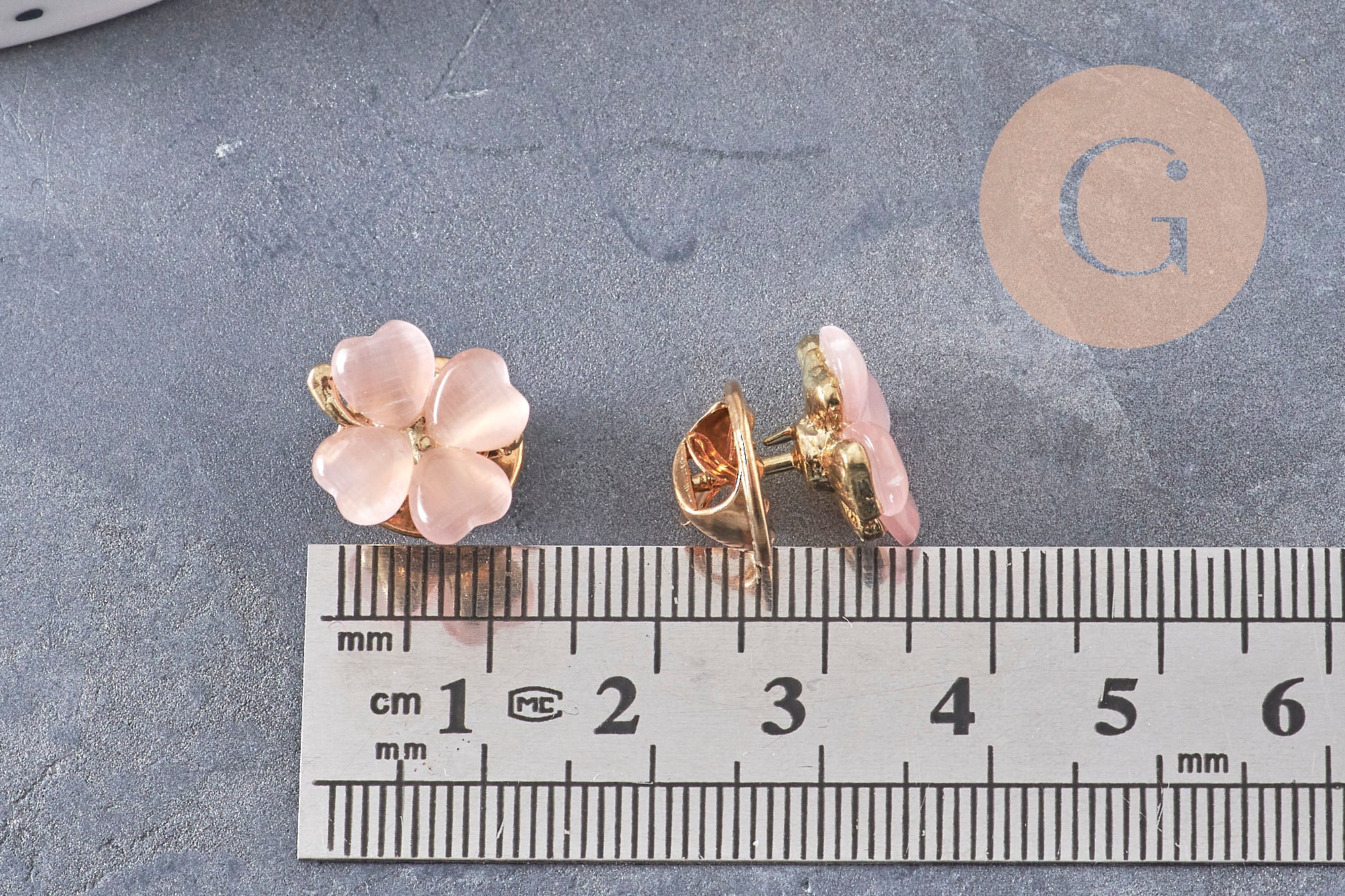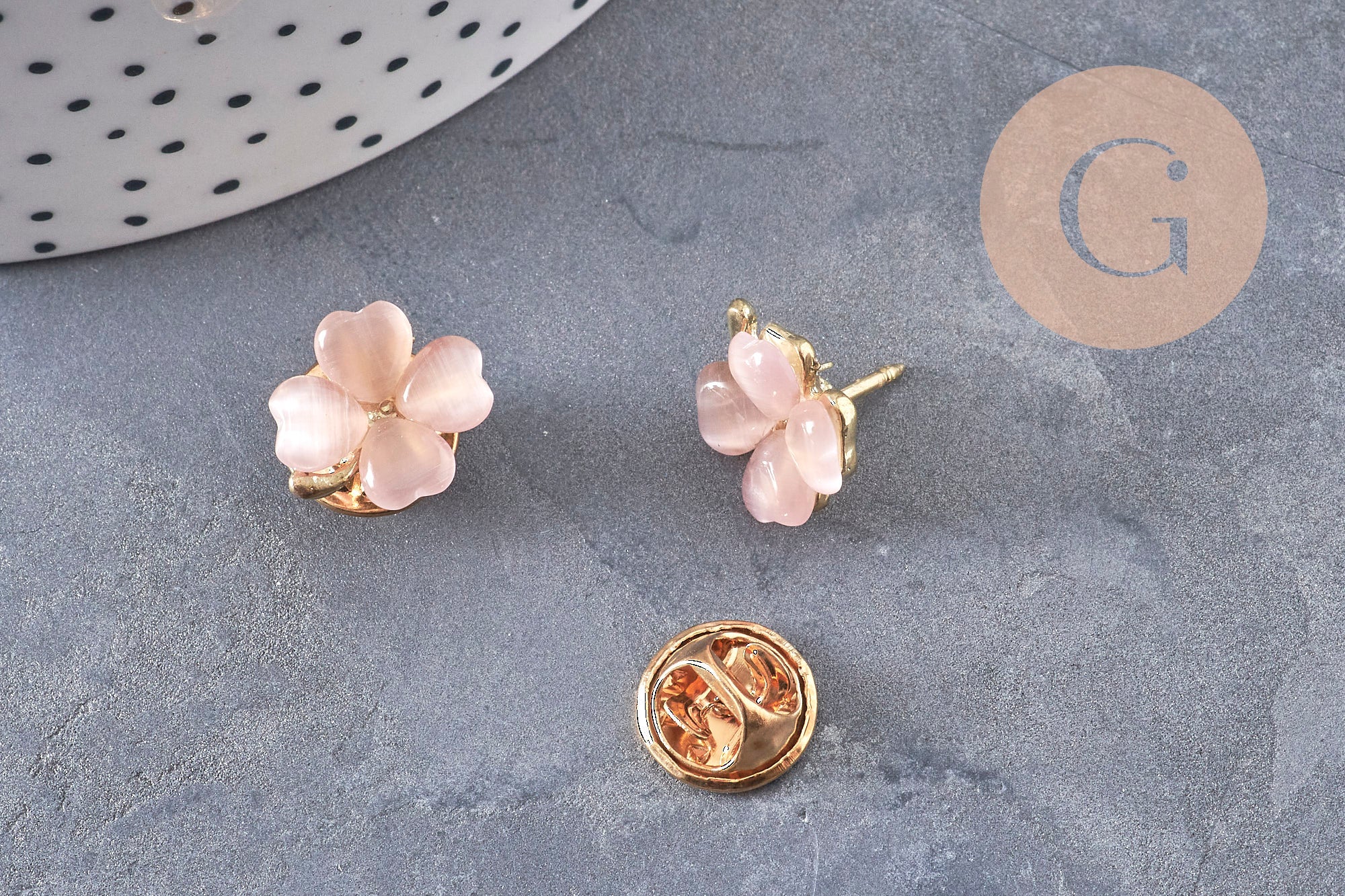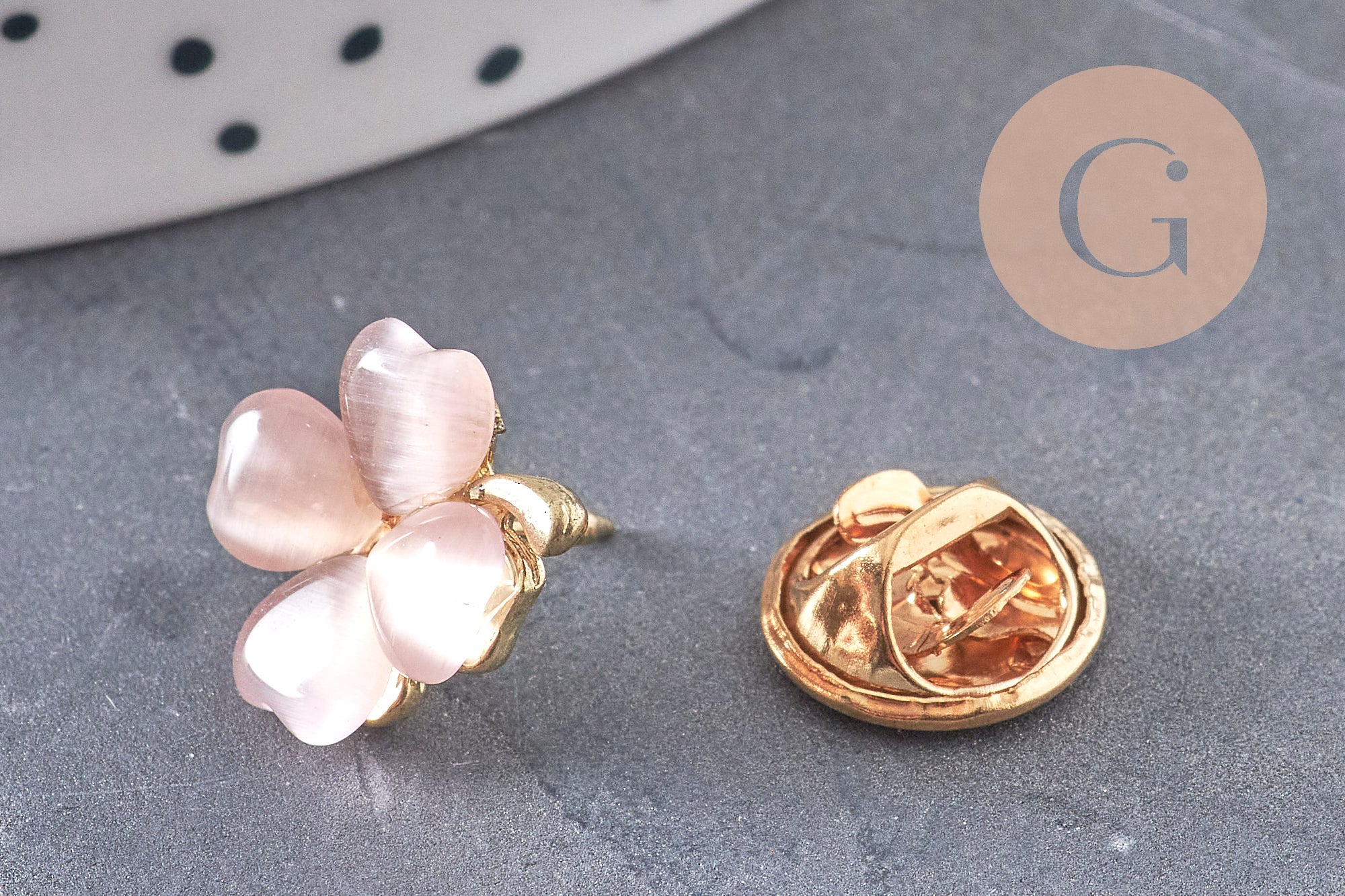 Wear a symbol of luck and elegance with this four-leaf clover brooch in gold-plated zamac , adorned with pink cat's-eye glass cabochons. Delicately sparkling and full of charm, it easily attaches to a coat, jacket, bag, or tote bag to add a precious and lucky touch to all your outfits. A trendy accessory to give as a gift or to treat yourself.