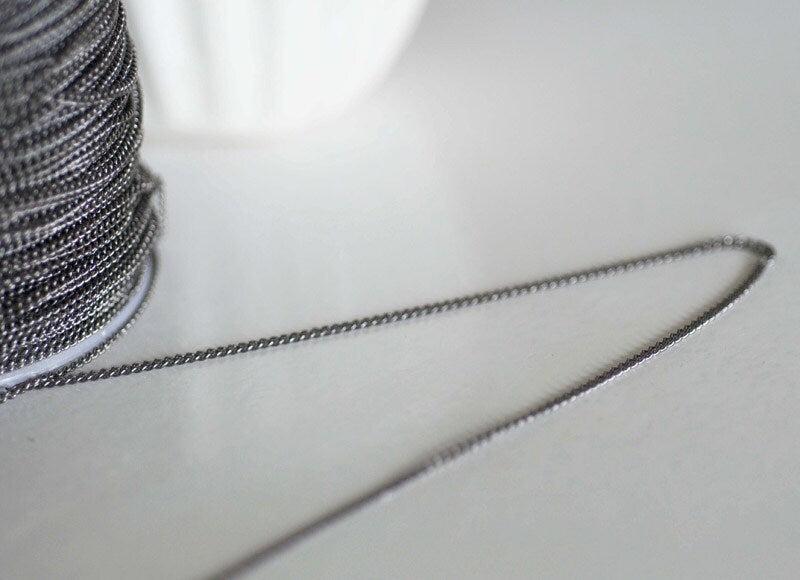 Fine flat metalgun chain, creative supply, jewelry chain, jewelry creation, chain wholesaler, 1.5 mm, 92 meter spool For your costume jewelry creations, here is a very fine chain with flat links in black metalgun color. Links welded together. New 92m...