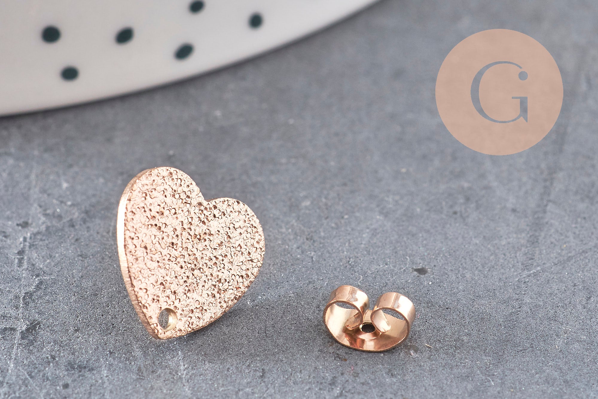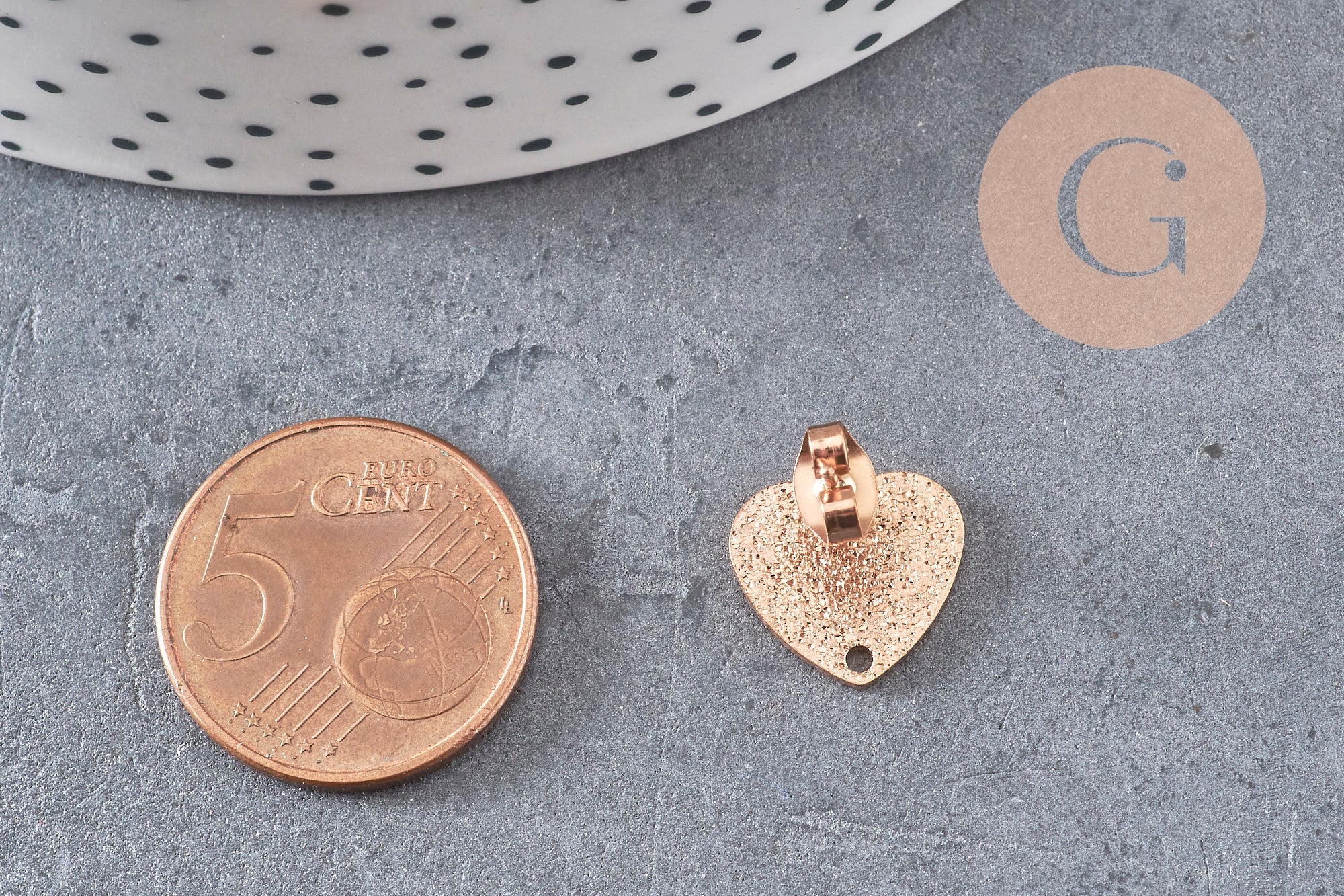 Clous-puces oreille coeur acier 304 inoxydable or rose IP sablé 1 trou 13mm, la paire (G10953)