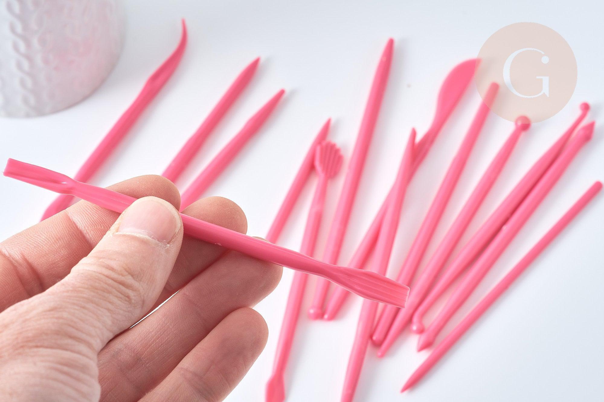 This set of 14 pink plastic tools is perfect for all your polymer clay, clay, self-hardening clay, or ceramic creations. Lightweight and handy, it offers a comfortable grip and a wide variety of shapes for sculpting, smoothing, cutting, or texturizing with precision.