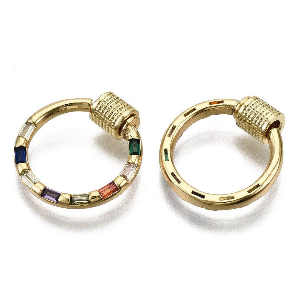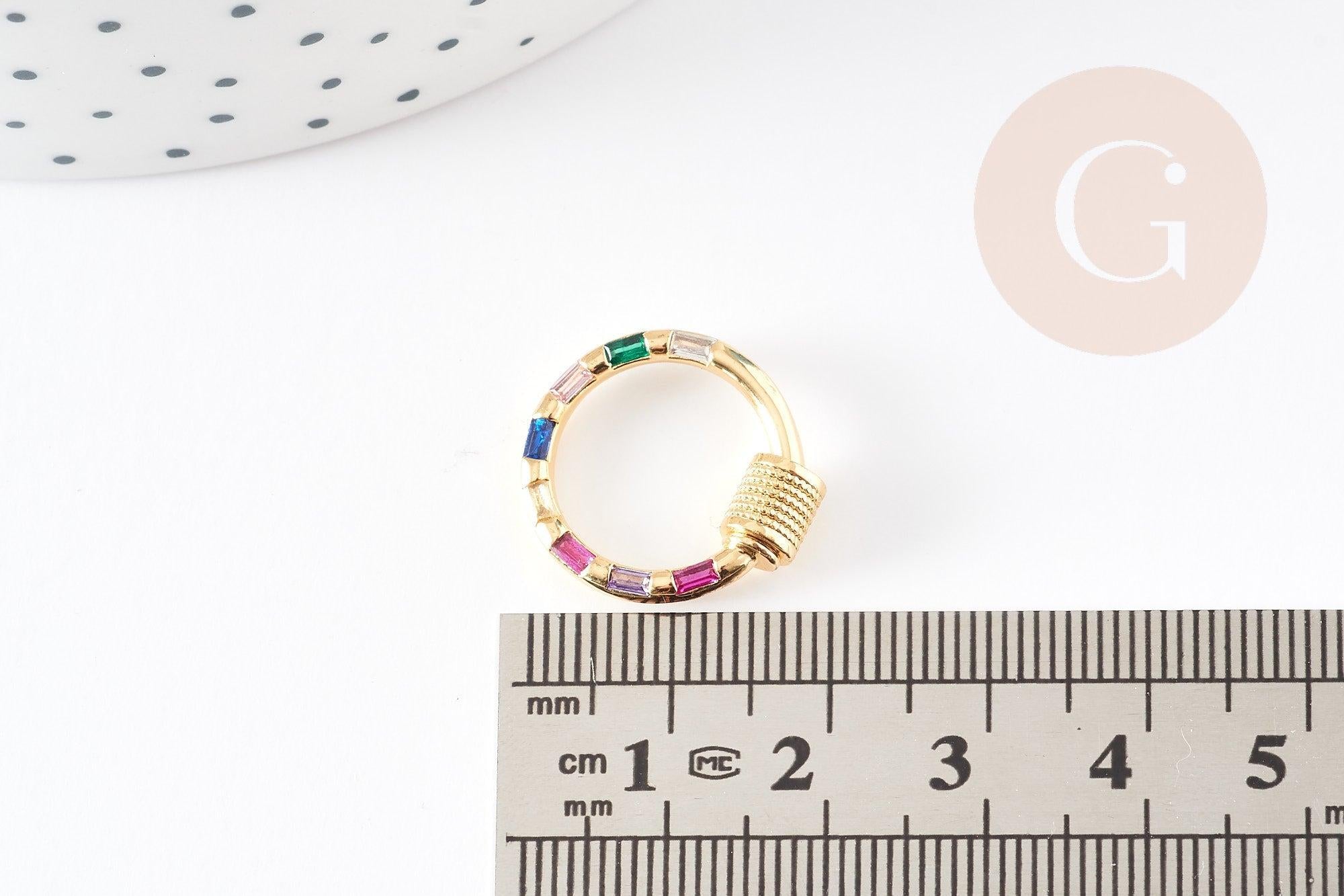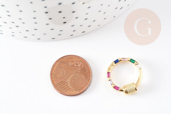 This round clasp in 18k gold-plated brass is equipped with a screw-on closure system and decorated with multi-colored zircons