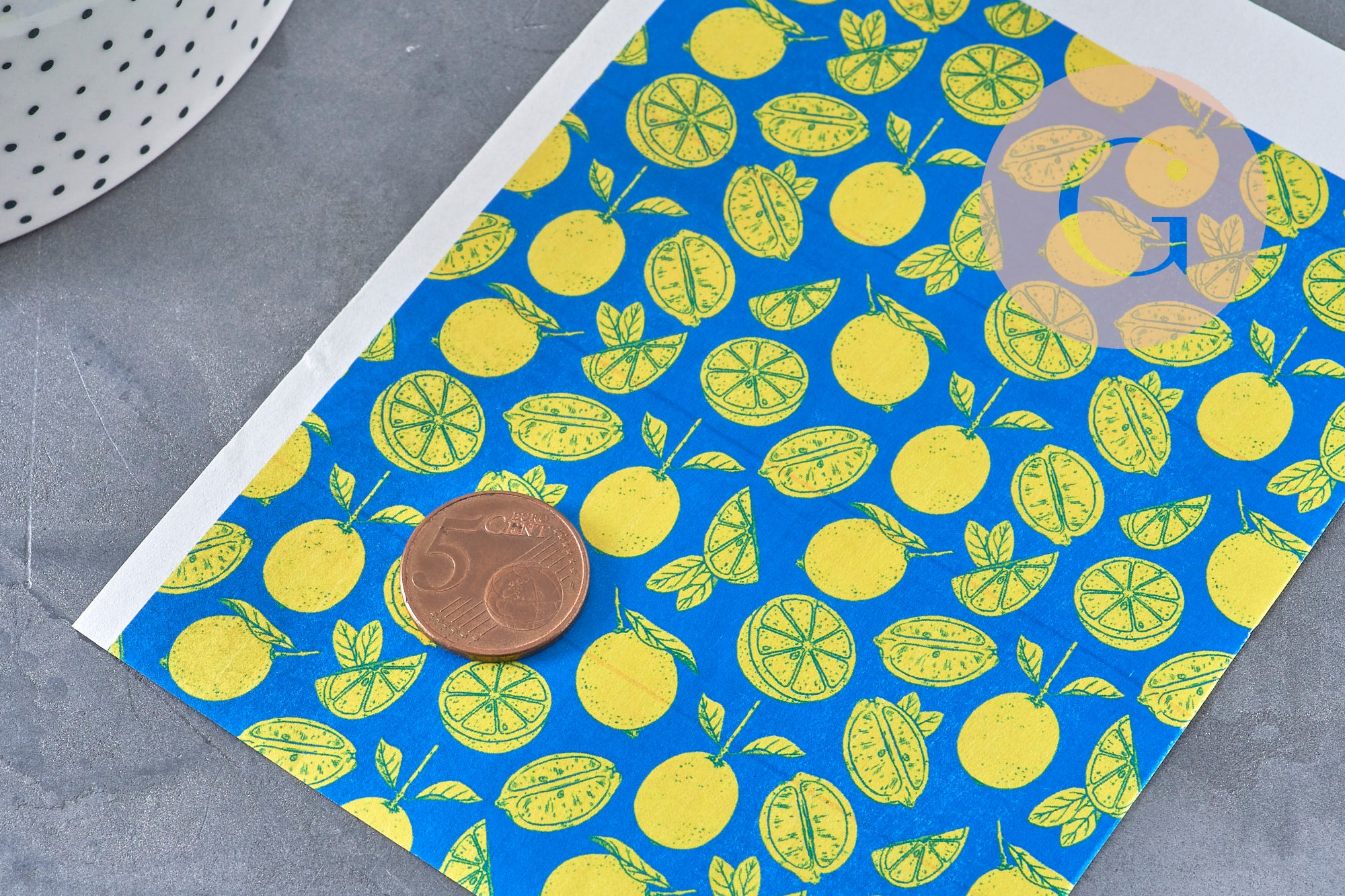 • Pattern: yellow lemons on a blue background