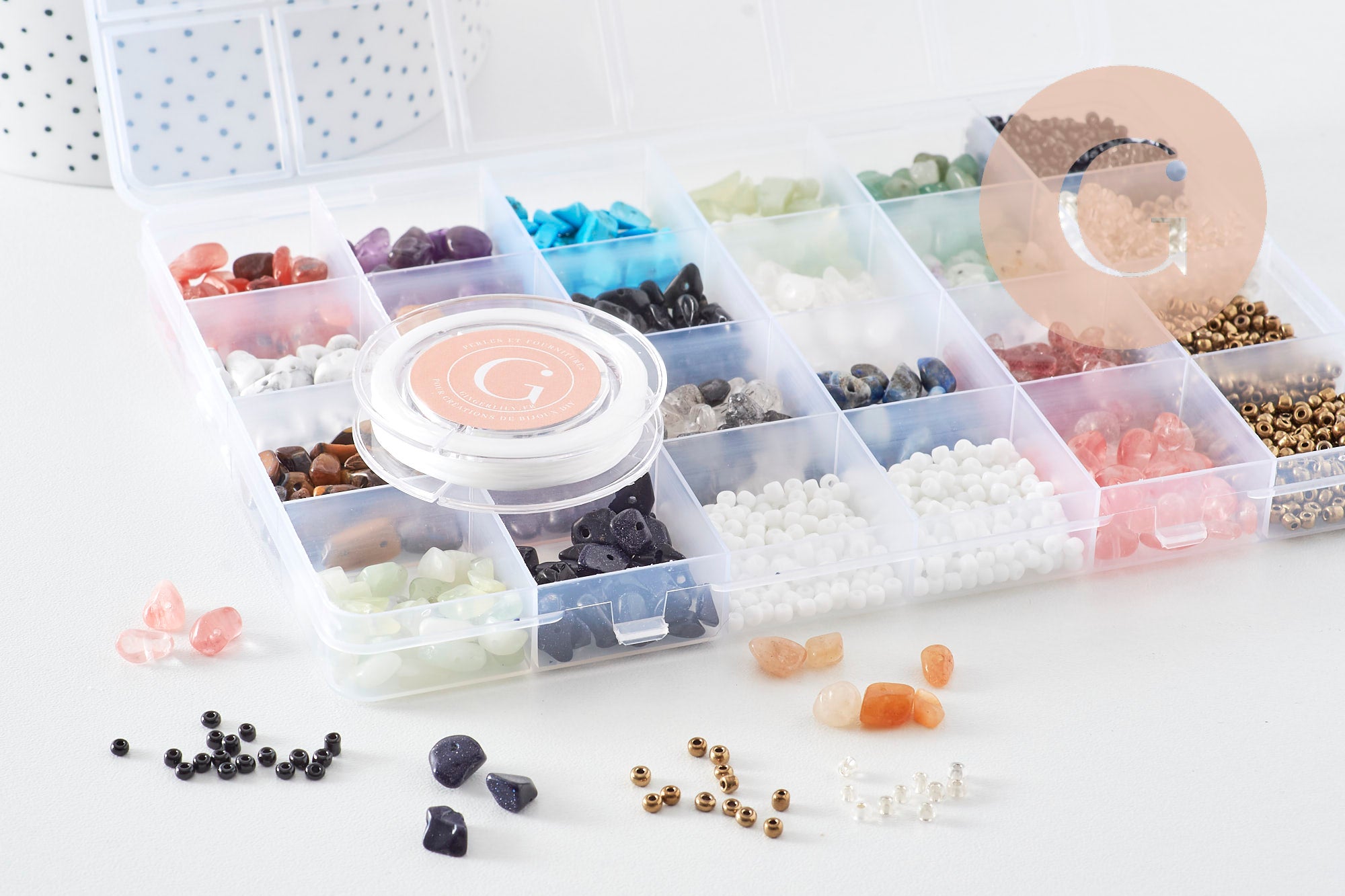 - 10 sets of gemstone beads: Dyed Howlite, Orange Agate, White Howlite, Rock Crystal, Yellow Quartz, Dyed Howlite, Tiger's Eye, Lapis Lazuli, Fluorite, Rose Quartz. Each set contains 10g of beads, approximately 30-45 beads.