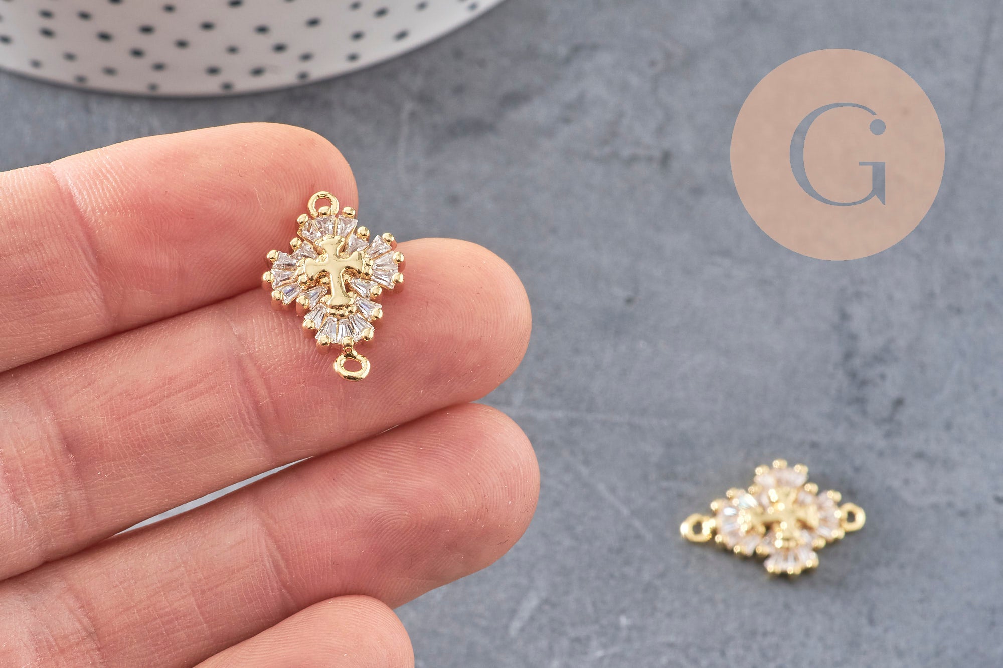 Adopt this ex-voto cross connector pendant in gold-plated brass, decorated with small shiny zircons, to create magnificent necklaces, earrings and bracelets.