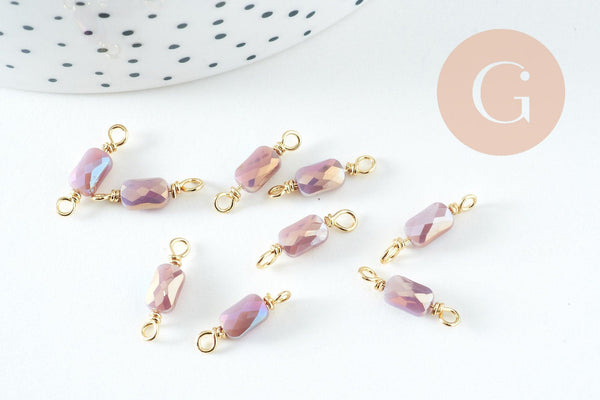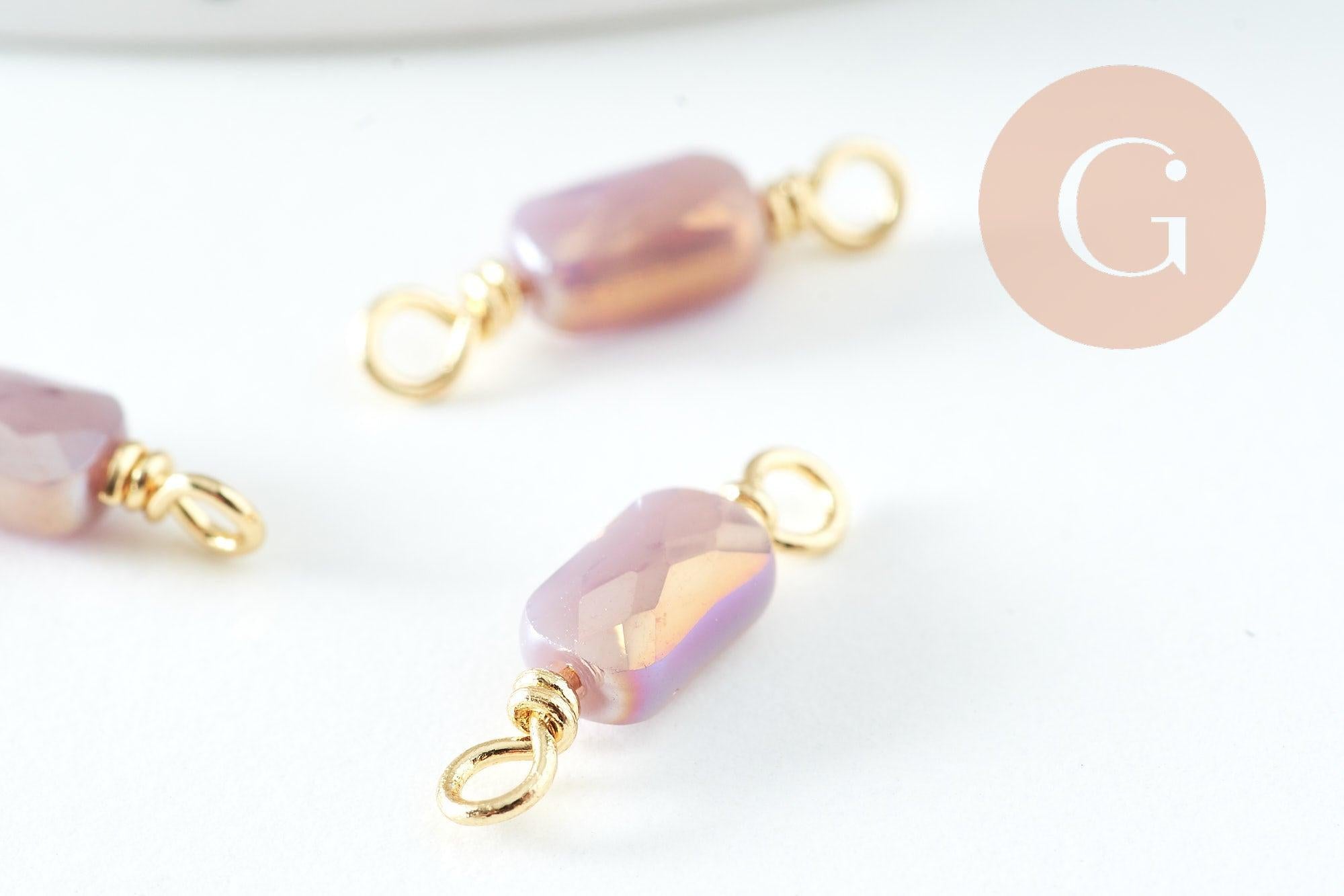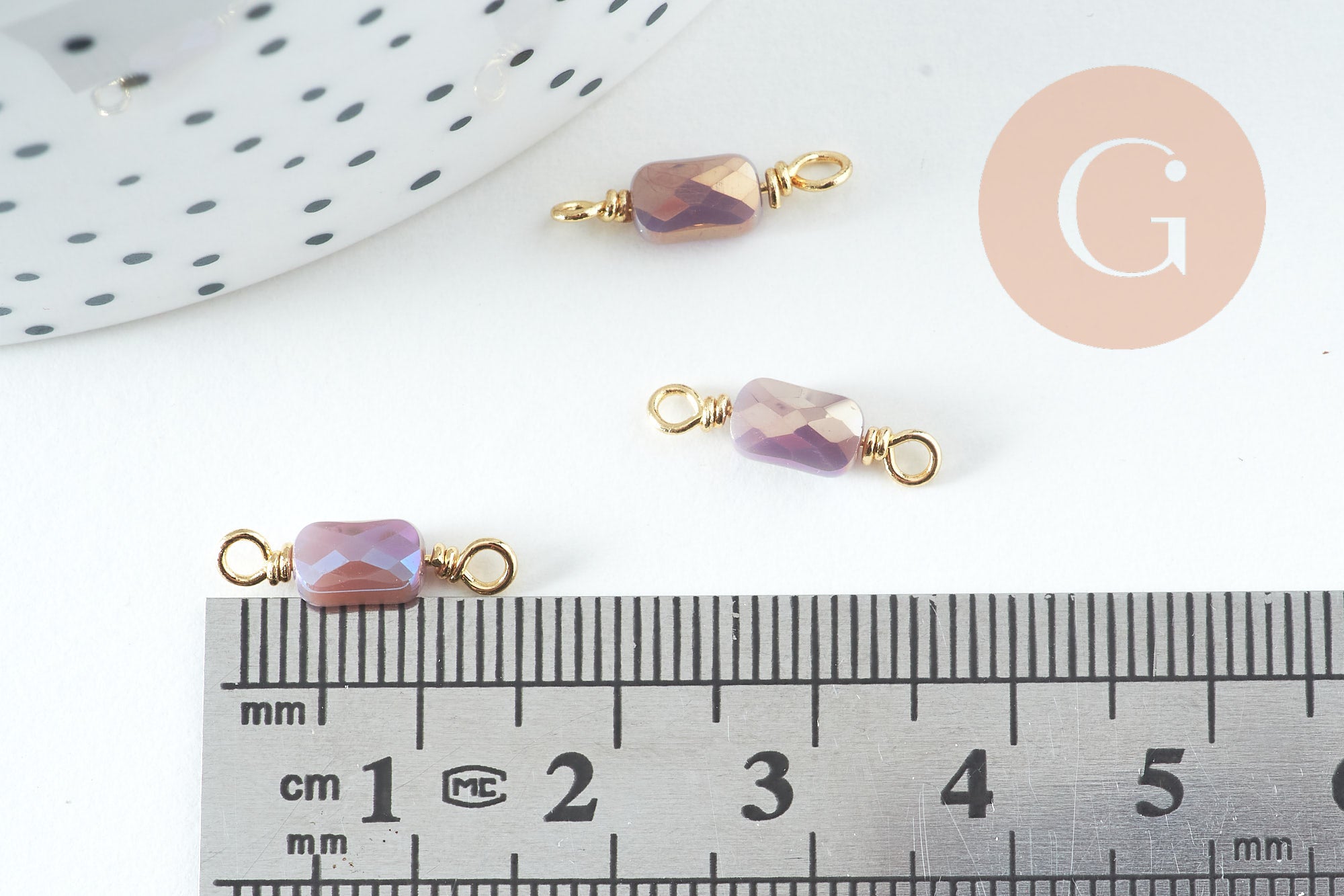 Add a touch of shimmering elegance to your DIY creations with this set of 5 rectangular connector pendants. Made of faceted glass with iridescent purple-blue reflections and 18K gold finish, these connectors illuminate necklaces, bracelets, and earrings with their changing reflections.