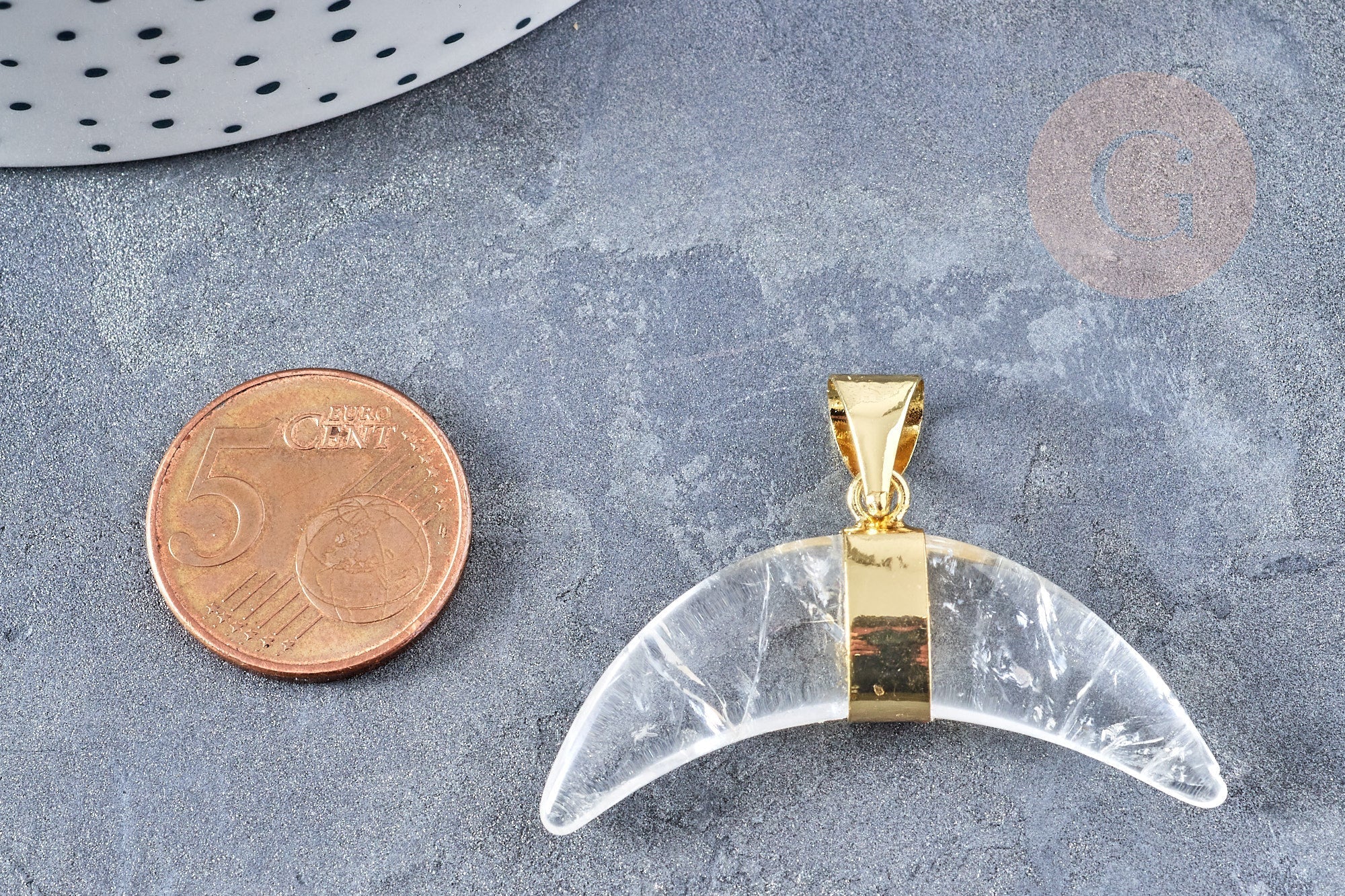 EP Crescent Moon Pendant Natural Rock Crystal Gold Brass Holder 42mm, Natural Stone x1 G8680