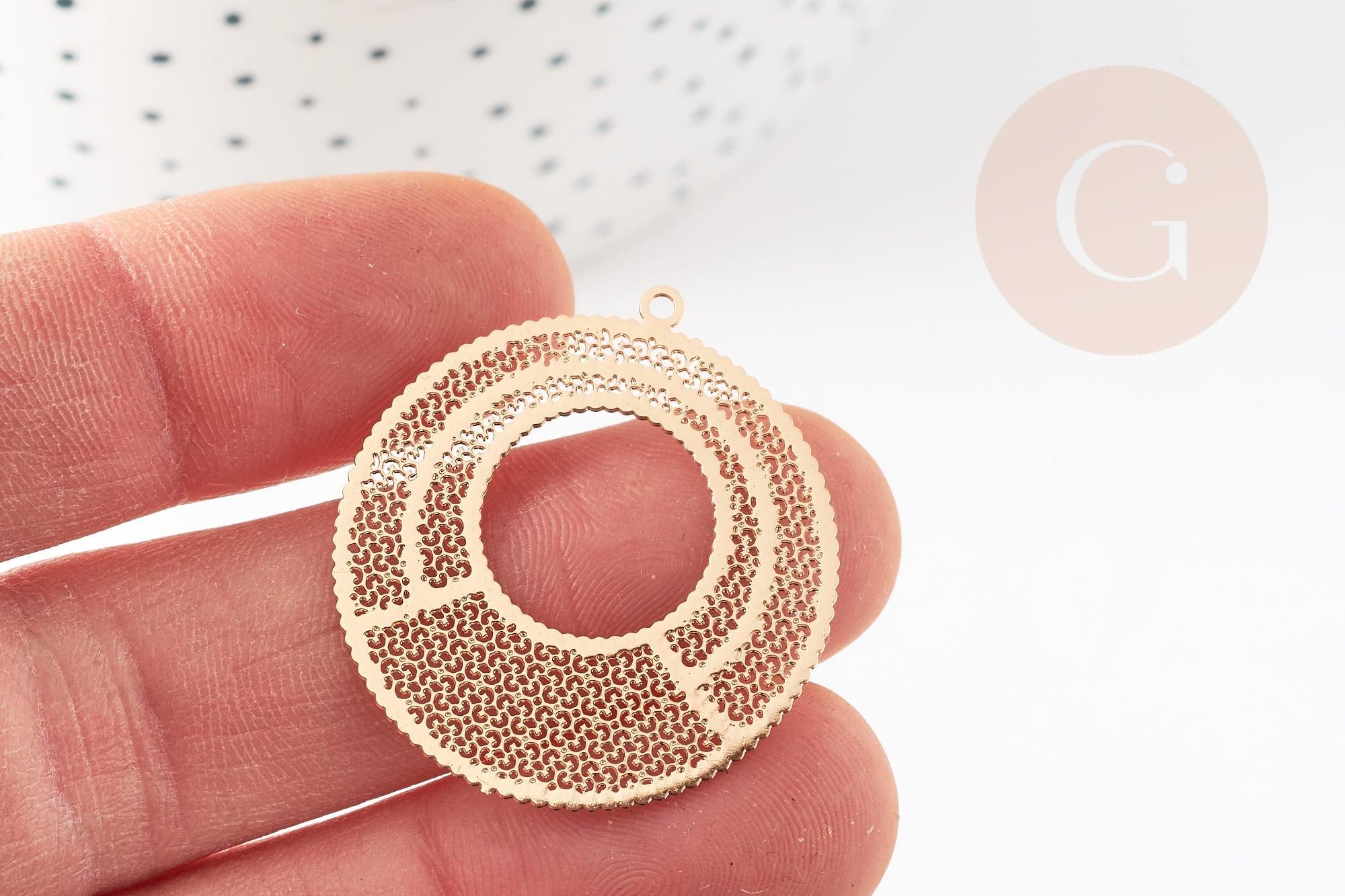 Discover our 33 mm round filigree lace print pendant in gold-plated brass . This pendant combines finesse, lightness and a delicate aesthetic to create unique and refined jewelry. This set includes two round print pendants in gold-plated brass.