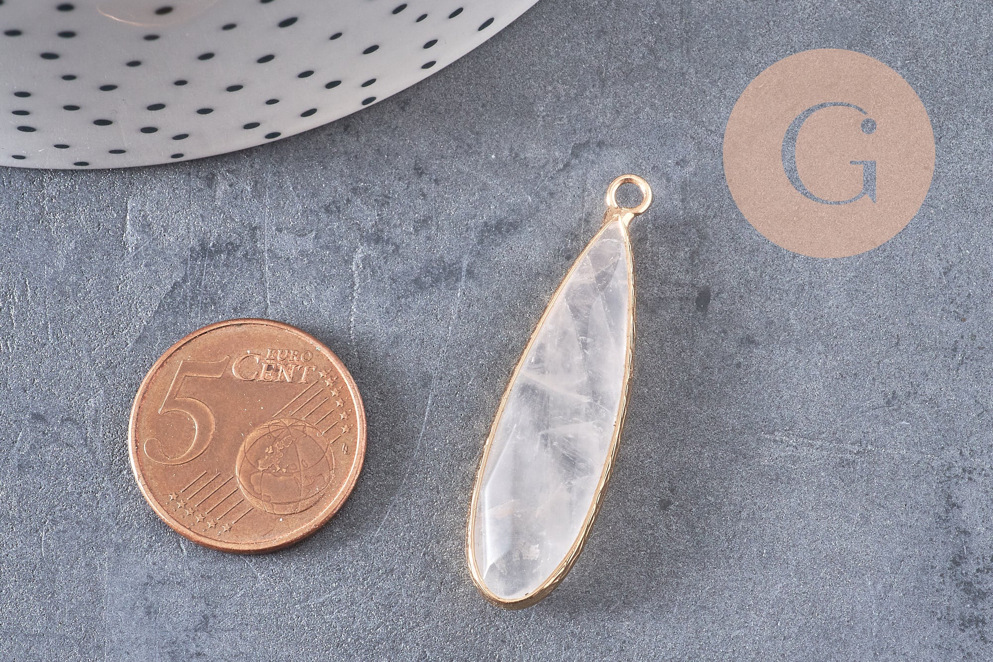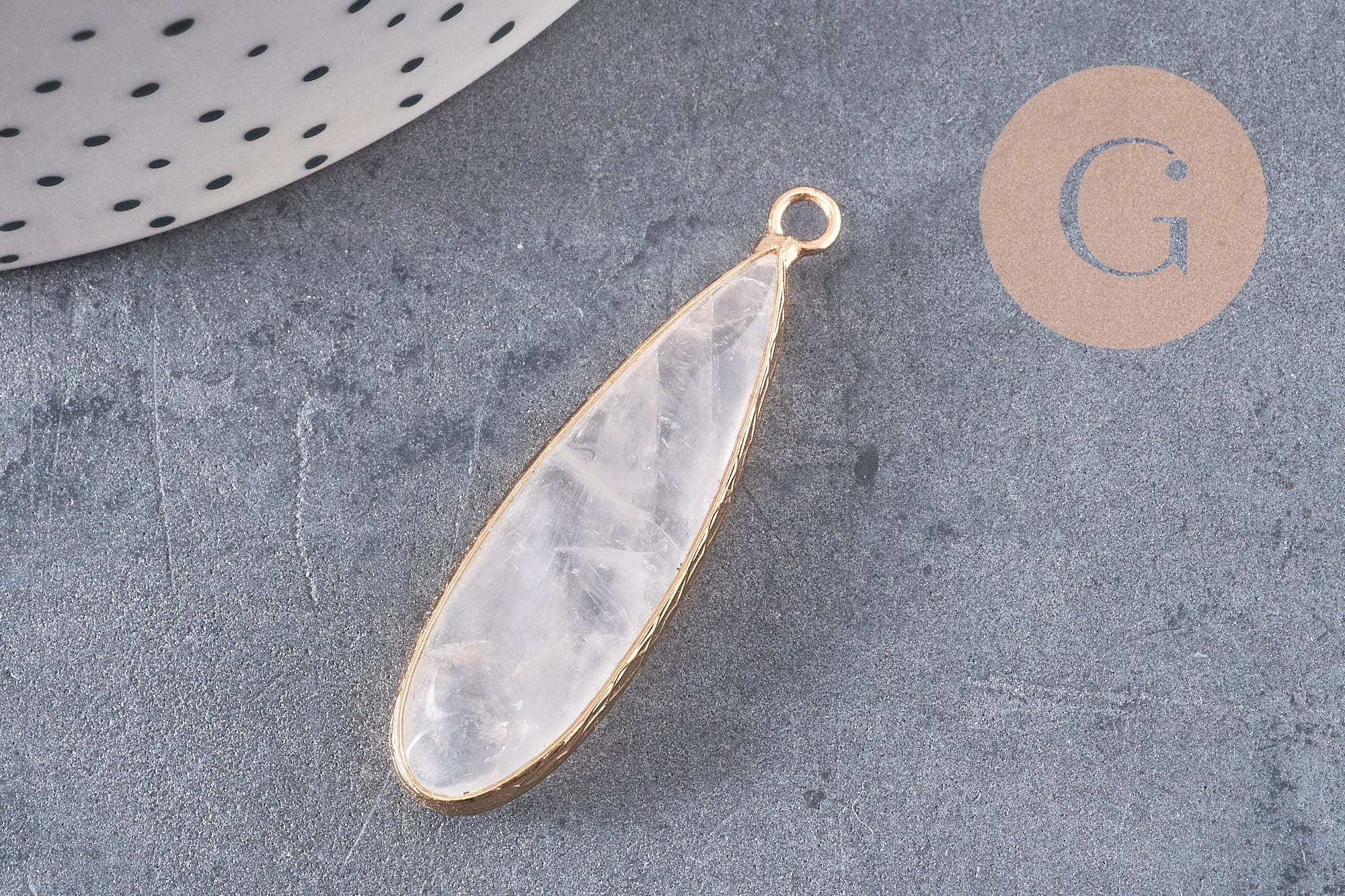 Let yourself be seduced by this superb natural rock crystal pendant cut into a drop shape and mounted on a gold-plated brass support. Its luminous transparency, natural inclusions and slender shape make it an exceptional piece for your elegant and timeless DIY jewelry creations.