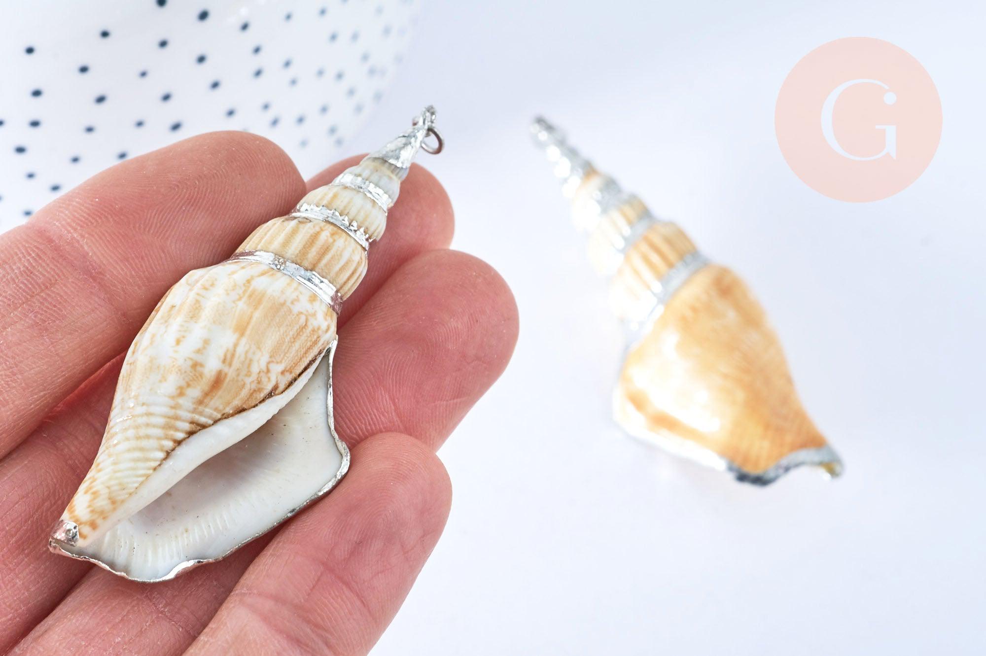 Pendentif grand coquillage naturel spirale beige argenté 58-66mm, pendentif création bijoux coquillage, x1 G7160