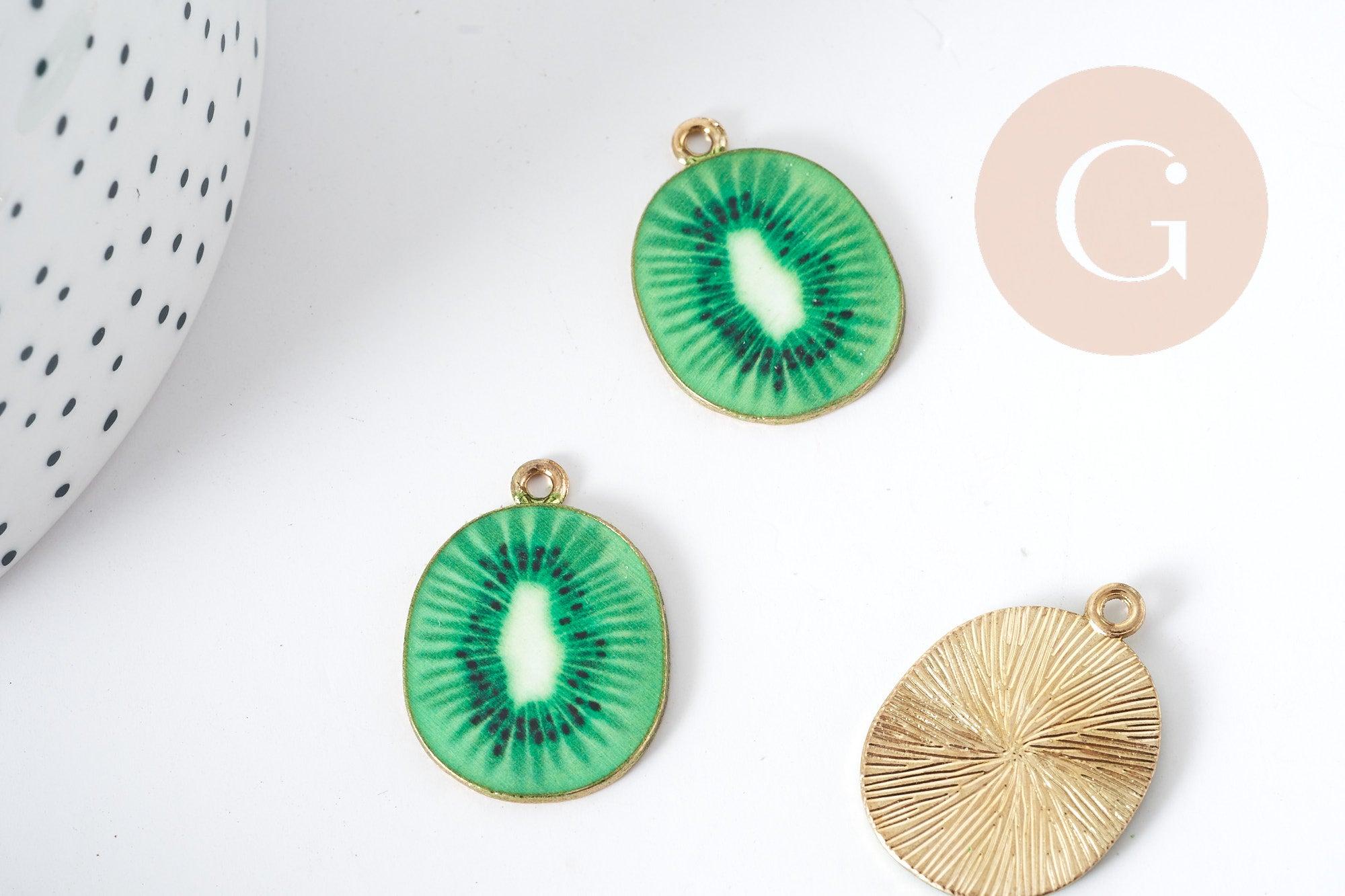 Kiwi pendant in gold-plated zamac with green enamel 26.5mm, fruit jewelry creation, x1 G9000