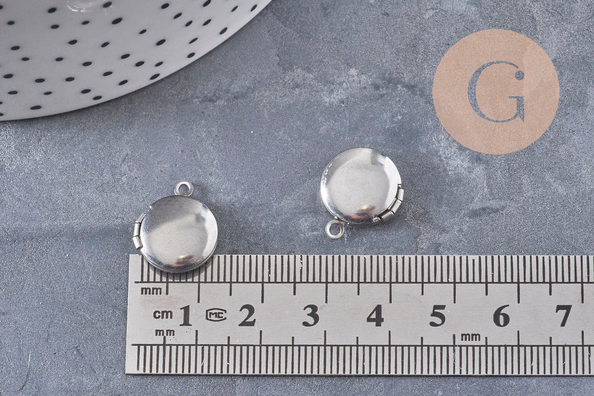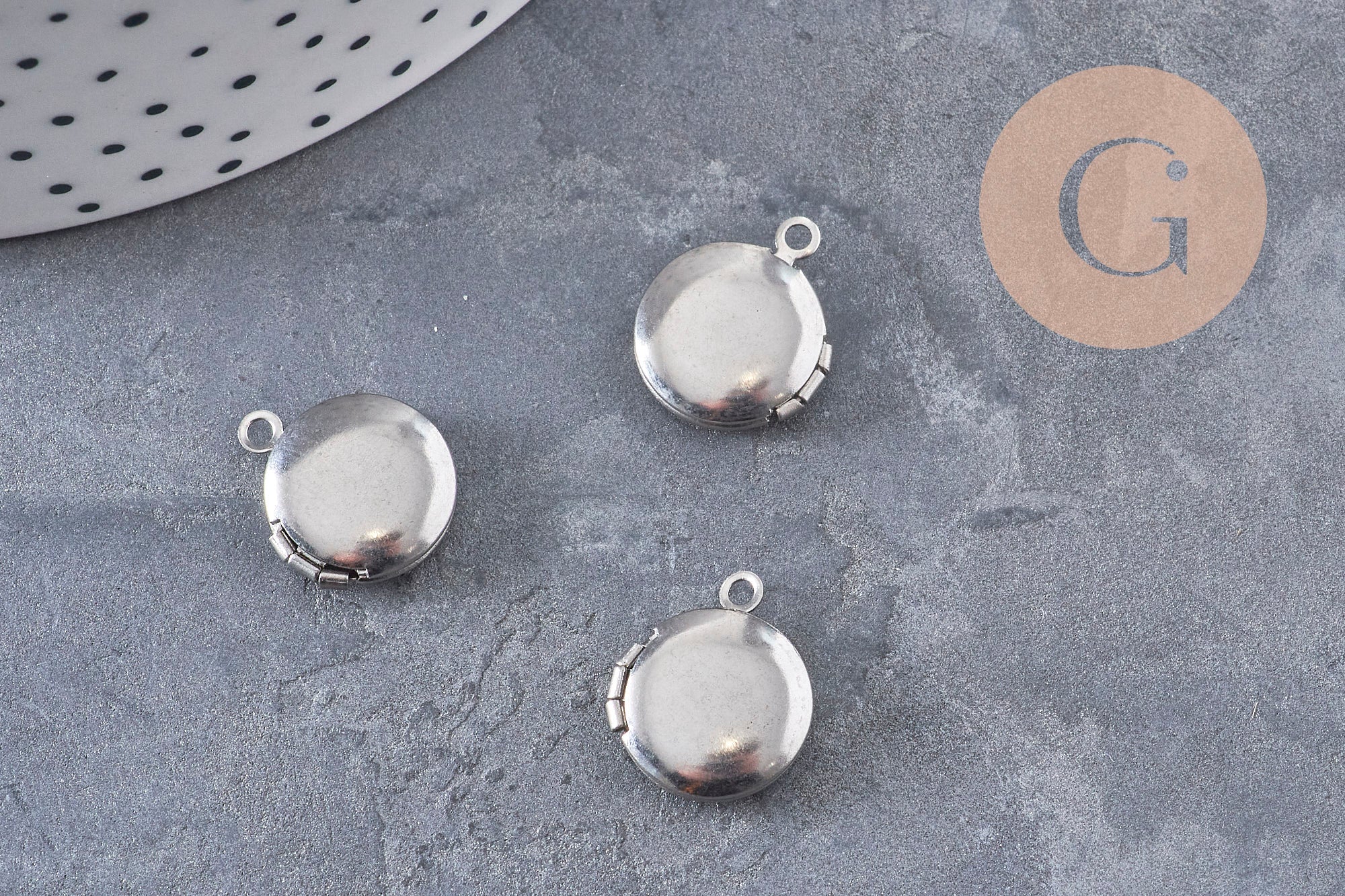 Add a sentimental, modern, and lasting touch to your creations with this round locket pendant in 316 stainless steel with a platinum finish. This locket opens to hold a personal item: a miniature photo, a message, dried flowers, resin-coated sequins, or a lucky charm. Thanks to its flat, polished, and timeless design, it can be worn alone or stacked for a trendy look.