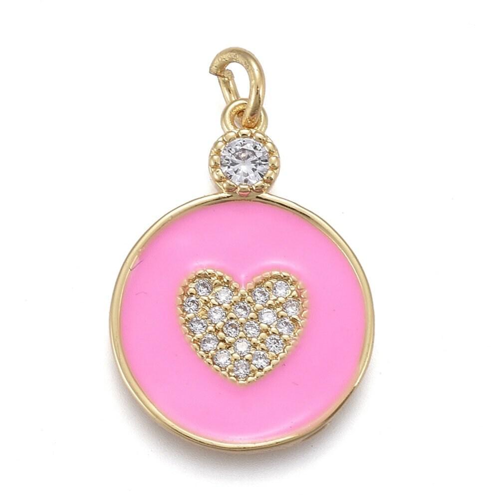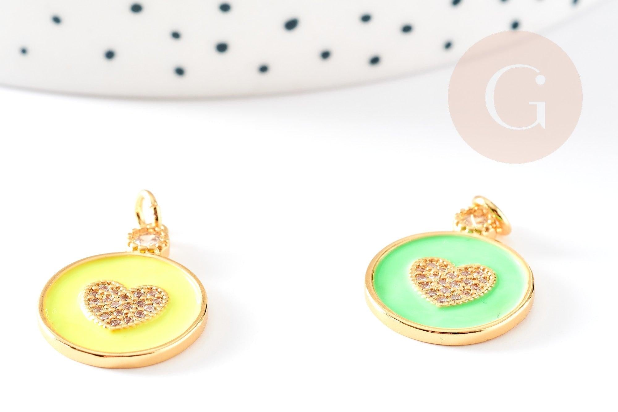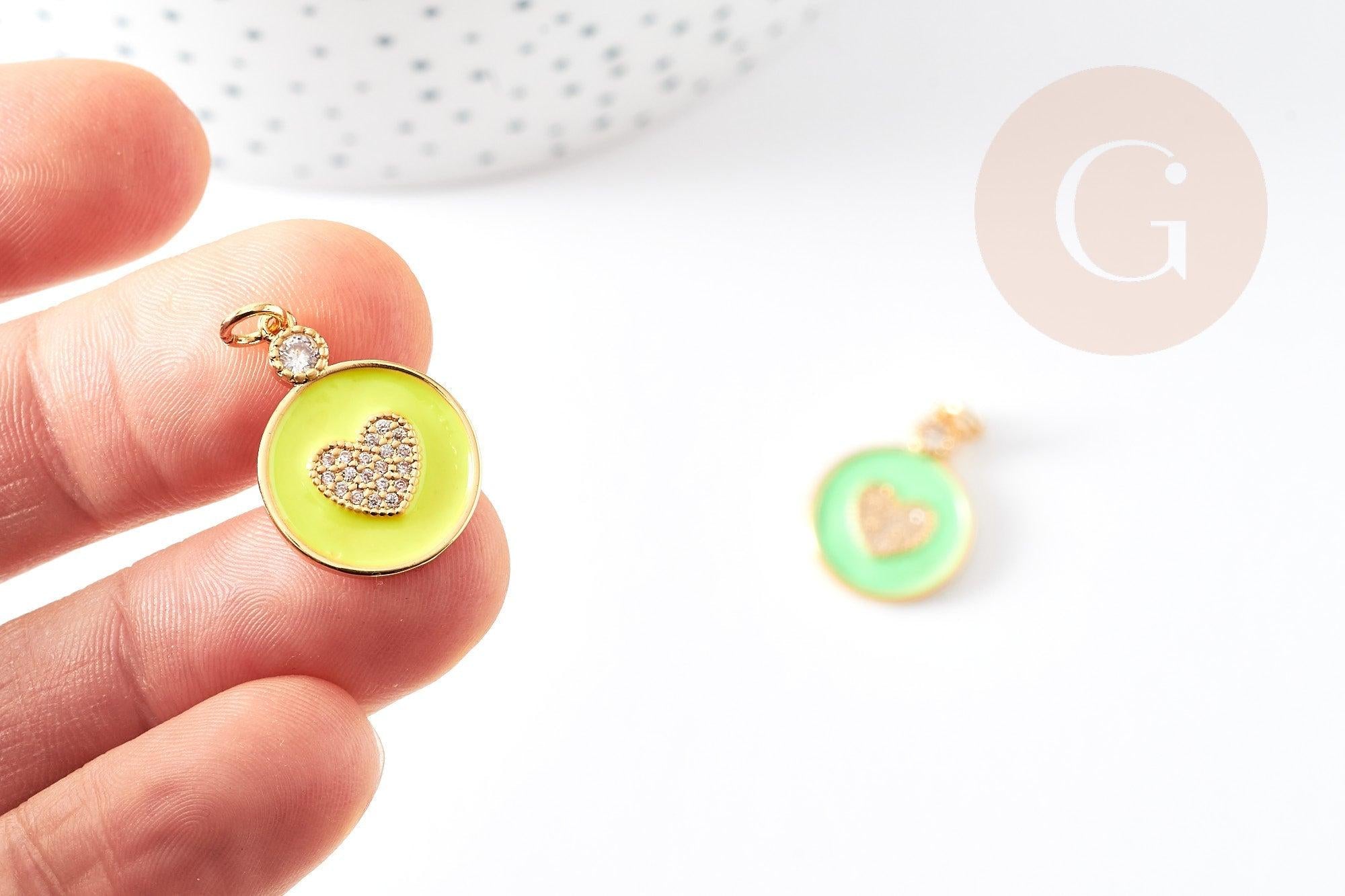 Round heart medallion pendant in gold-plated brass enamel and zircon, brass insect pendant, nickel-free, 22mm, each