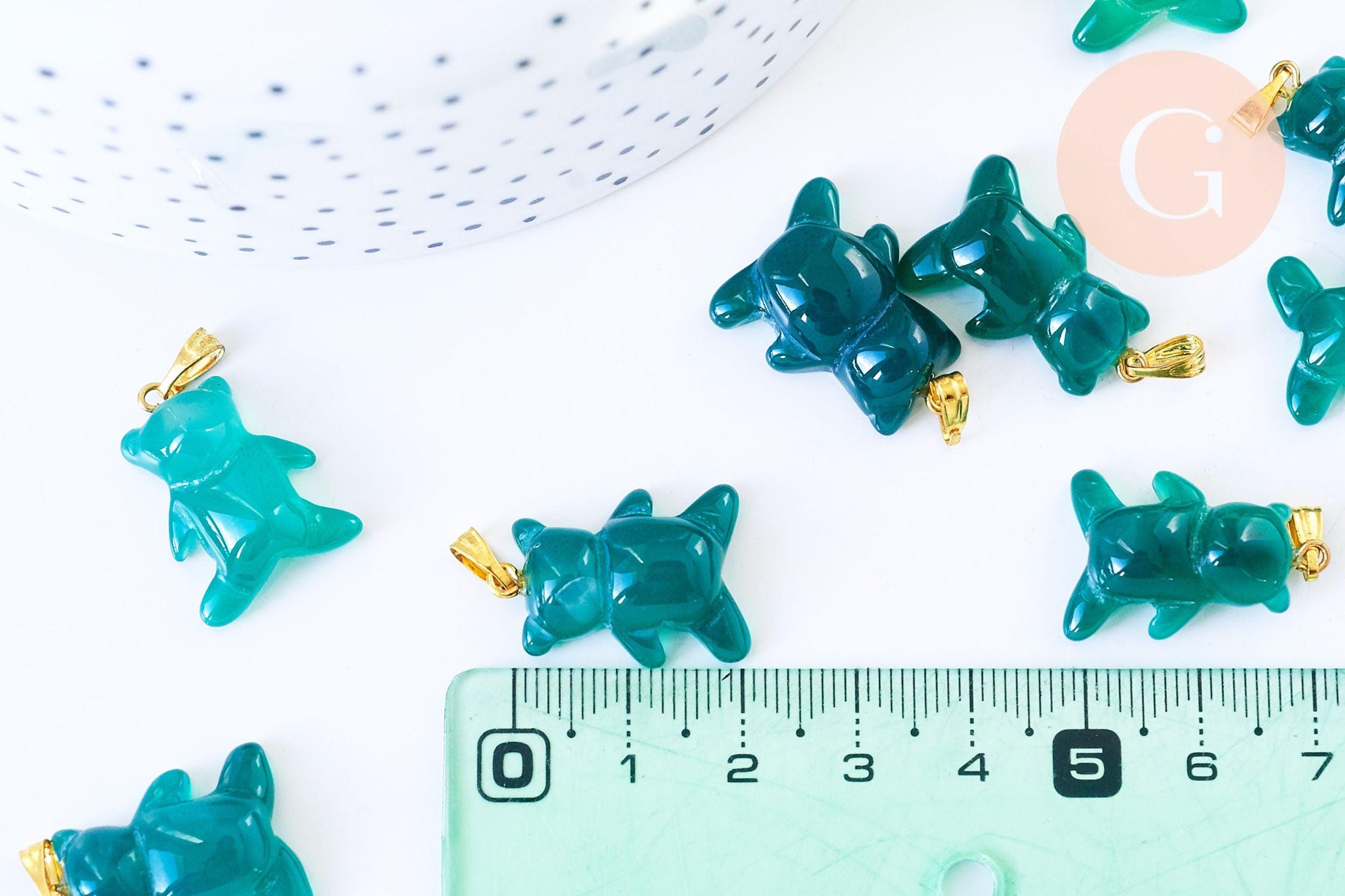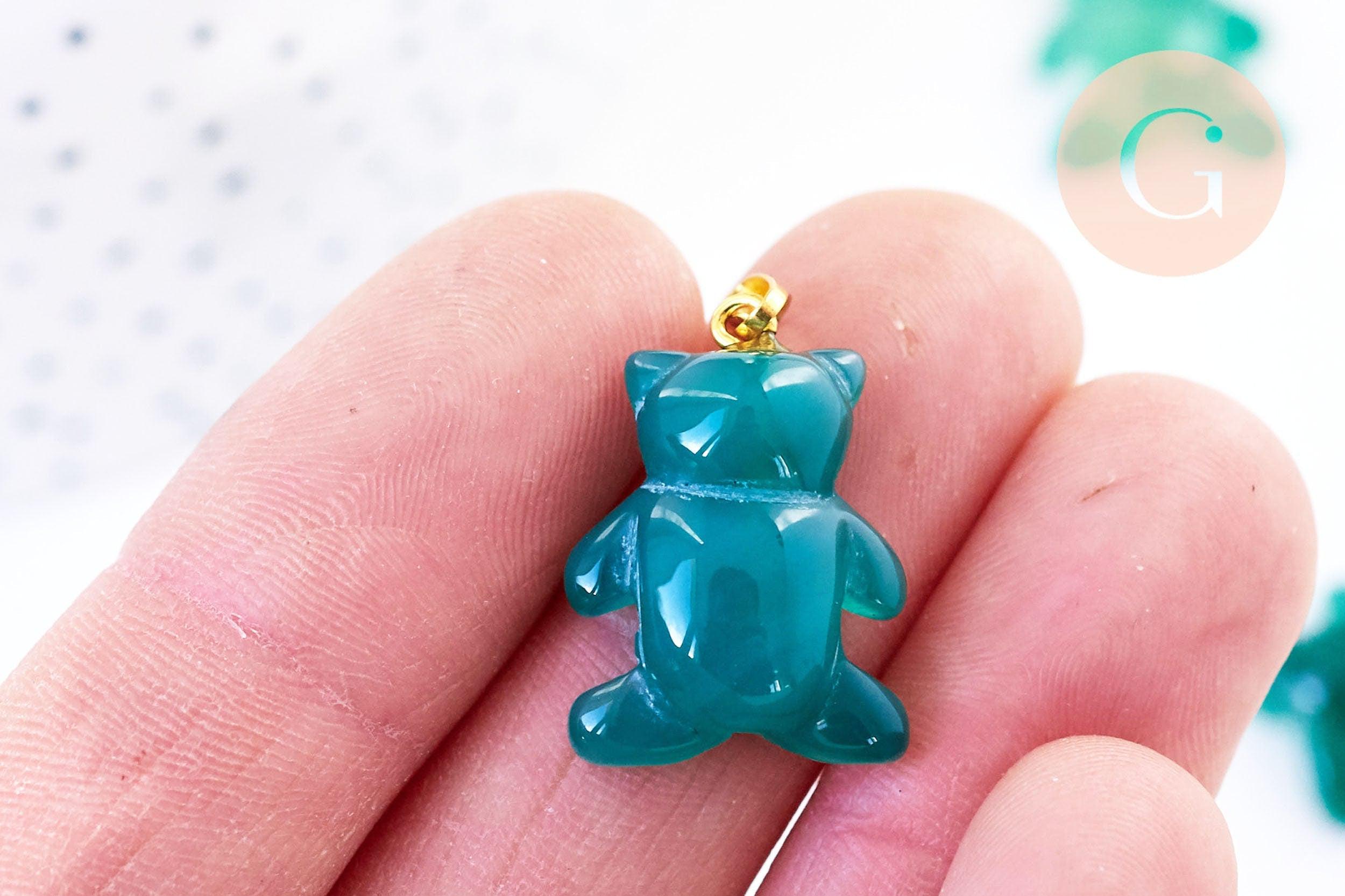 An adorable teddy bear pendant in green tinted agate and gold support to use in all your creations.