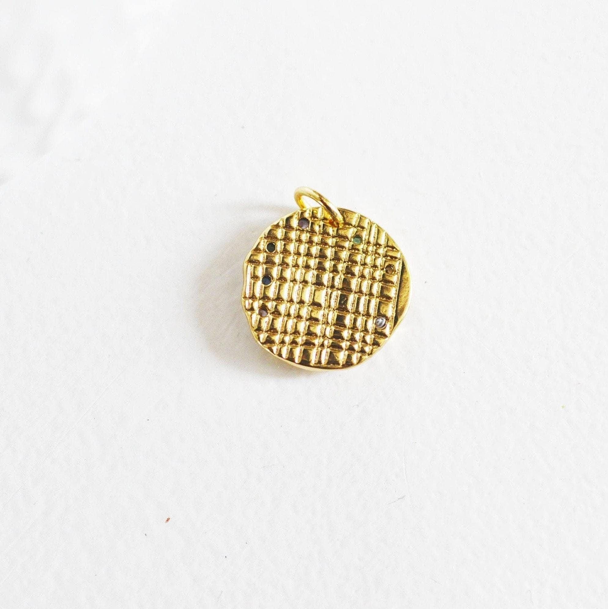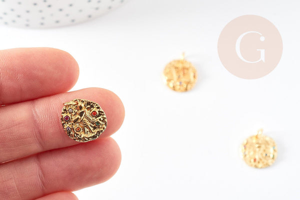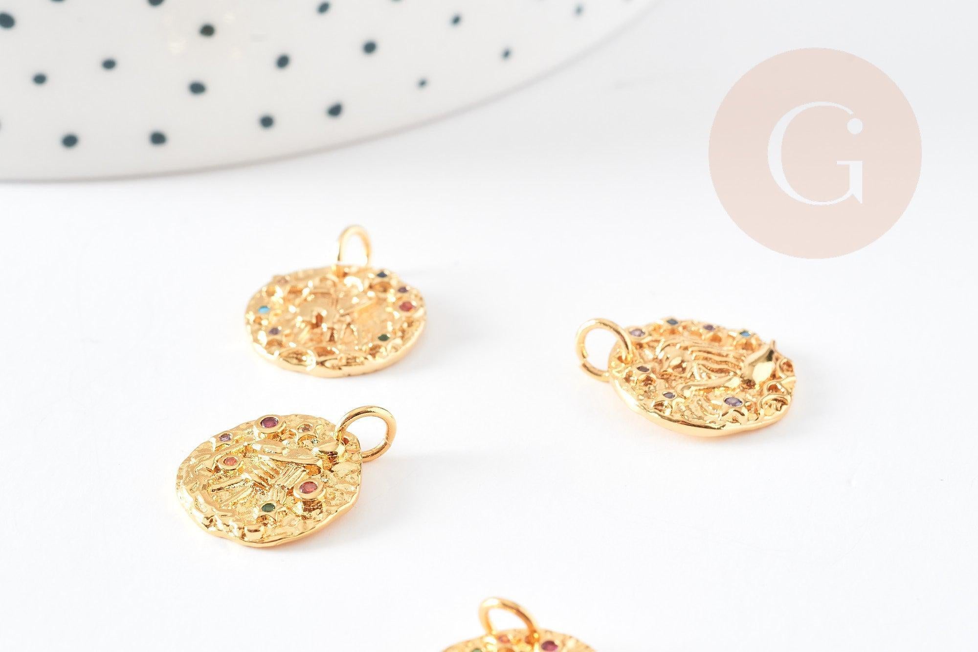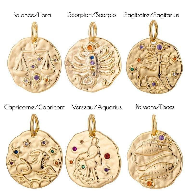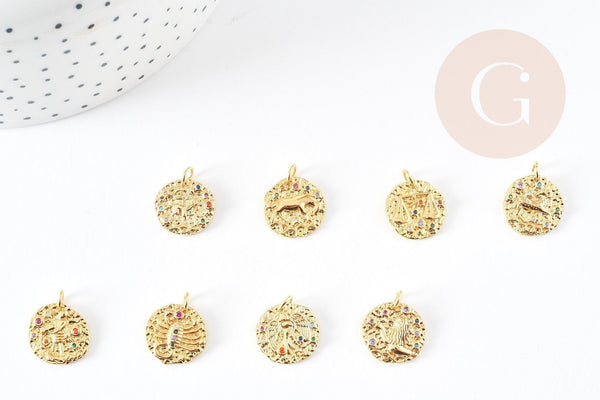 Fall for one of the round golden brass charms representing a astrological sign which will be the ideal element for the creation of several costume jewelry .
