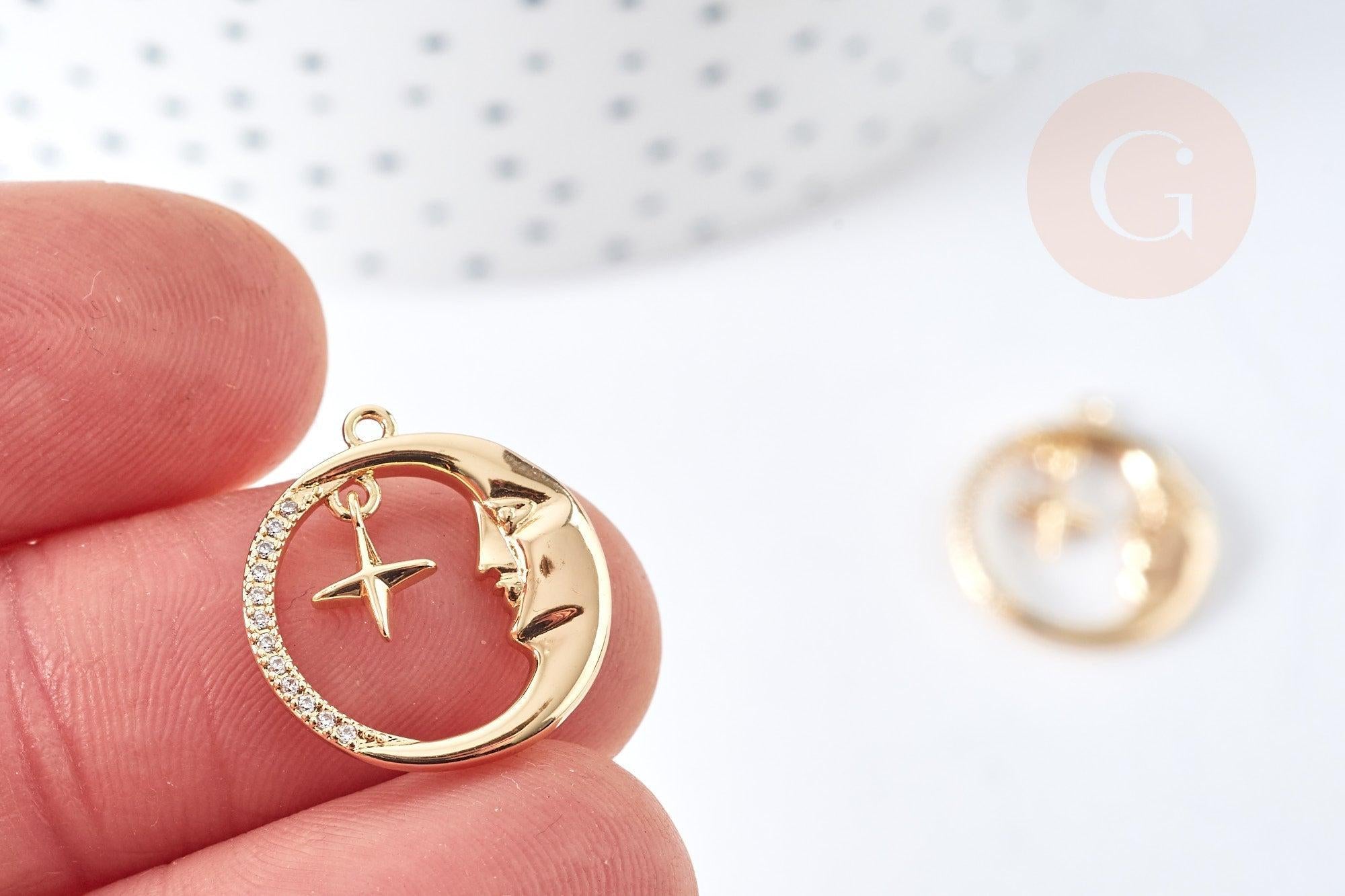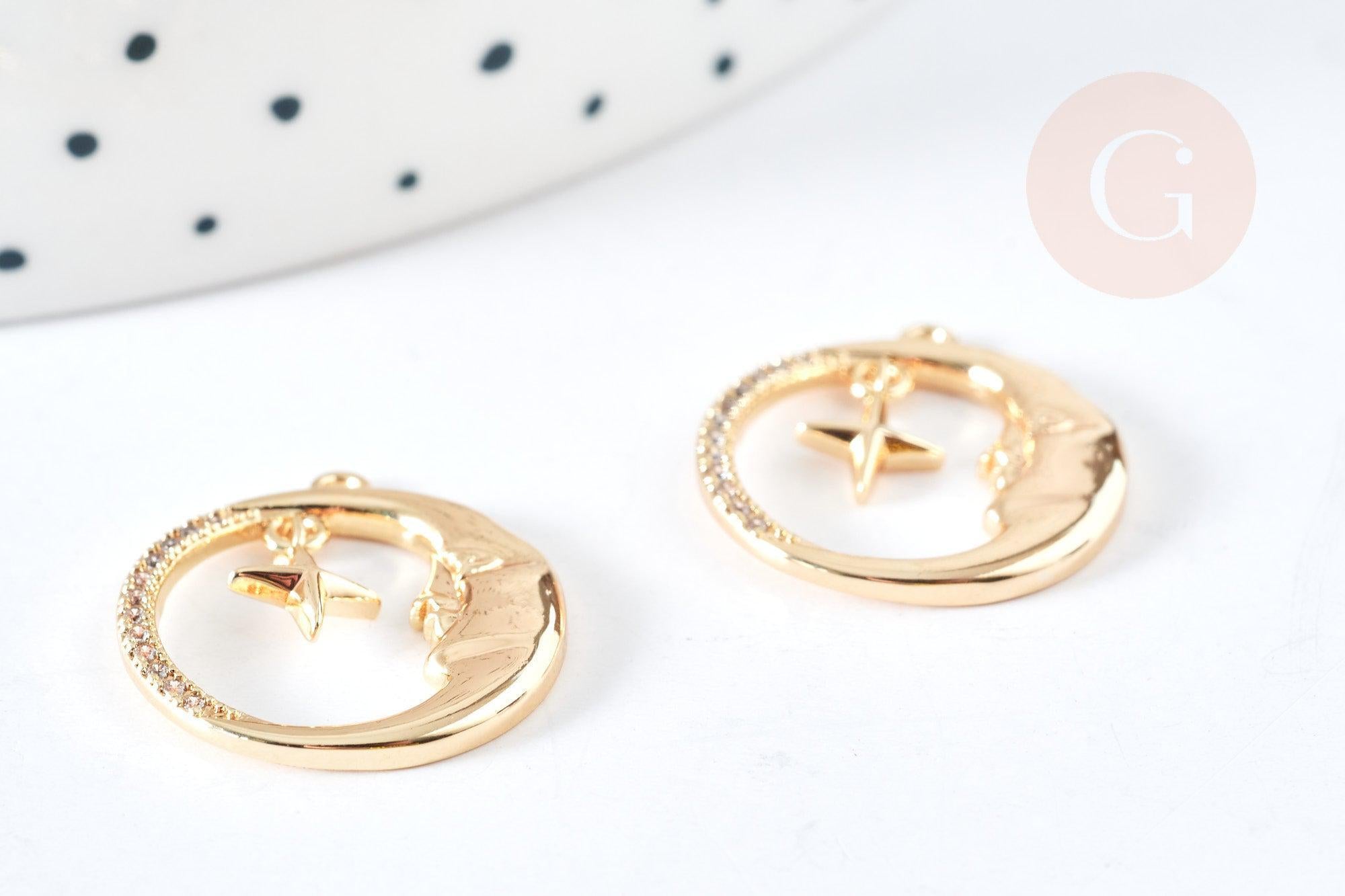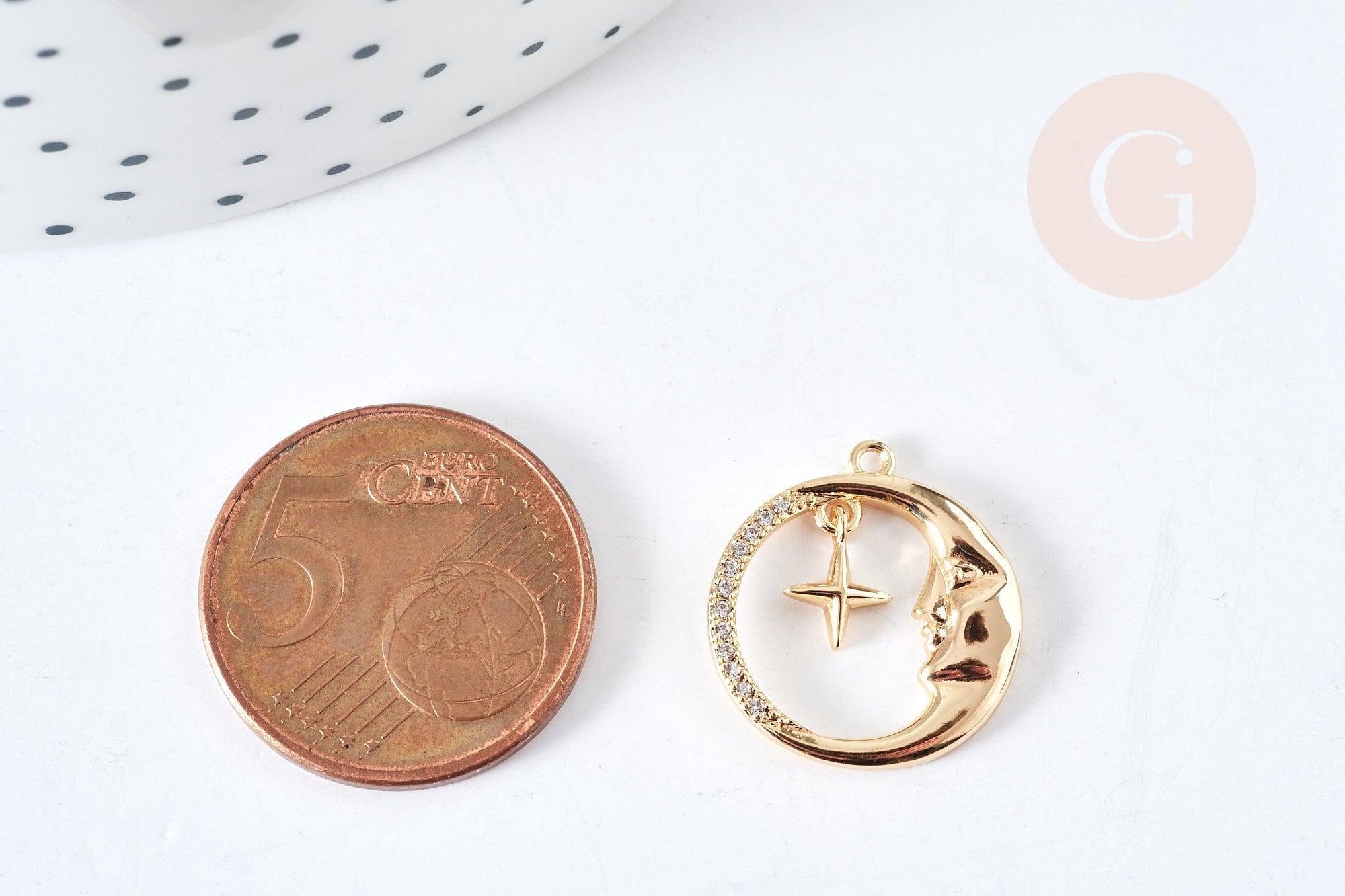 Pendentif rond croissant lune laiton doré zircons blancs 18.5mm, x1 (G8434)