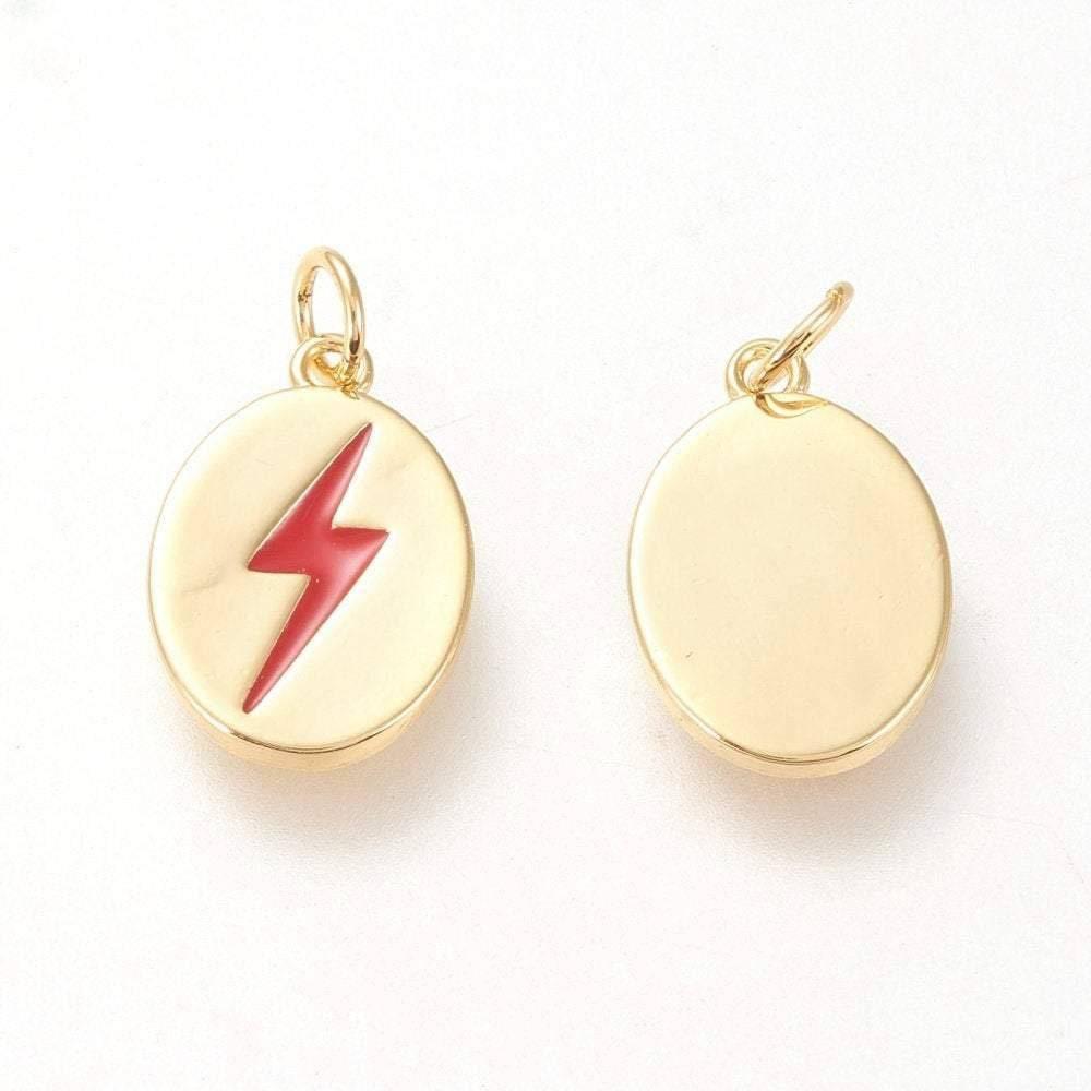 Round golden lightning bolt red enamel pendant, Women's pendant in gold metal for jewelry creation, 13.7mm, each