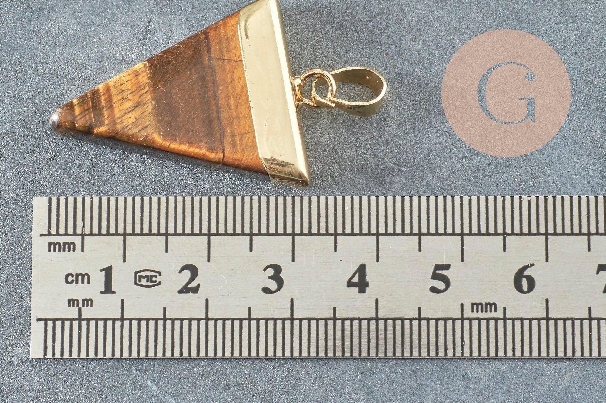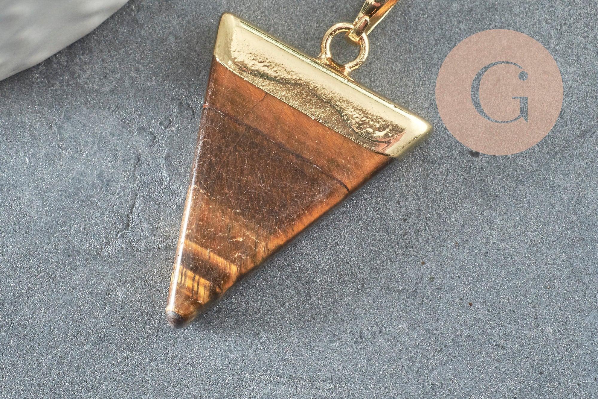 Fall in love with this stunning natural tiger's eye pendant, cut into a triangle and set in a gold-plated setting. The stone, with its distinctive brown and gold highlights, evokes strength, grounding, and protection. Perfect for adding a mystical yet elegant touch to your DIY jewelry.