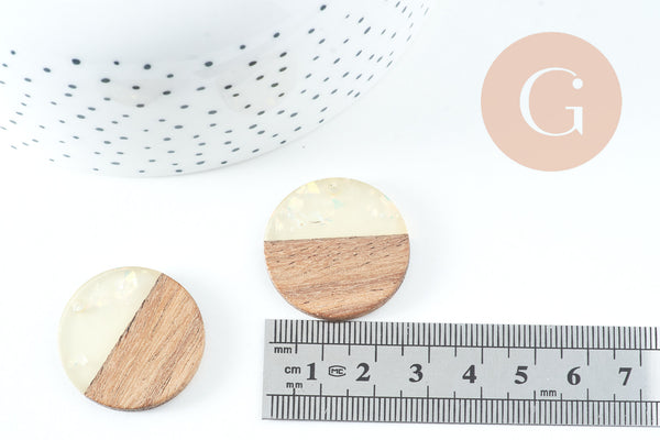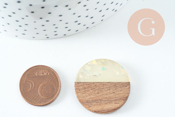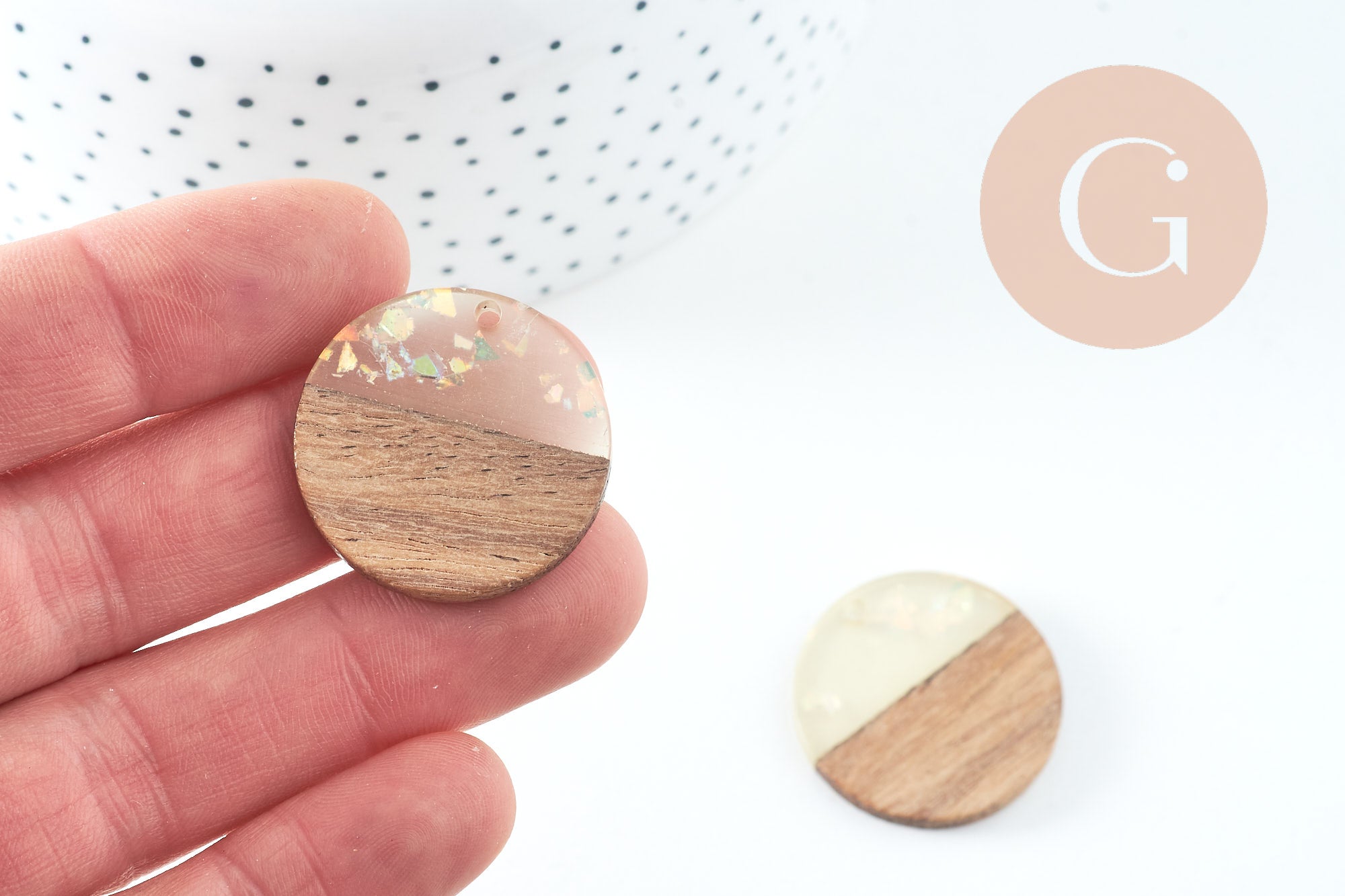 Disc-shaped beads with a very simple appearance, made of wood and resin decorated with iridescent glitter which can make very pretty pendants or complete earrings in an arty spirit.