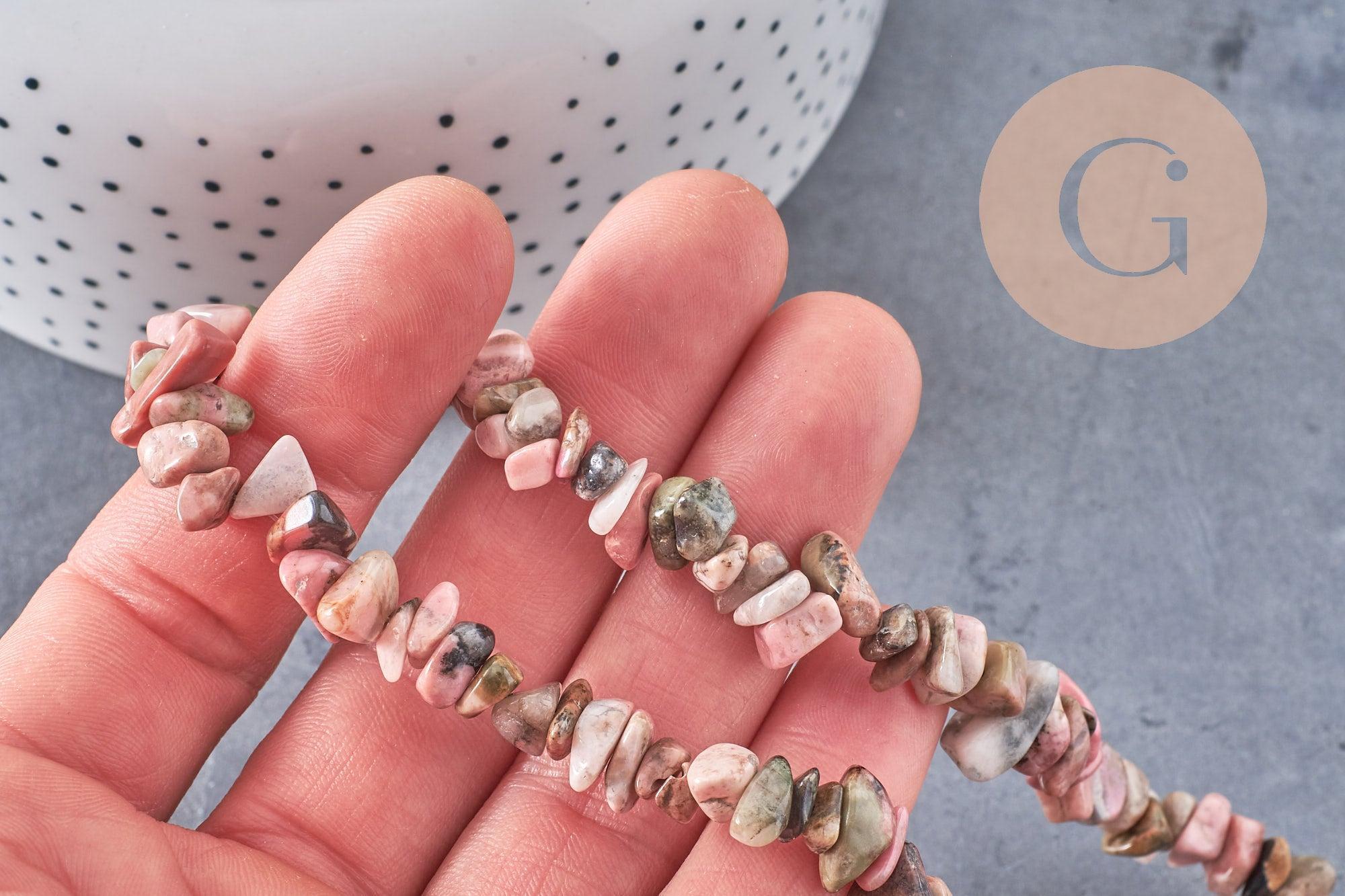 Fall in love with these natural rhodonite chip beads in a delicate pink hue interspersed with dark shades! Each bead, unique in its organic shape, adds character and authenticity to your creations.