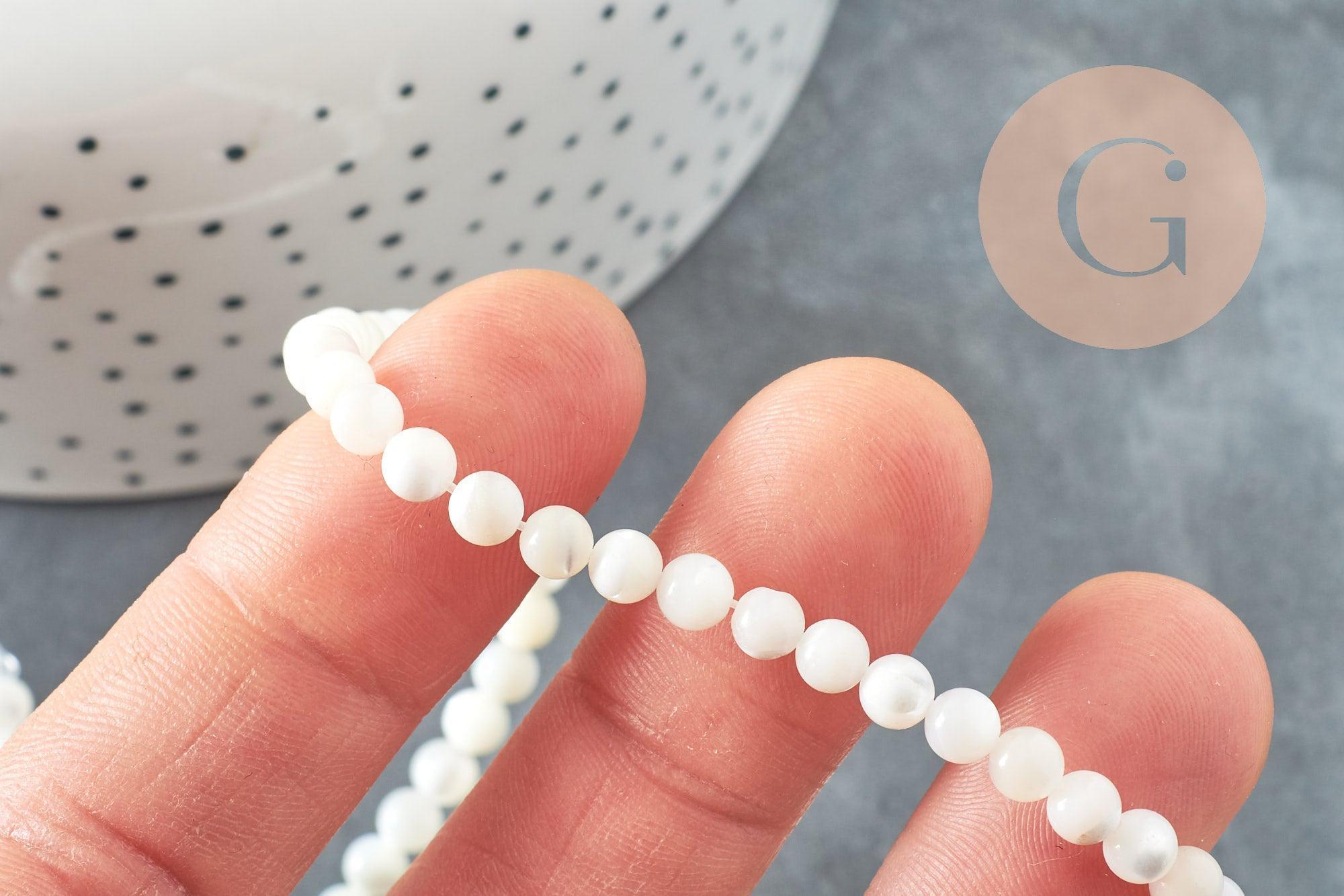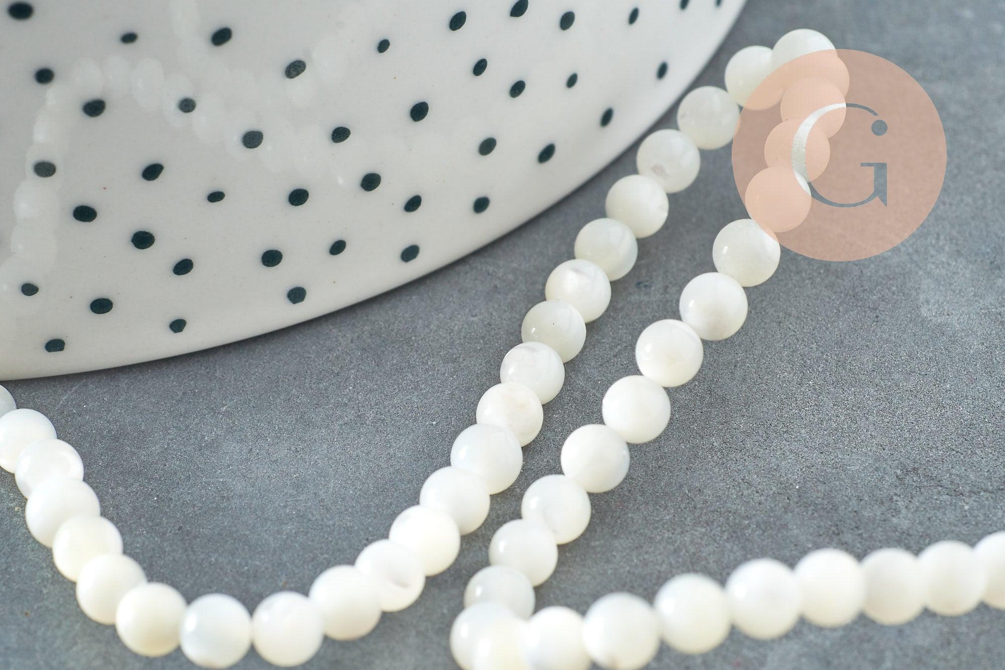Fall for the timeless elegance of this strand of round natural white mother-of-pearl beads , cut from real shells. Each bead delicately reflects the light and brings a touch of softness and refinement to your jewelry creations.