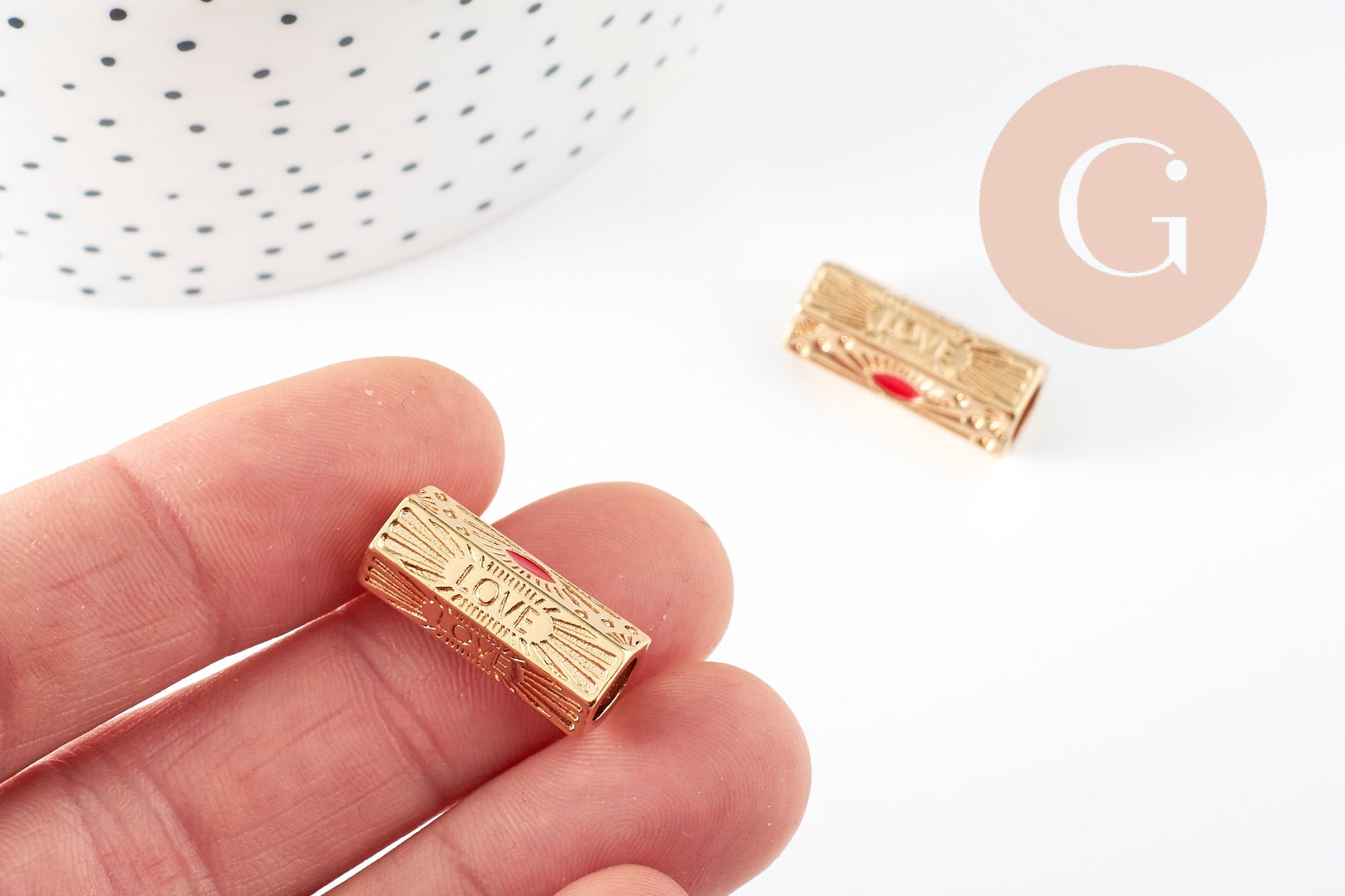 Perle tube talisman message LOVE doré couleur rouge 21mm, perle dorée bijoux amour, x1 G9409